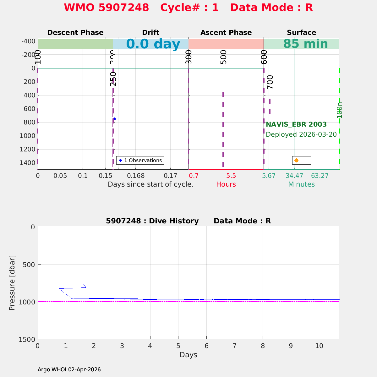 | WMO: #5907251 DAC: aoml PI: SUSAN WIJFFELS, DAVID NICHOLSON NAVIS_EBR: #2008 DRUCK_2900PSIA: #13268951 SBE41CP: #21669 MCOMS_FLBBCD: #570 OCR504_ICSW: #2663 SUNA_V2: #2529 SBE83_OPTODE: #0222 SEAFET: #726-30017 Altimeter Comparison (IFREMER) EuroArgo Link | n/a | n/a | ![]() |