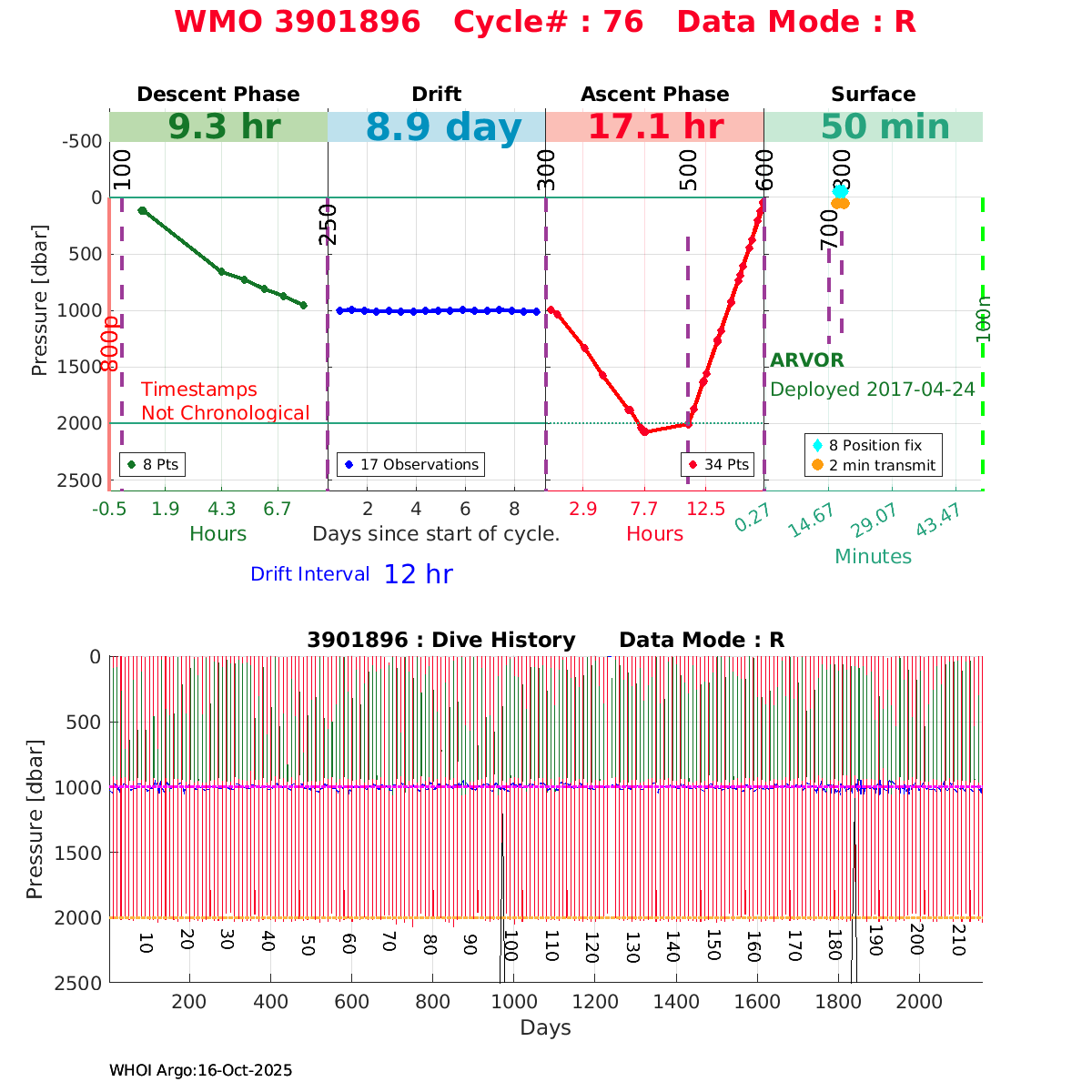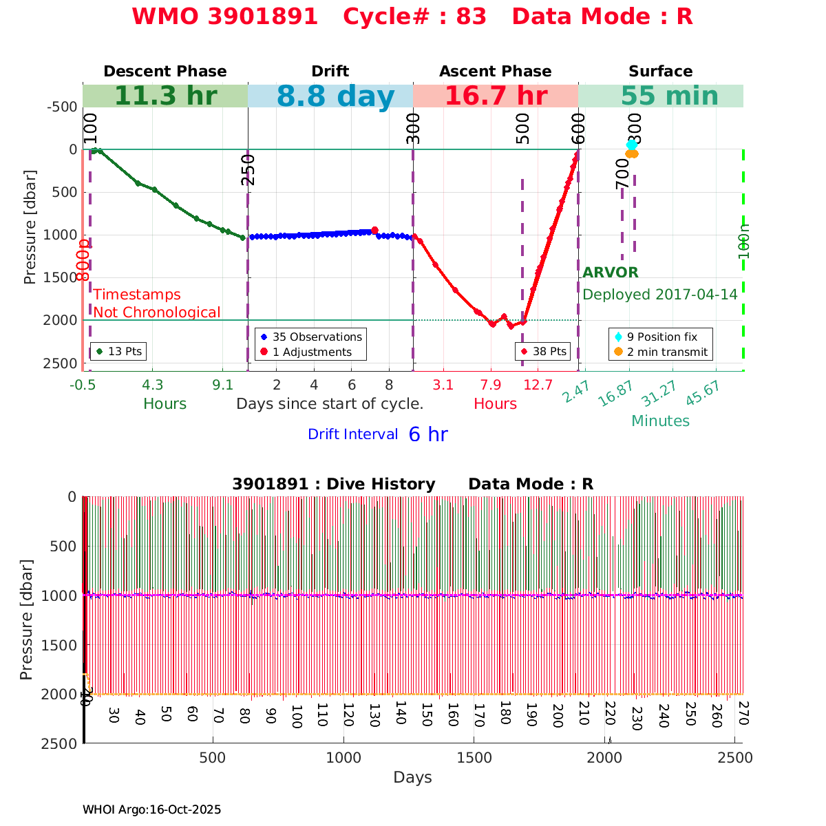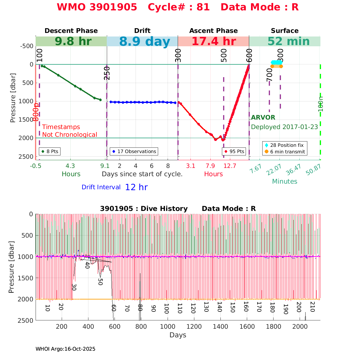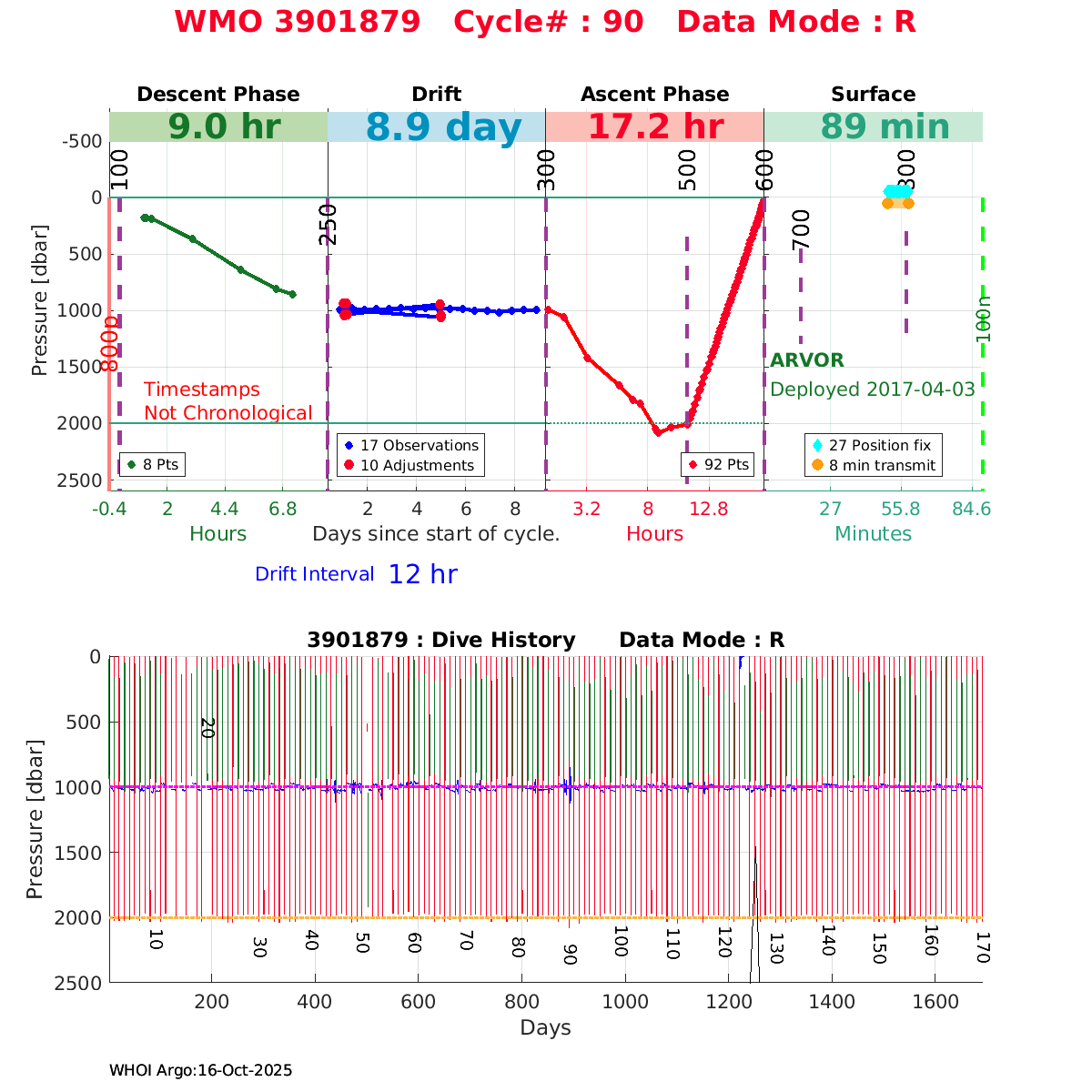 | WMO: #3901900 DAC: bodc PI: Pierre-Marie Poulain ARVOR: # FLOATCLOCK: # KISTLER_2900PSIA: #4924216 SBE41CP_V7.2.5: #8269 Altimeter Comparison (IFREMER) EuroArgo Link | ![]() |