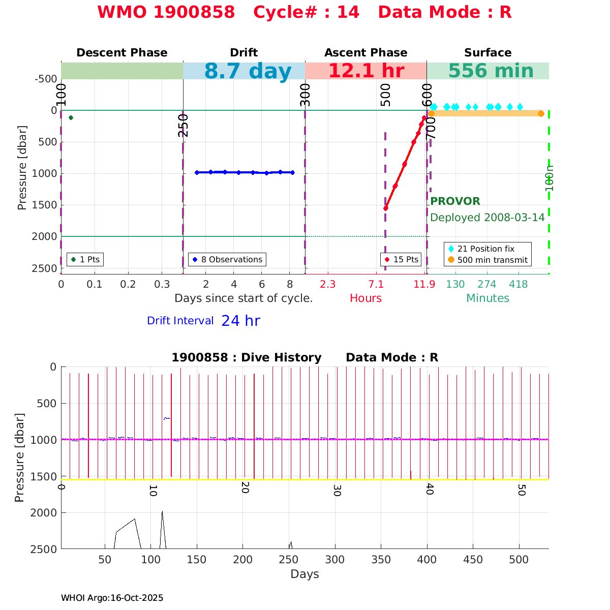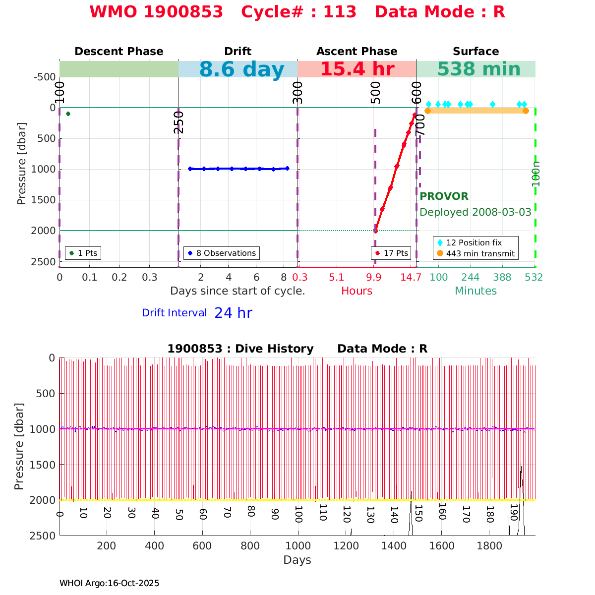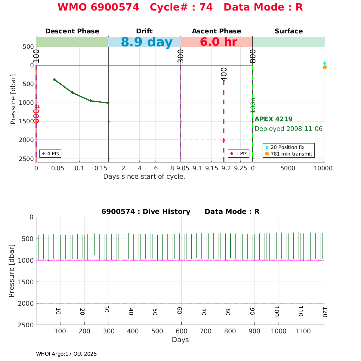 | WMO: #6900574 DAC: coriolis PI: Birgit KLEIN APEX: #4219 DRUCK_2900PSIA: #2711816 SBE41: #4218 Altimeter Comparison (IFREMER) EuroArgo Link | ![]() |