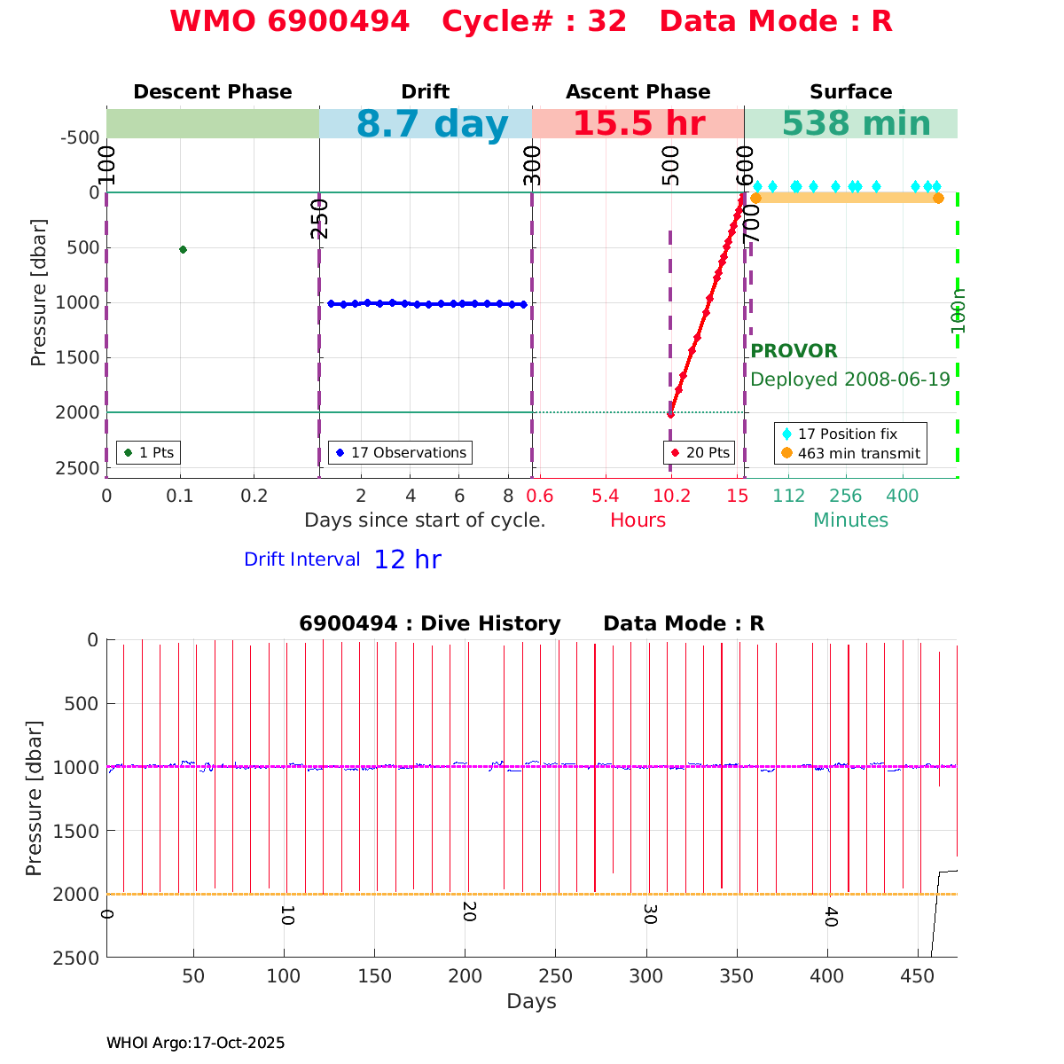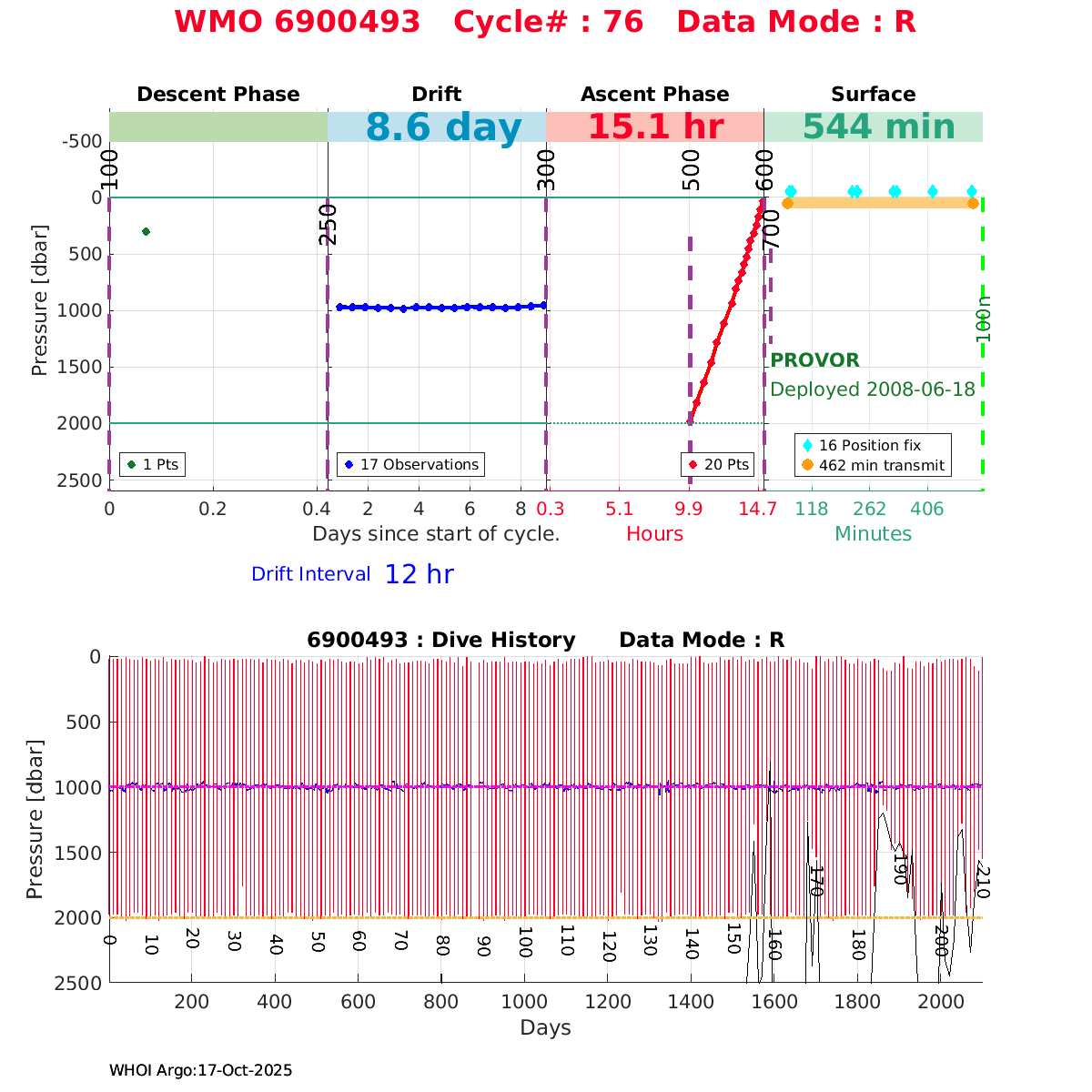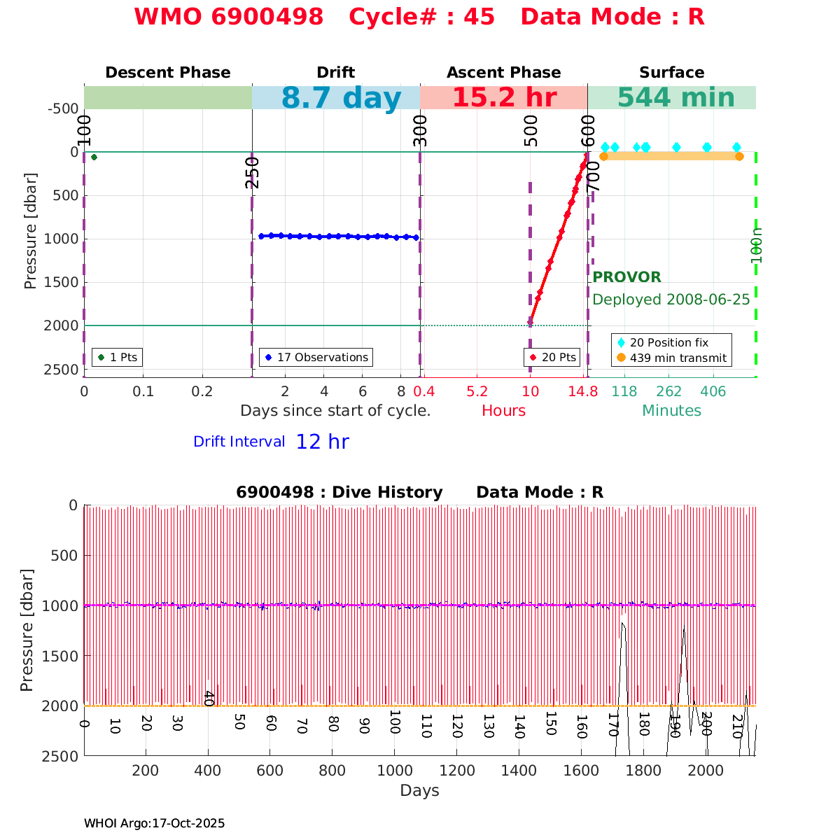 | WMO: #6900566 DAC: coriolis PI: Birgit KLEIN APEX: #4277 DRUCK_2900PSIA: #2724796 SBE41: #4267 Altimeter Comparison (IFREMER) EuroArgo Link | ![]() |