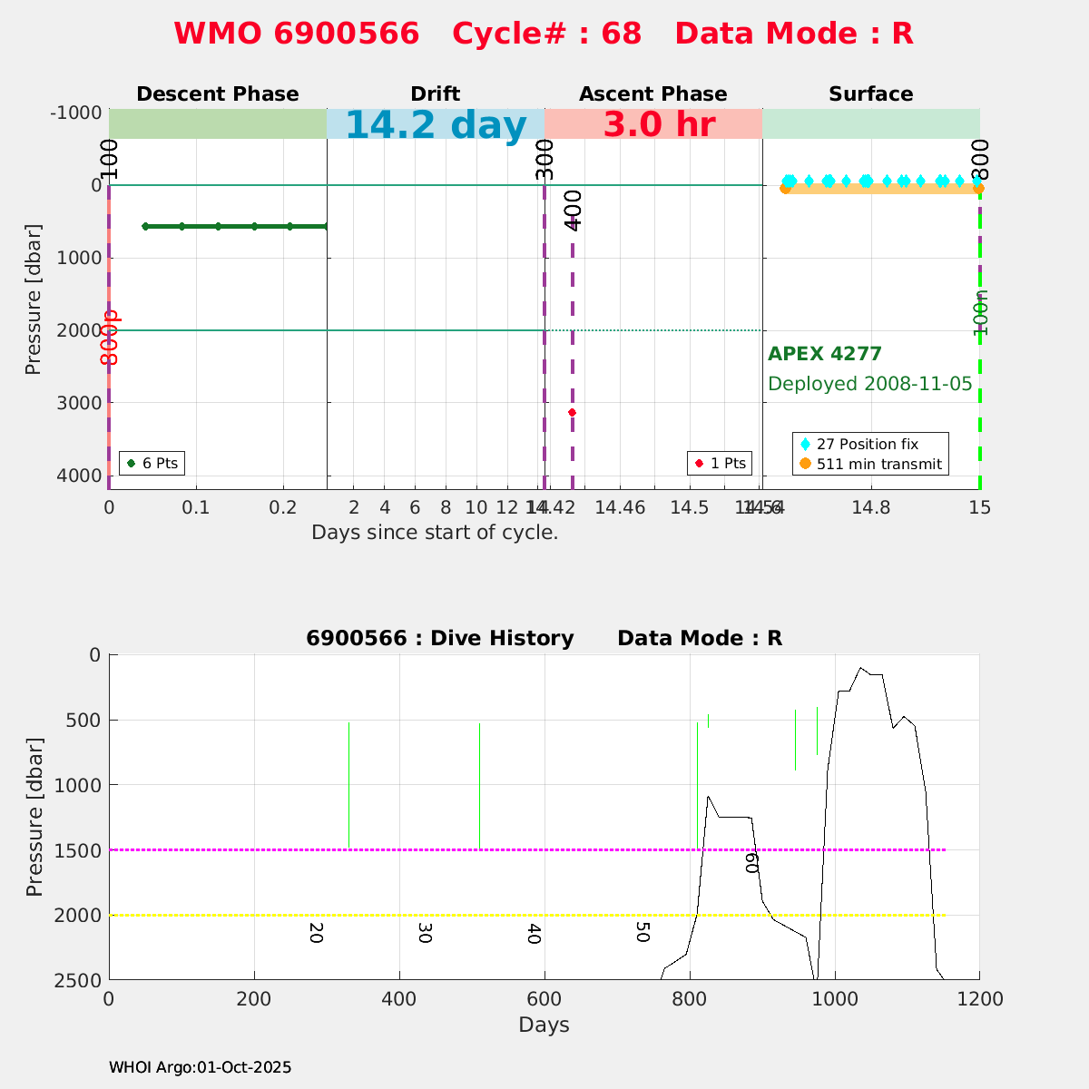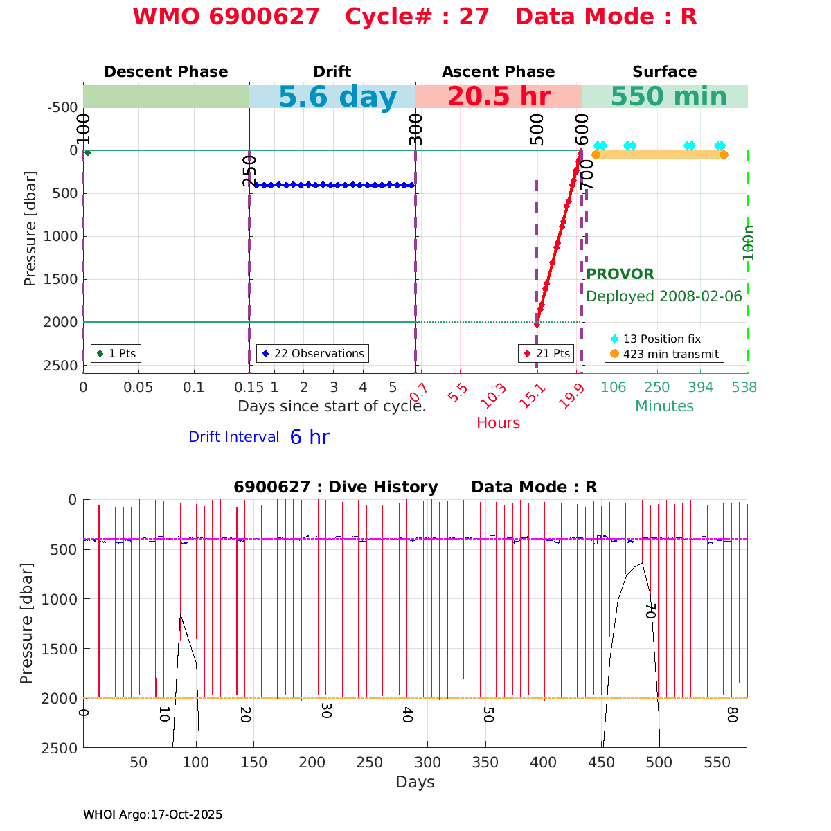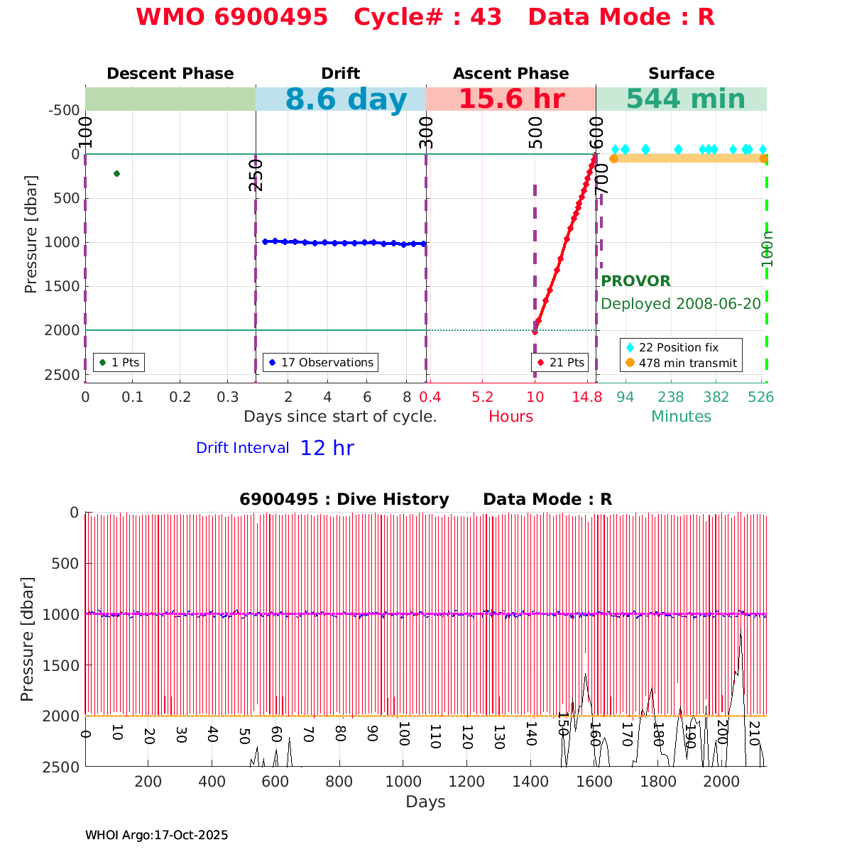 | WMO: #6900566 DAC: coriolis PI: Birgit KLEIN APEX: #4277 DRUCK_2900PSIA: #2724796 SBE41: #4267 Altimeter Comparison (IFREMER) EuroArgo Link | ![]() |