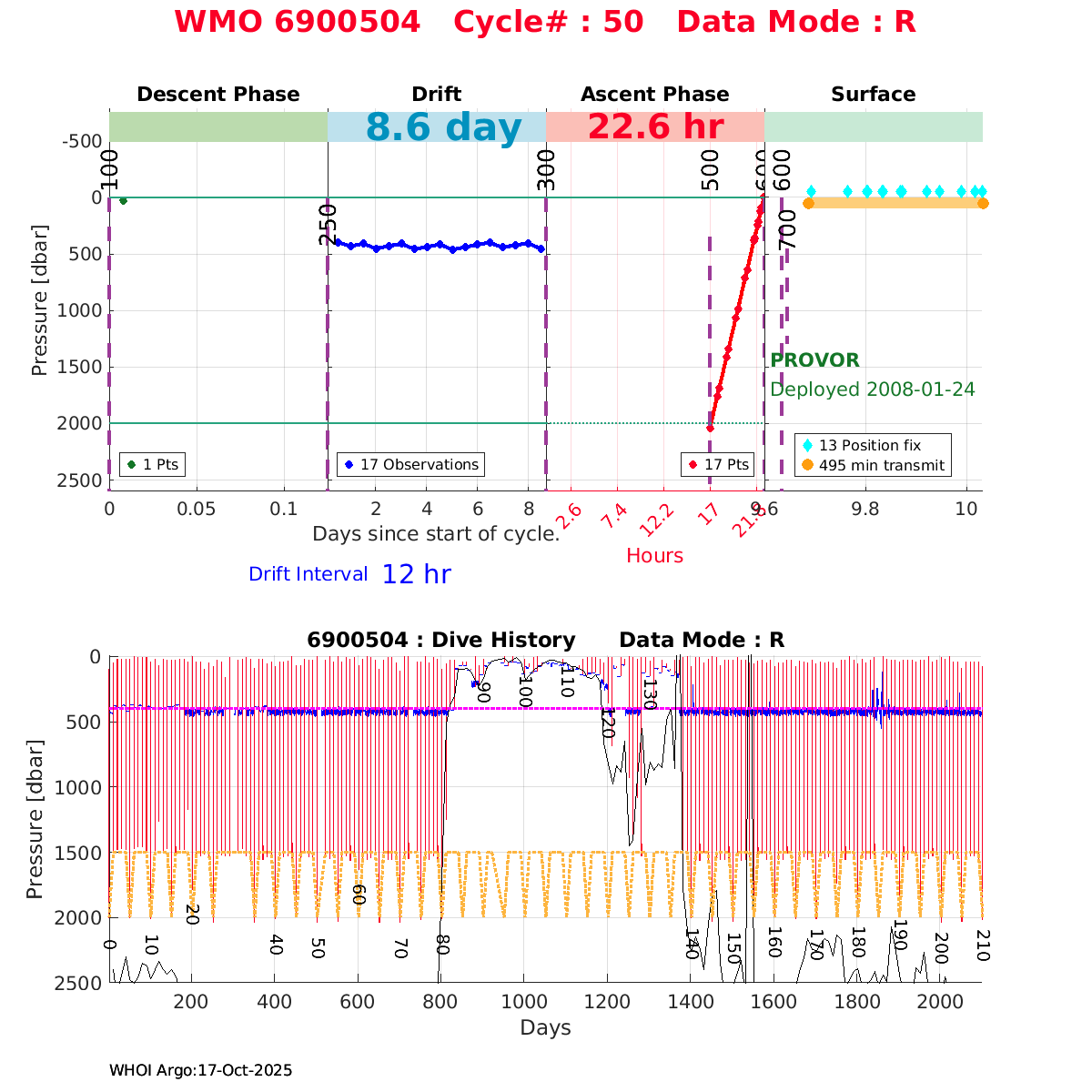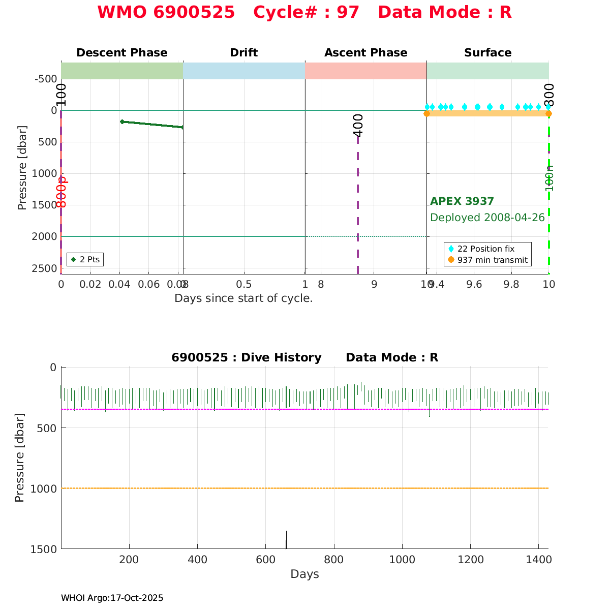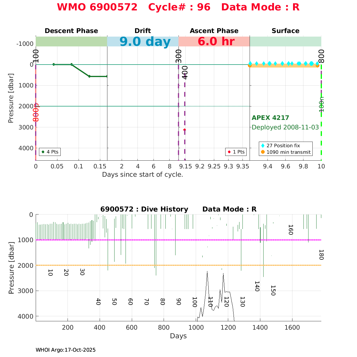 | WMO: #6900572 DAC: coriolis PI: Birgit KLEIN APEX: #4217 DRUCK_2900PSIA: #2701909 SBE41: #4204 Altimeter Comparison (IFREMER) EuroArgo Link | ![]() |