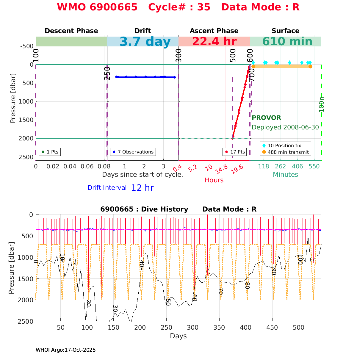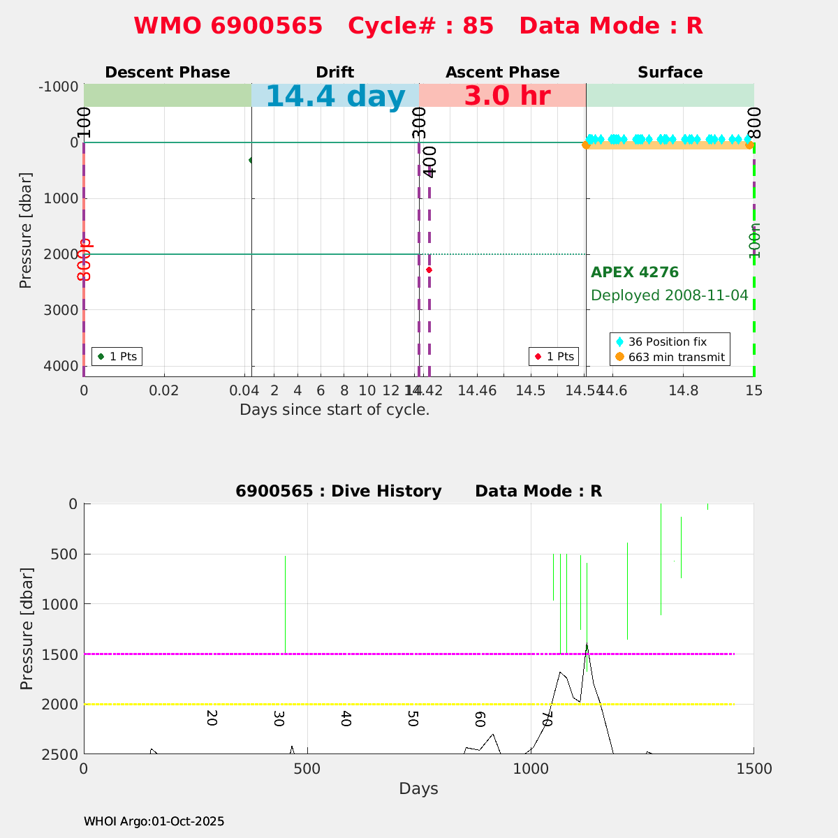| WMO: #6900565 DAC: coriolis PI: Birgit KLEIN APEX: #4276 DRUCK_2900PSIA: #2724771 SBE41: #4266 Altimeter Comparison (IFREMER) EuroArgo Link | ![]() |