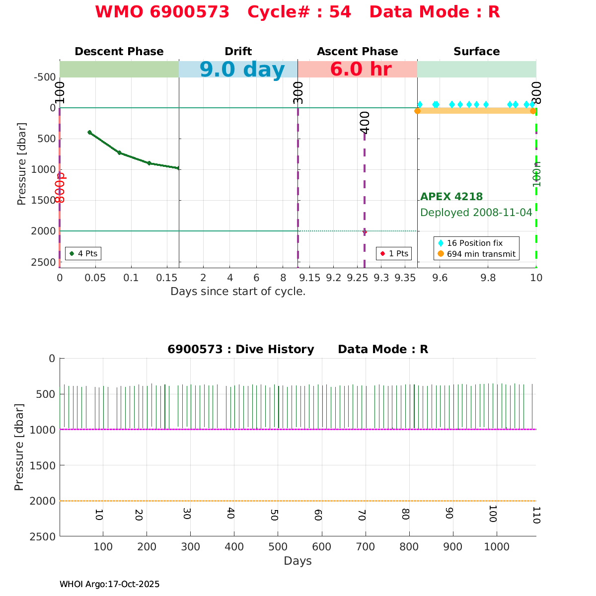 | WMO: #6900573 DAC: coriolis PI: Birgit KLEIN APEX: #4218 DRUCK_2900PSIA: #2701912 SBE41: #4207 Altimeter Comparison (IFREMER) EuroArgo Link | ![]() |