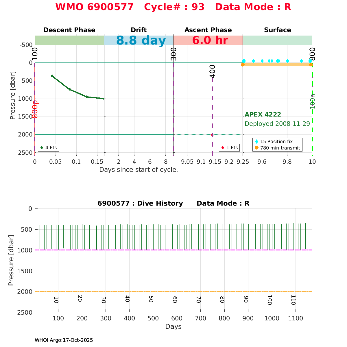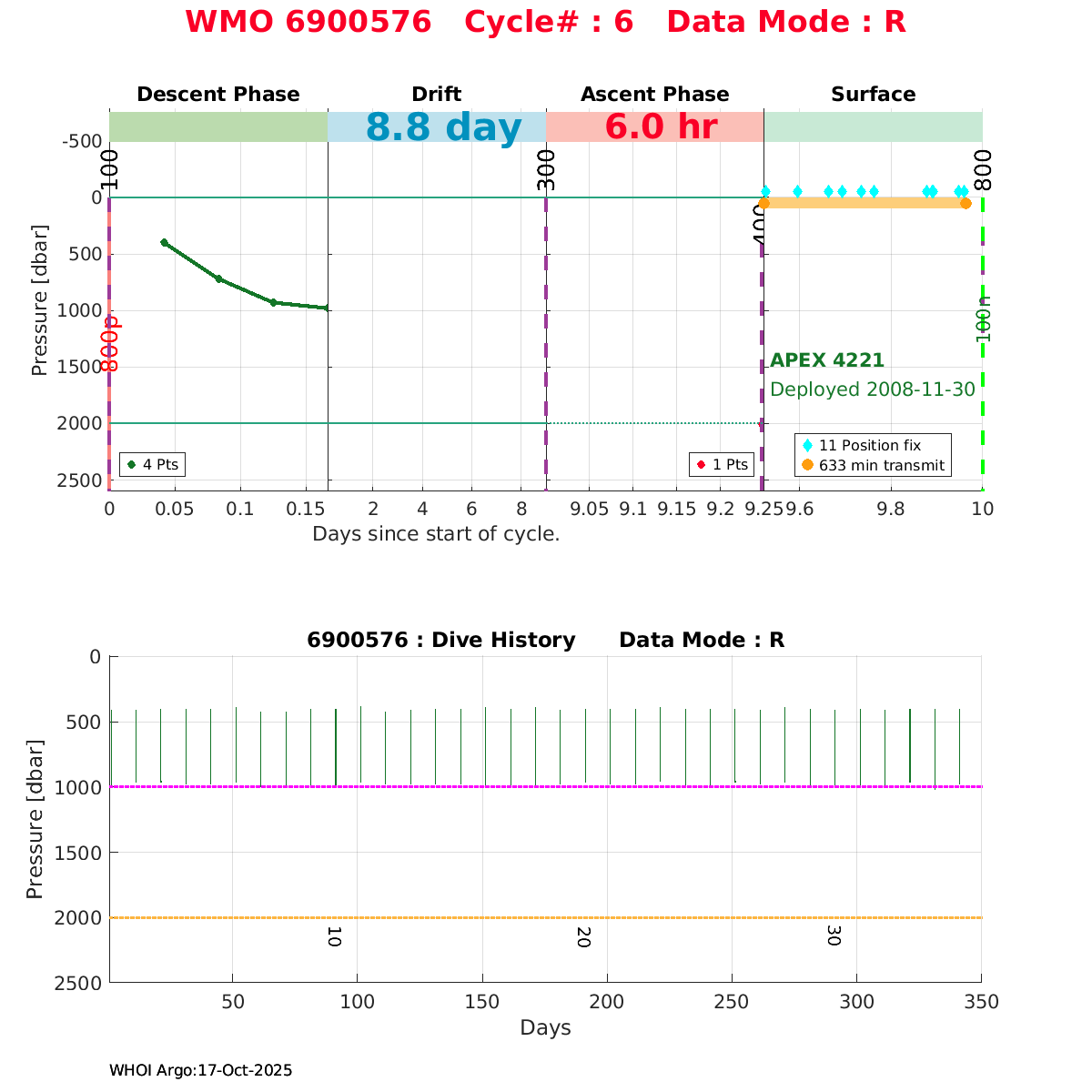 | WMO: #6900576 DAC: coriolis PI: Birgit KLEIN APEX: #4221 DRUCK_2900PSIA: #2711815 SBE41: #4217 Altimeter Comparison (IFREMER) EuroArgo Link | ![]() |