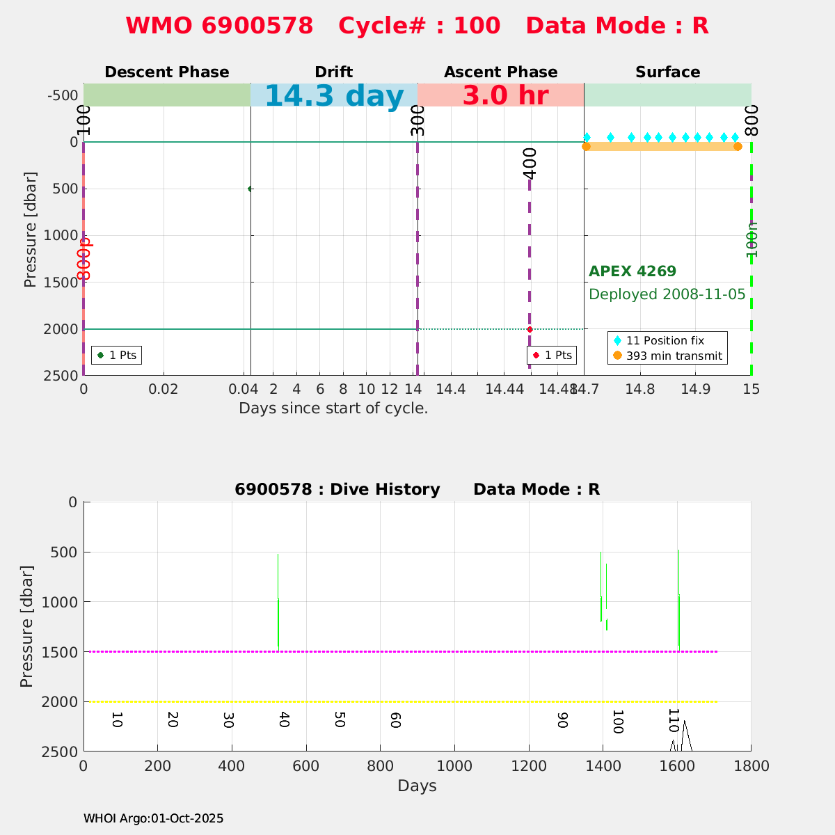 | WMO: #6900578 DAC: coriolis PI: Birgit KLEIN APEX: #4269 DRUCK_2900PSIA: #2711847 SBE41: #4140 Altimeter Comparison (IFREMER) EuroArgo Link | ![]() |