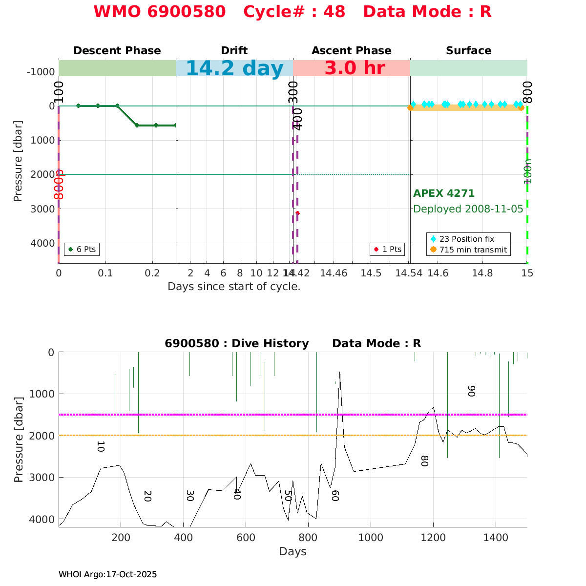| WMO: #6900580 DAC: coriolis PI: Birgit KLEIN APEX: #4271 DRUCK_2900PSIA: #2636967 SBE41: #4168 Altimeter Comparison (IFREMER) EuroArgo Link | ![]() |