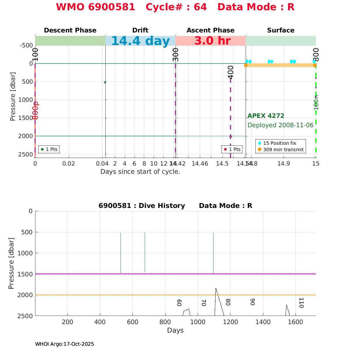 | WMO: #6900581 DAC: coriolis PI: Birgit KLEIN APEX: #4272 DRUCK_2900PSIA: #2724806 SBE41: #4276 Altimeter Comparison (IFREMER) EuroArgo Link | ![]() |