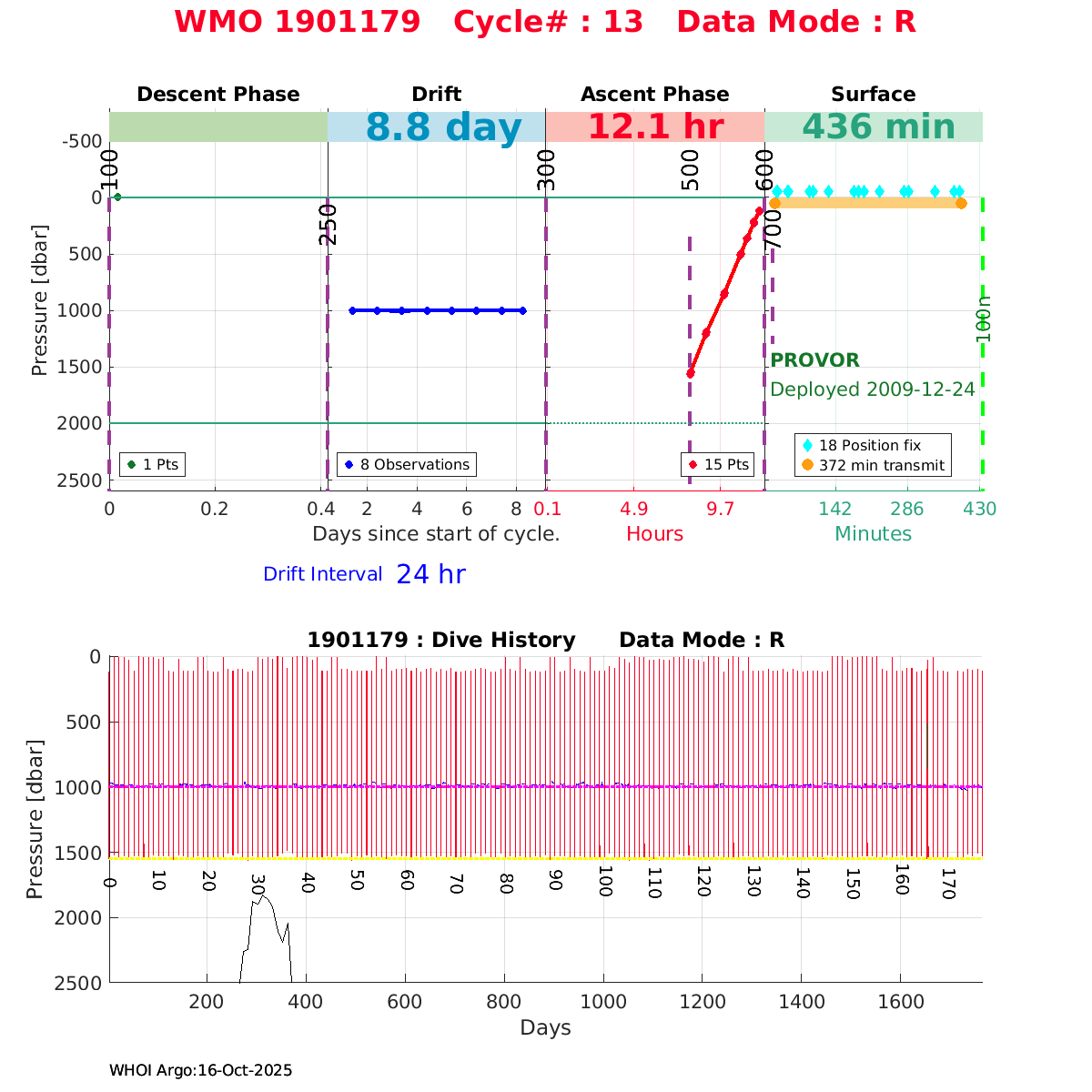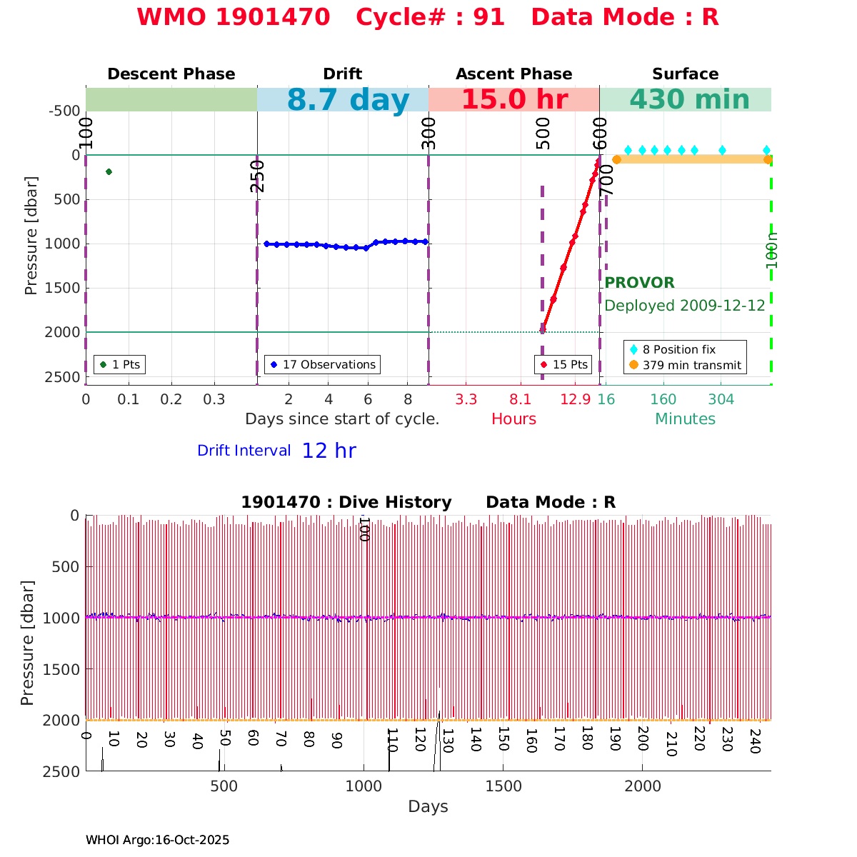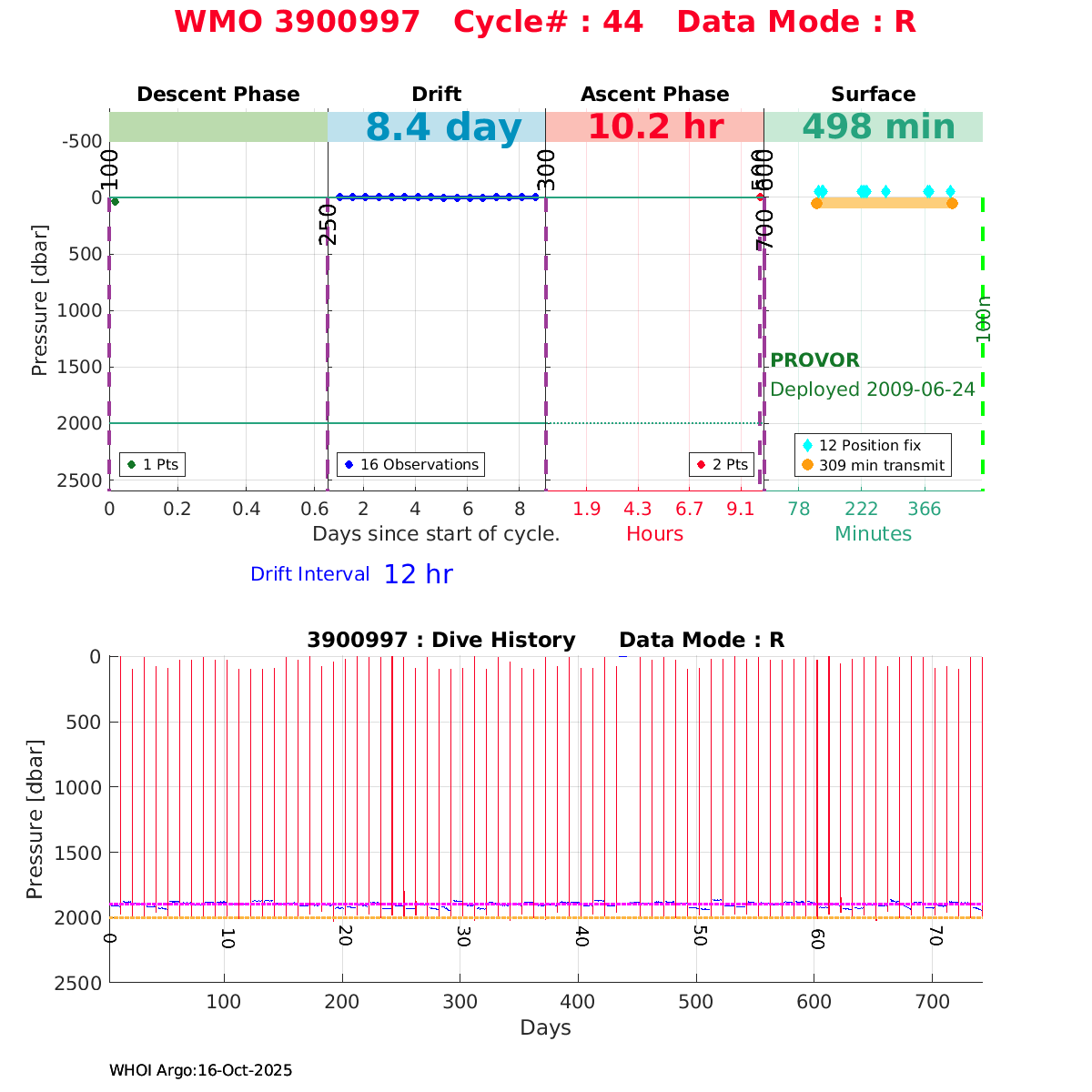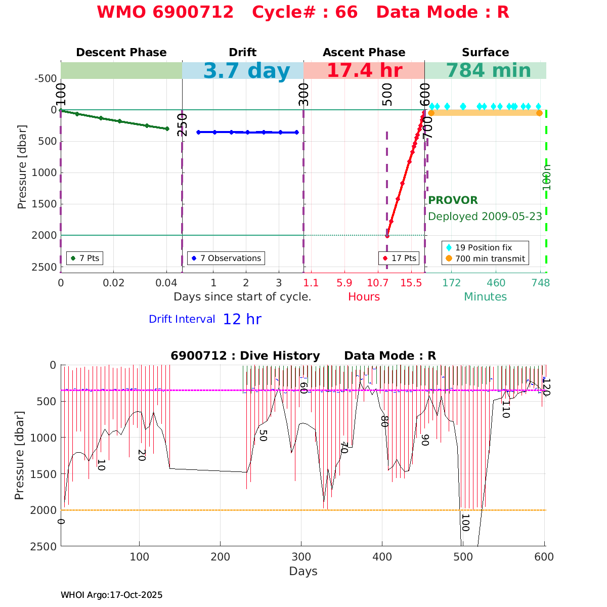 | WMO: #1901179 DAC: coriolis PI: Sabrina SPEICH, Michel ARHAN PROVOR: # FLOATCLOCK: # DRUCK_2900PSIA: #2619551 SBE41CP: #1800 Altimeter Comparison (IFREMER) EuroArgo Link | ![]() |