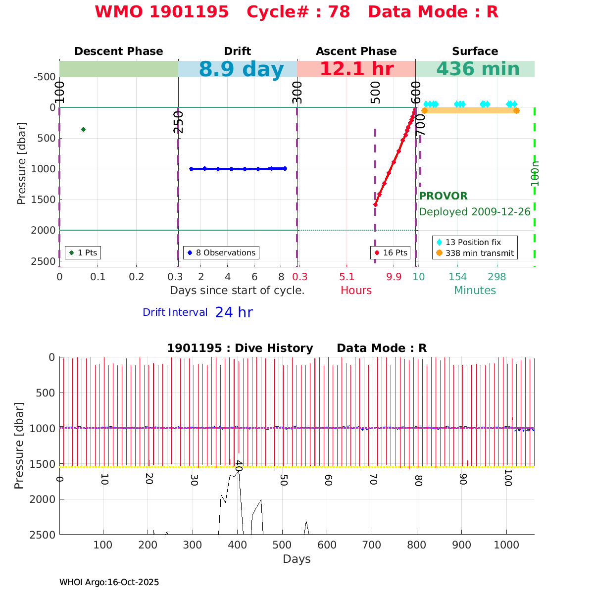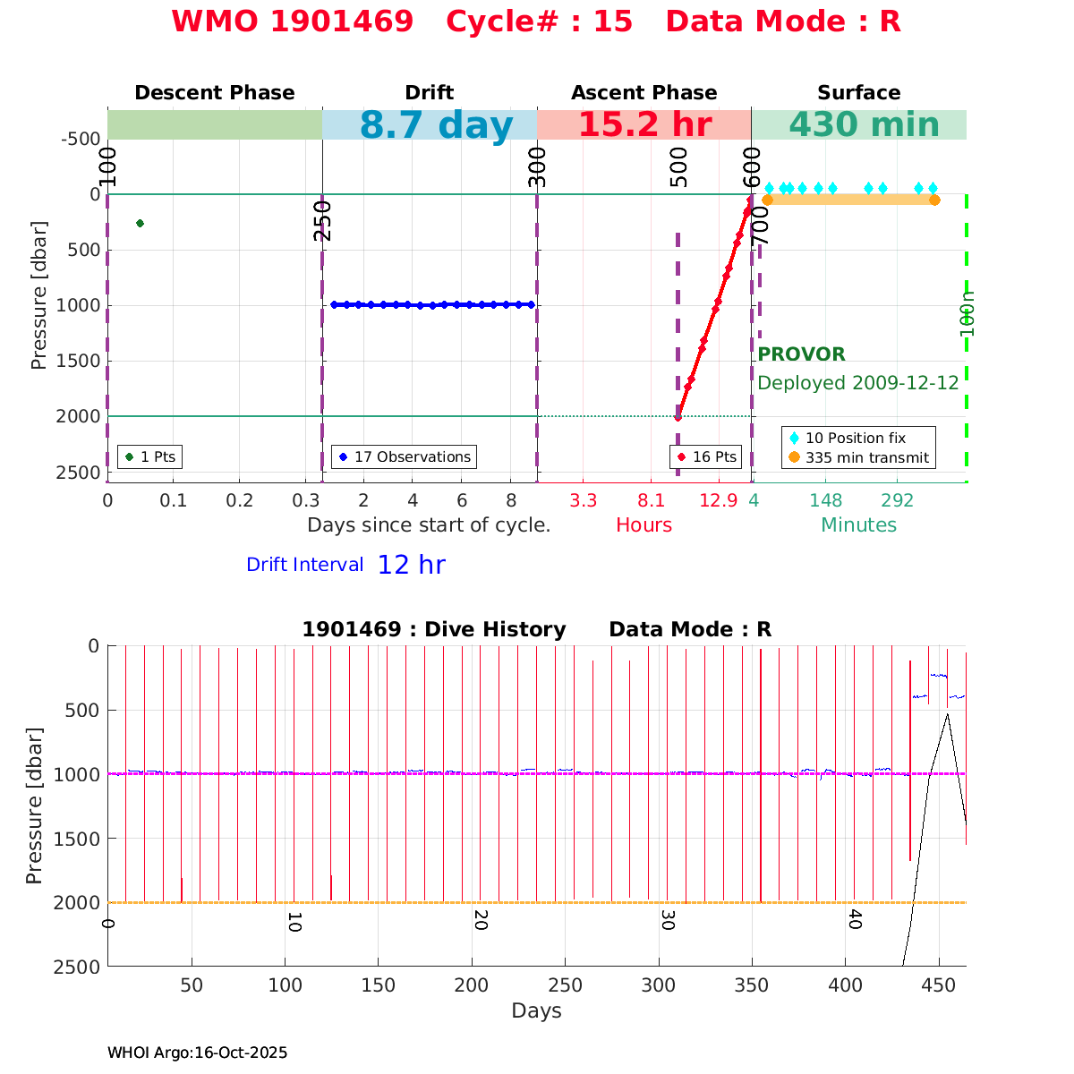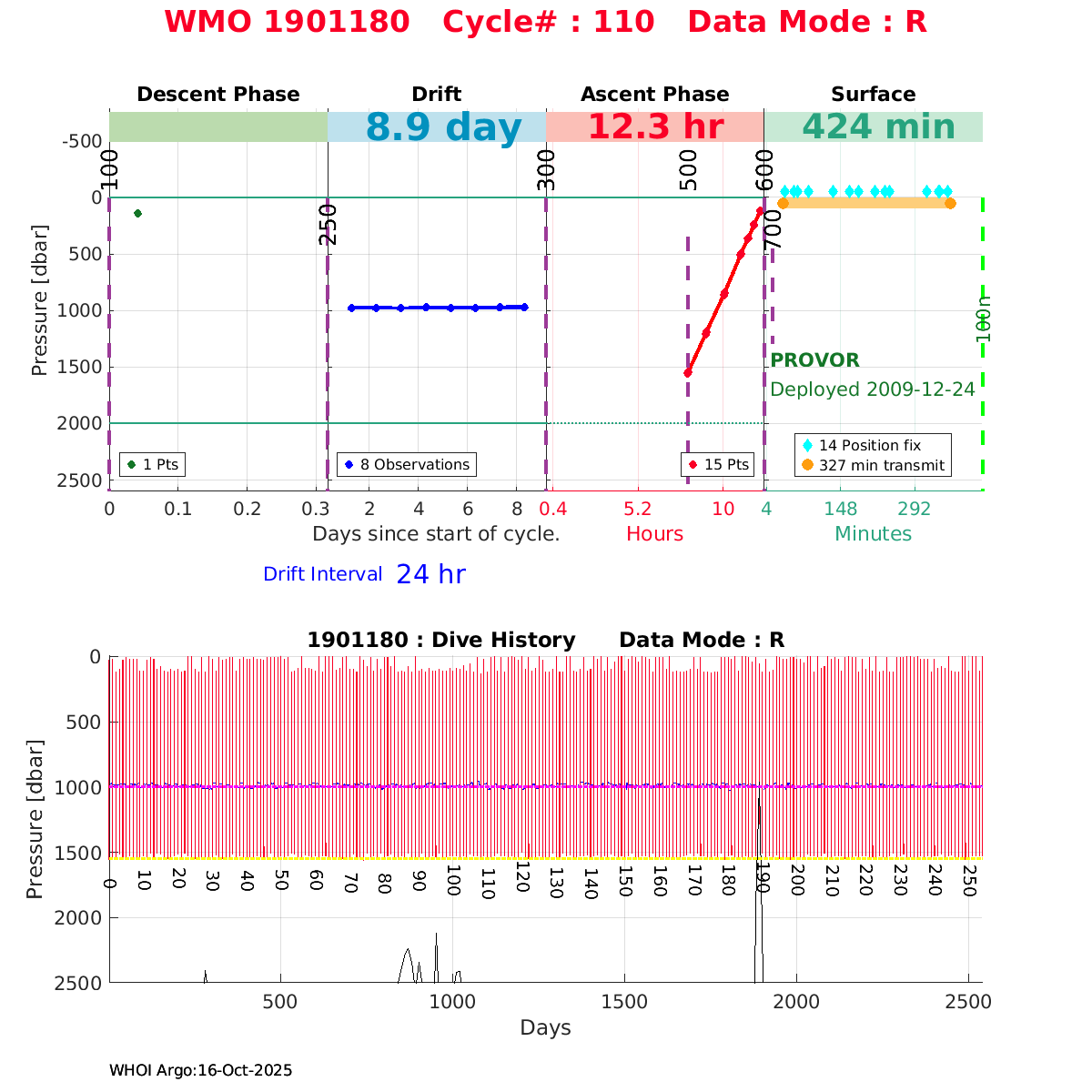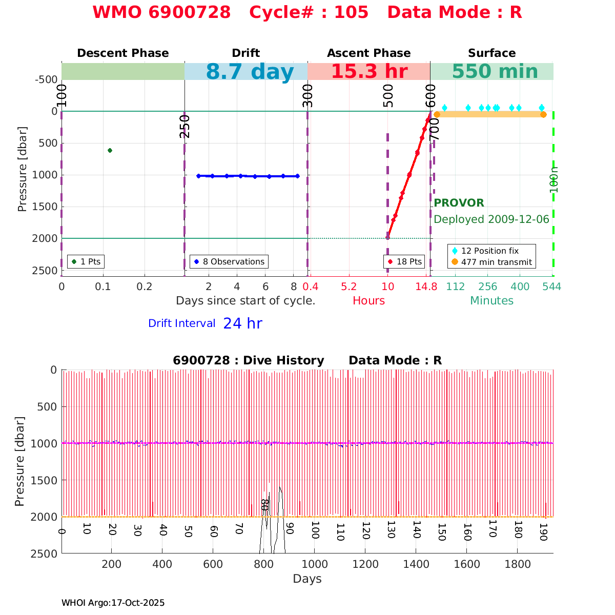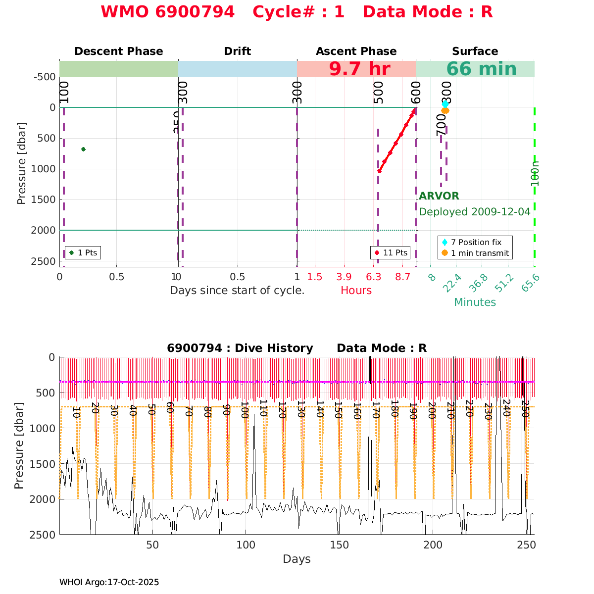 | WMO: #1901179 DAC: coriolis PI: Sabrina SPEICH, Michel ARHAN PROVOR: # FLOATCLOCK: # DRUCK_2900PSIA: #2619551 SBE41CP: #1800 Altimeter Comparison (IFREMER) EuroArgo Link | ![]() |