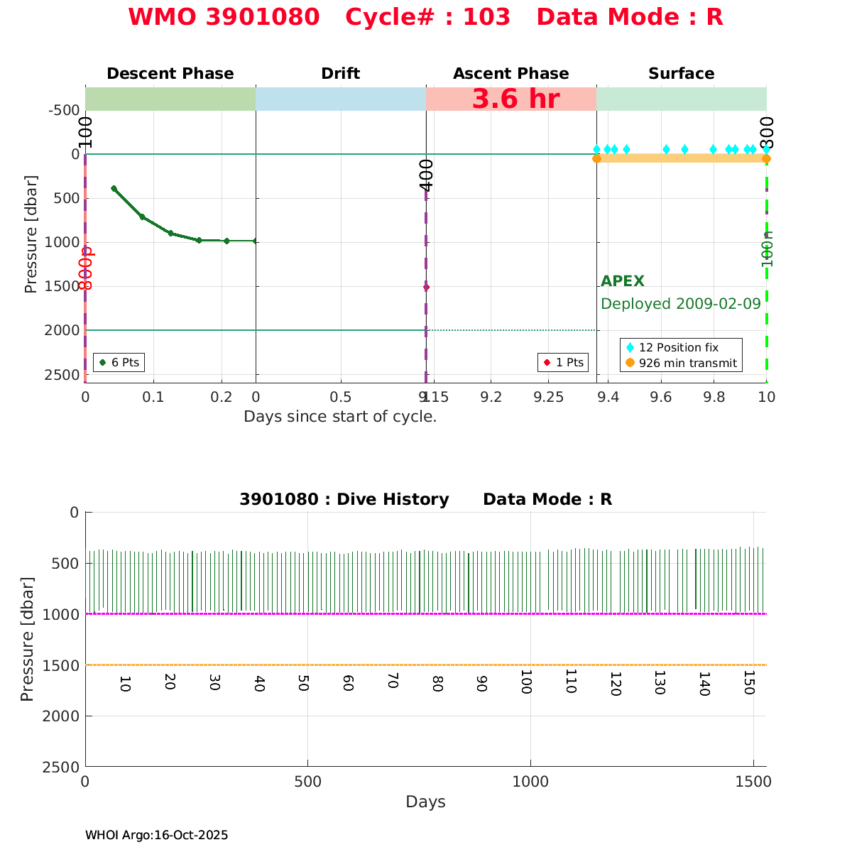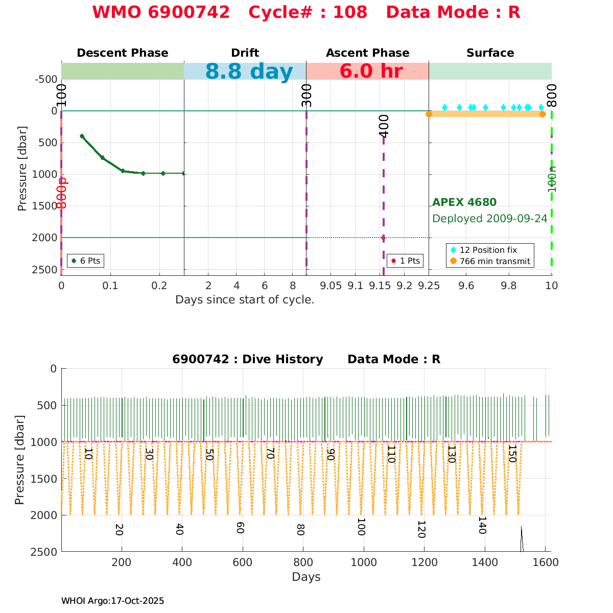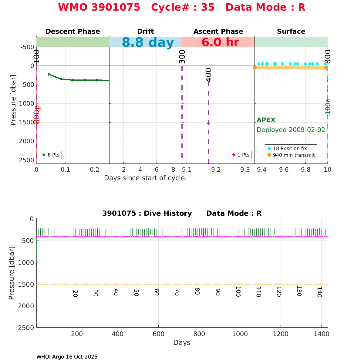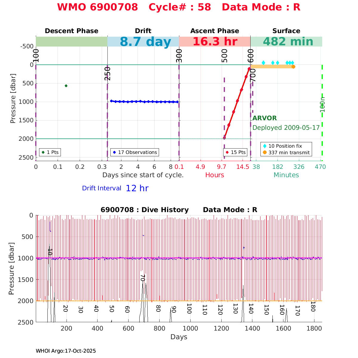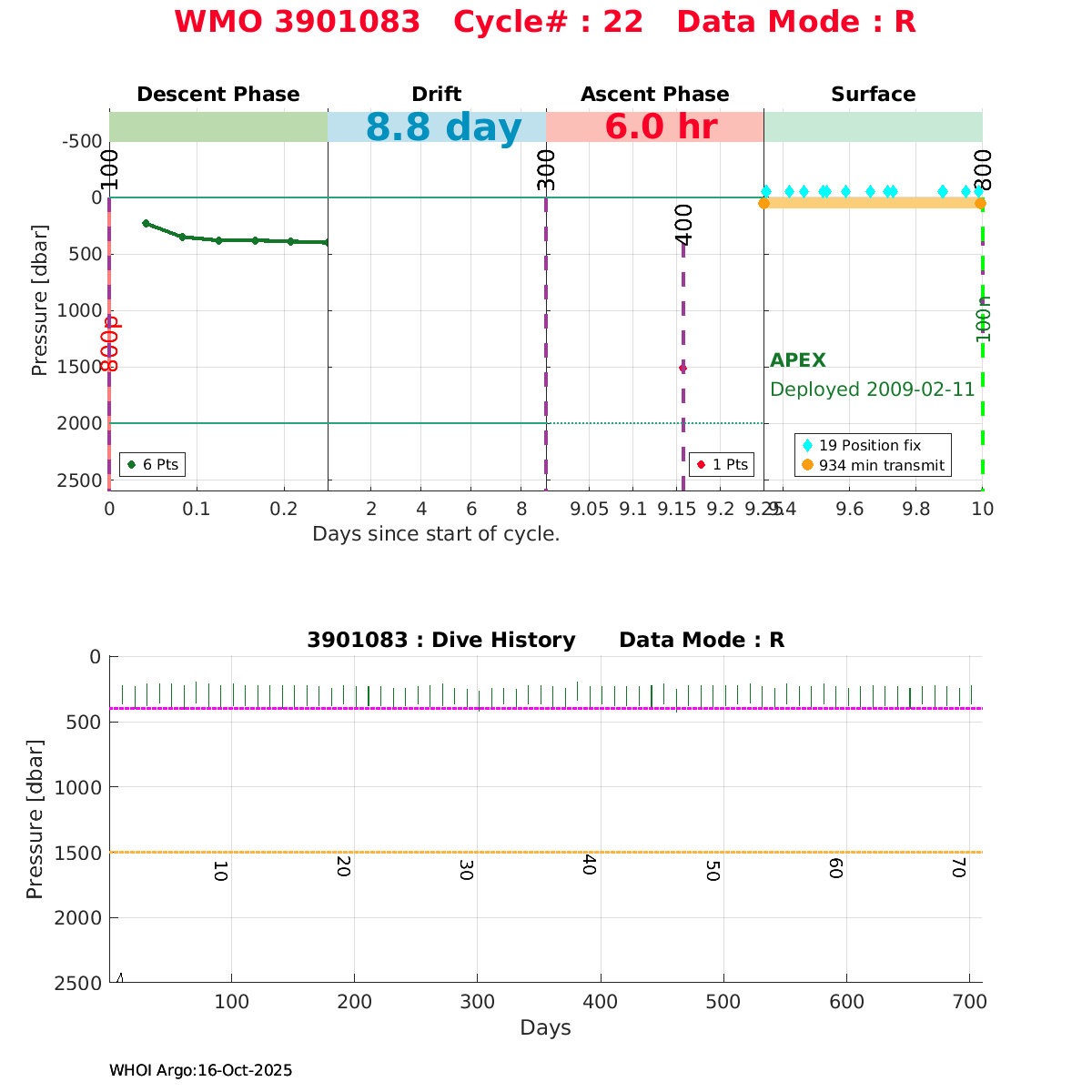 | WMO: #1901179 DAC: coriolis PI: Sabrina SPEICH, Michel ARHAN PROVOR: # FLOATCLOCK: # DRUCK_2900PSIA: #2619551 SBE41CP: #1800 Altimeter Comparison (IFREMER) EuroArgo Link | ![]() |