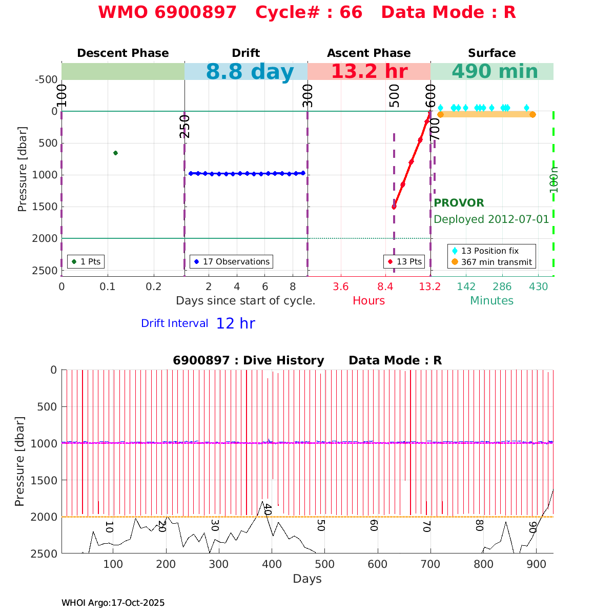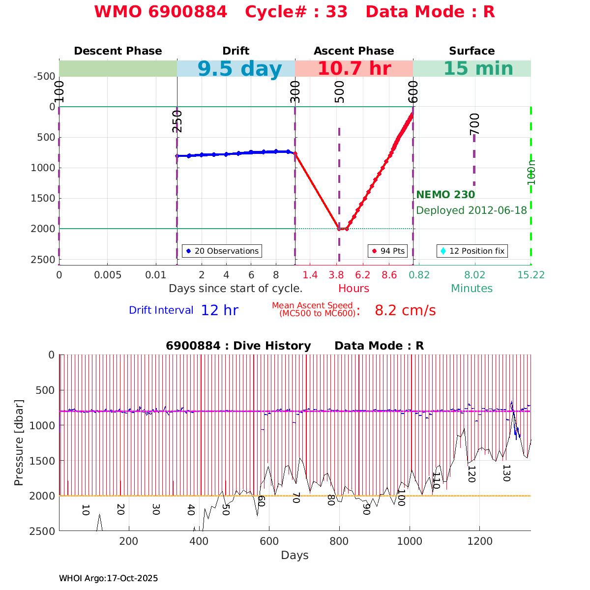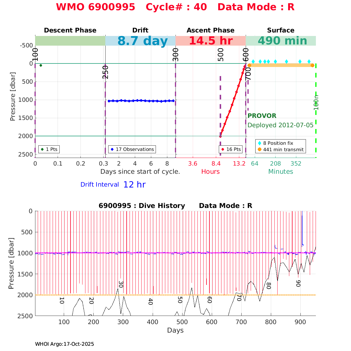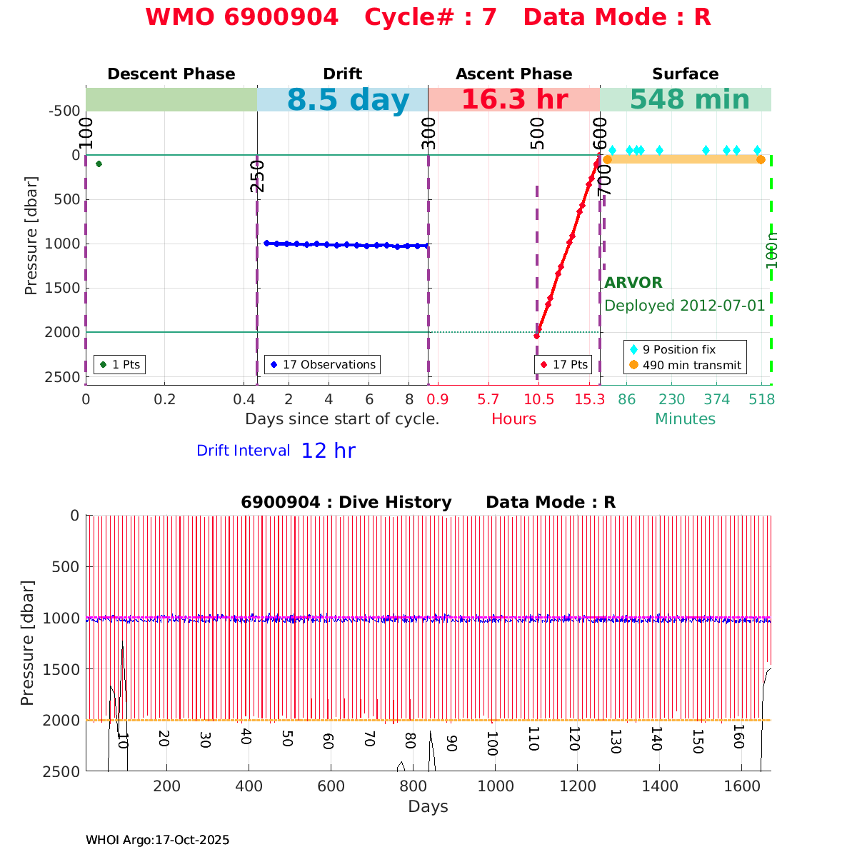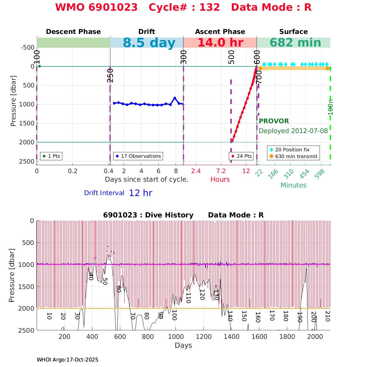 | WMO: #6901474 DAC: coriolis PI: Herve CLAUSTRE PROVOR_III: # KISTLER_2900PSIA: #2099881 SBE41CP: #3982 AANDERAA_OPTODE_4330: #843 SATLANTIC_OCR504_ICSW: #40225 ECO_FLBBCD: #2446 C_ROVER: #44 SUNA_V2: #202 Altimeter Comparison (IFREMER) EuroArgo Link | ![]() |
