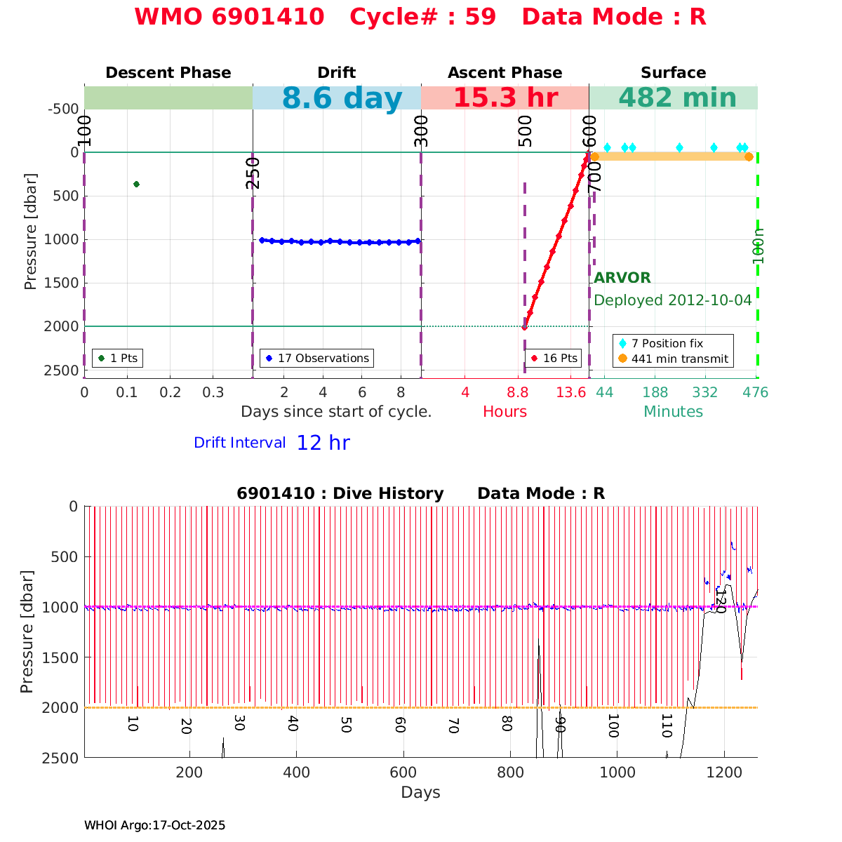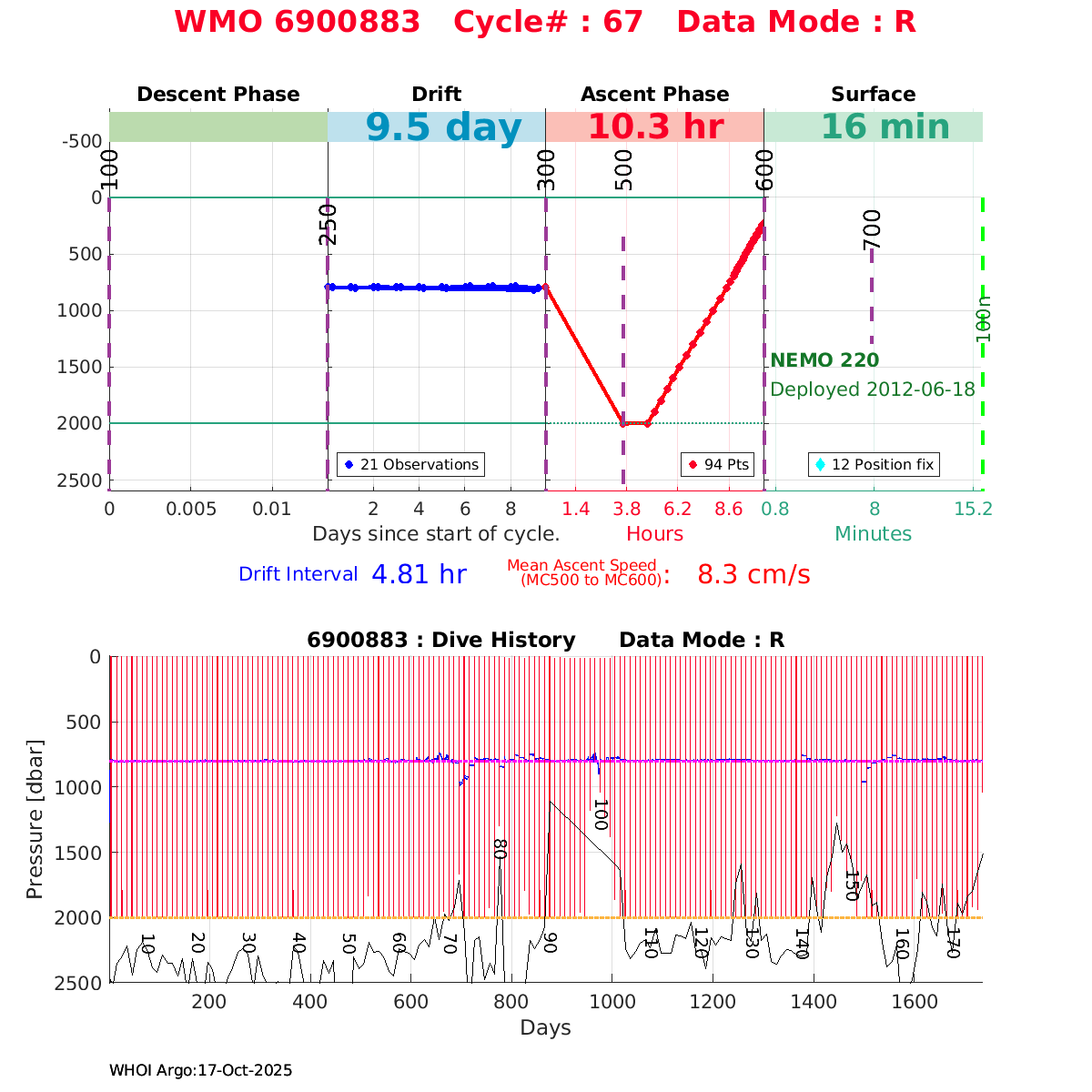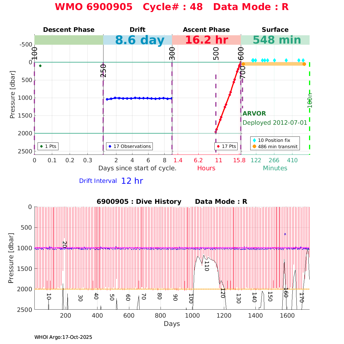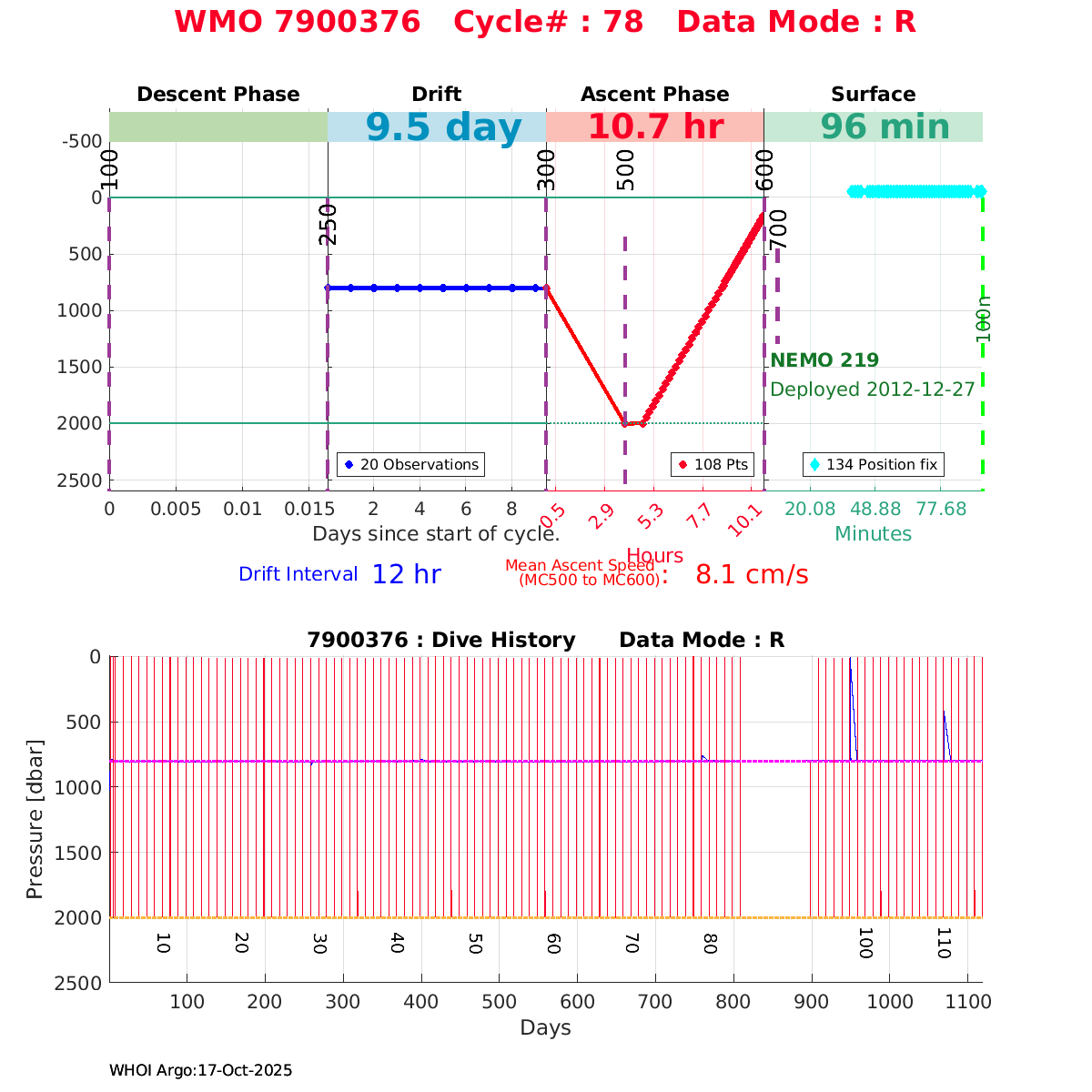 | WMO: #6901474 DAC: coriolis PI: Herve CLAUSTRE PROVOR_III: # KISTLER_2900PSIA: #2099881 SBE41CP: #3982 AANDERAA_OPTODE_4330: #843 SATLANTIC_OCR504_ICSW: #40225 ECO_FLBBCD: #2446 C_ROVER: #44 SUNA_V2: #202 Altimeter Comparison (IFREMER) EuroArgo Link | ![]() |