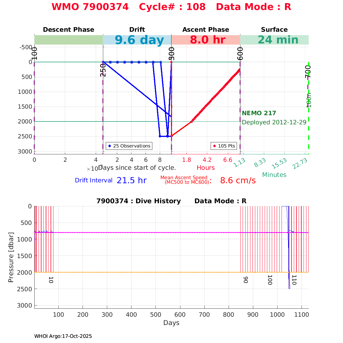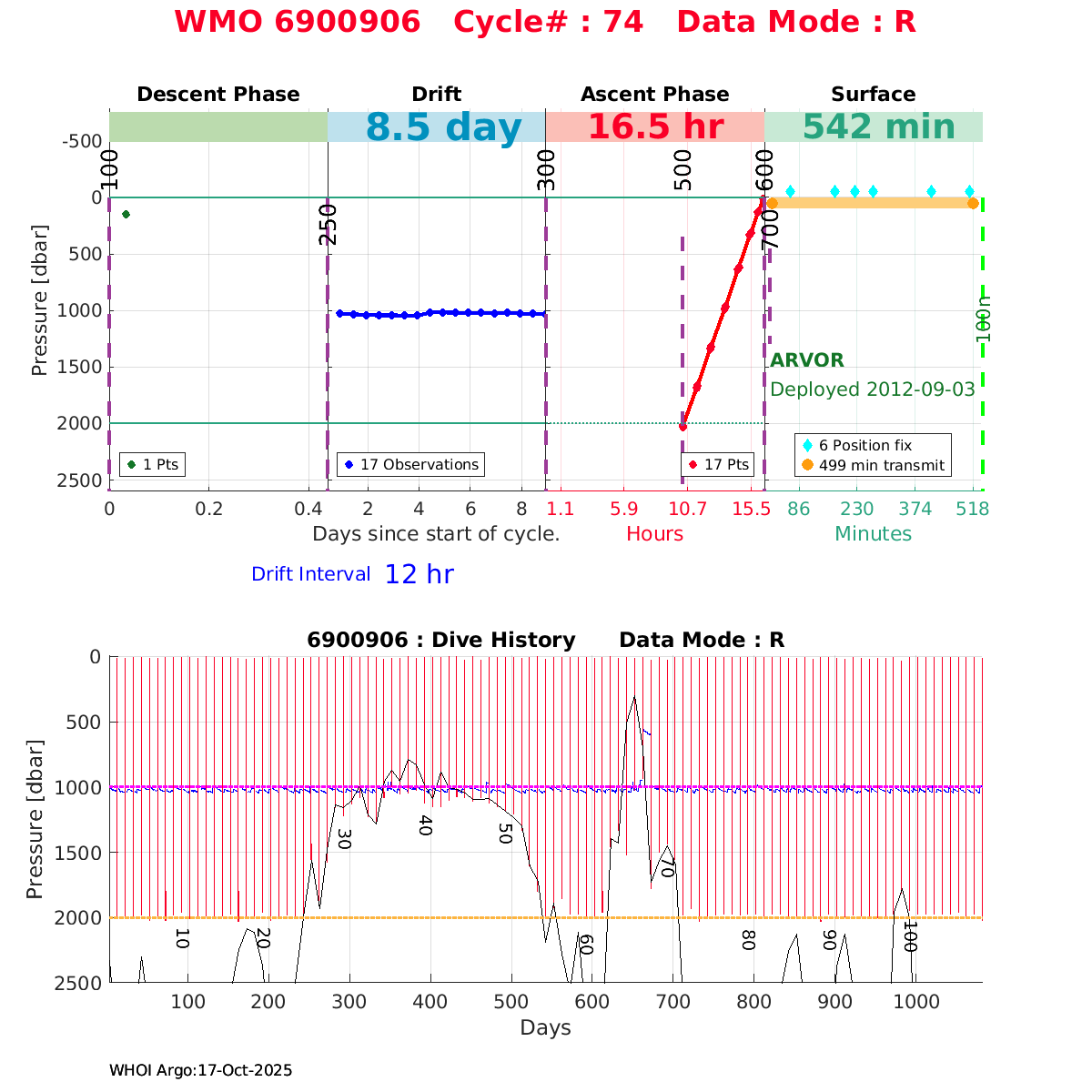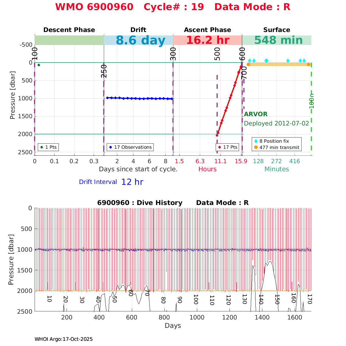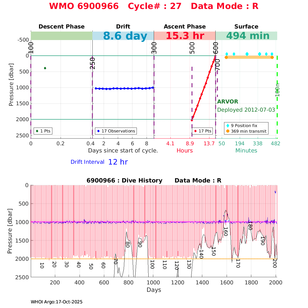 | WMO: #6901474 DAC: coriolis PI: Herve CLAUSTRE PROVOR_III: # KISTLER_2900PSIA: #2099881 SBE41CP: #3982 AANDERAA_OPTODE_4330: #843 SATLANTIC_OCR504_ICSW: #40225 ECO_FLBBCD: #2446 C_ROVER: #44 SUNA_V2: #202 Altimeter Comparison (IFREMER) EuroArgo Link | ![]() |