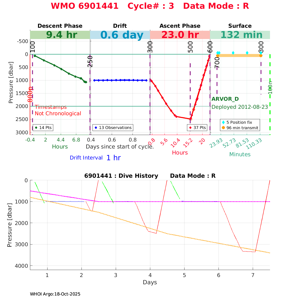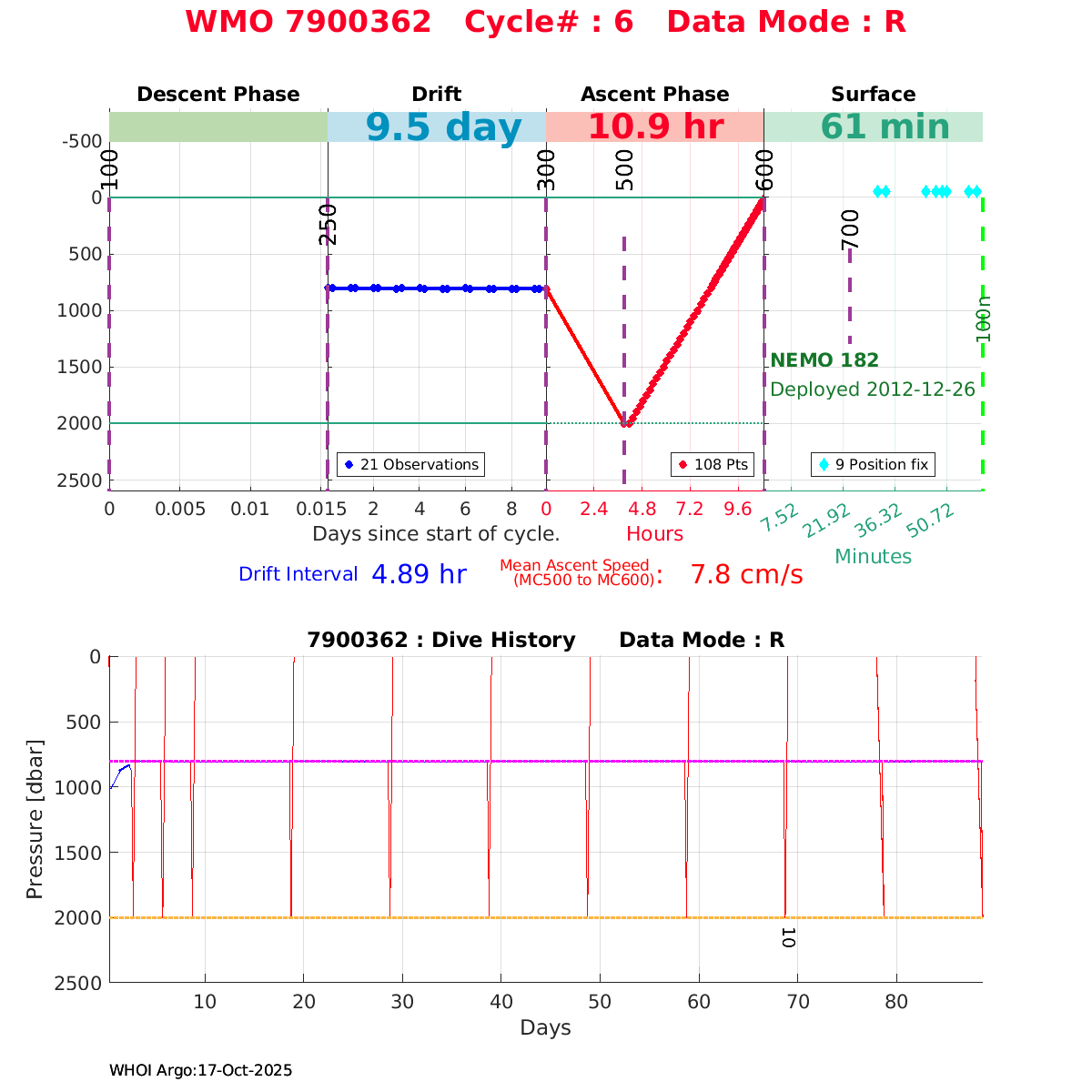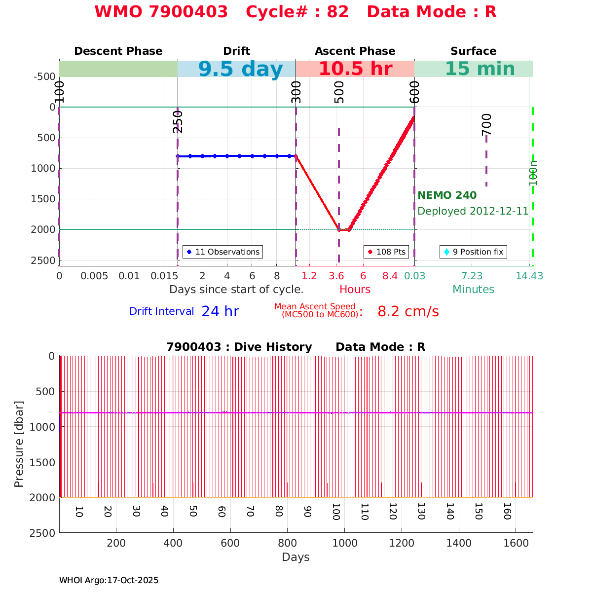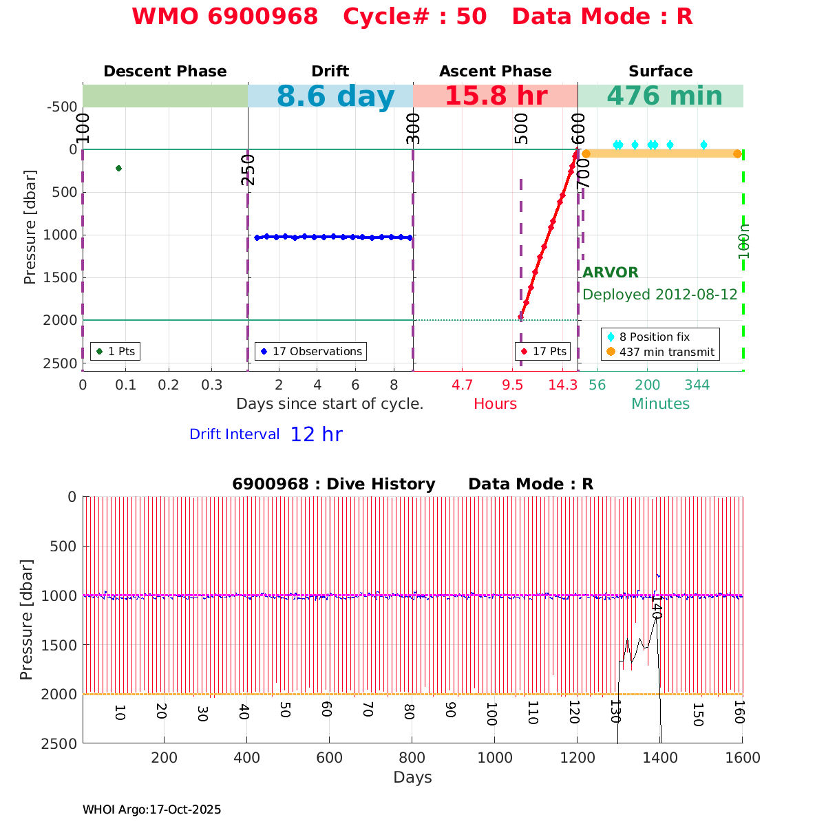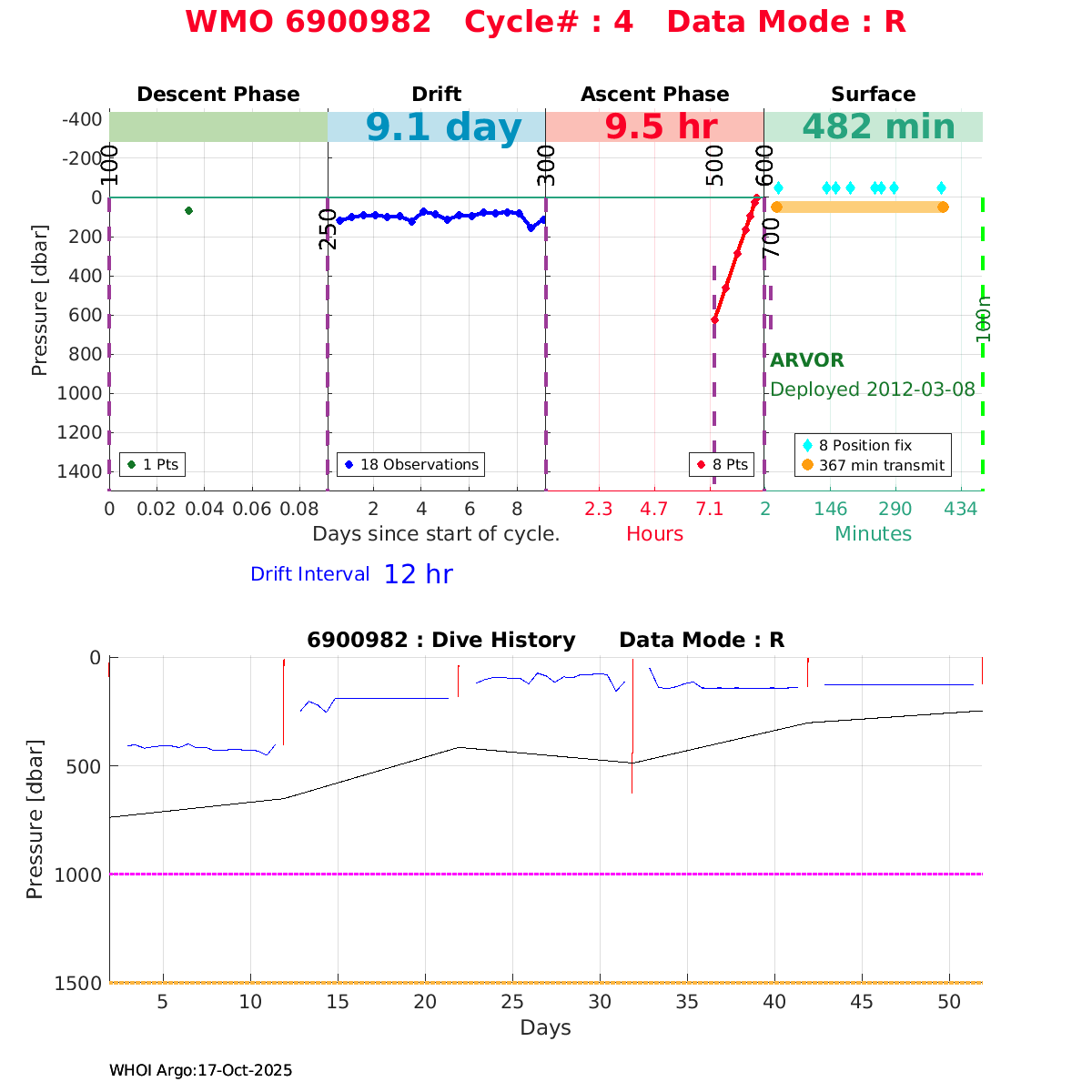 | WMO: #6900982 DAC: coriolis PI: Pierre-Marie POULAIN ARVOR: # FLOATCLOCK: # KISTLER_2900PSIA: #2100550 SBE41CP: #4008 Altimeter Comparison (IFREMER) EuroArgo Link | n/a | n/a | ![]() |