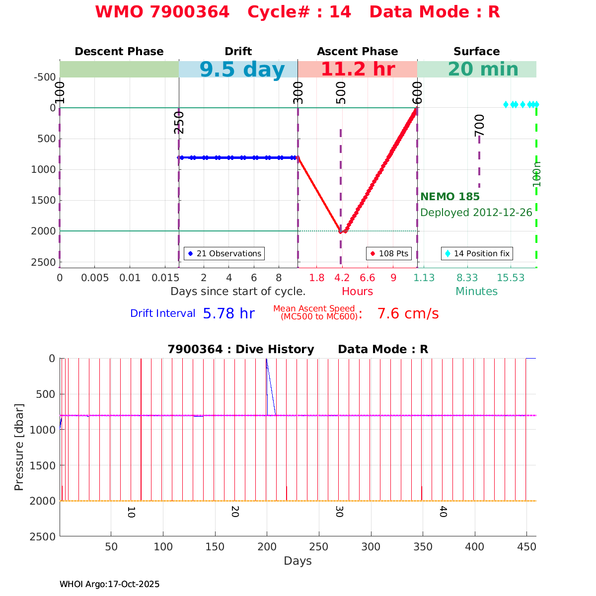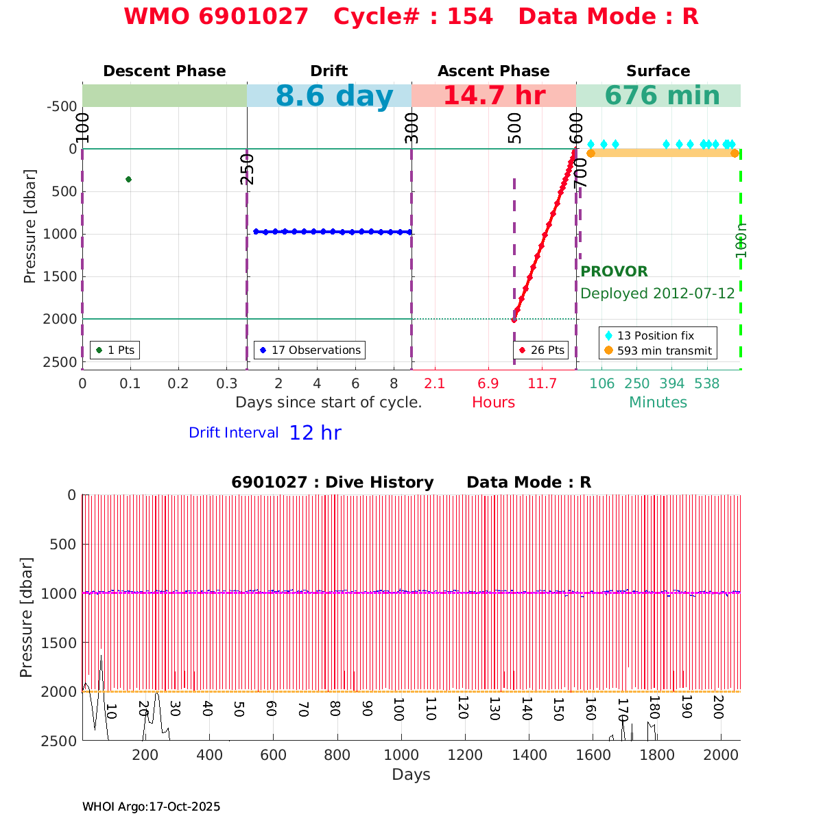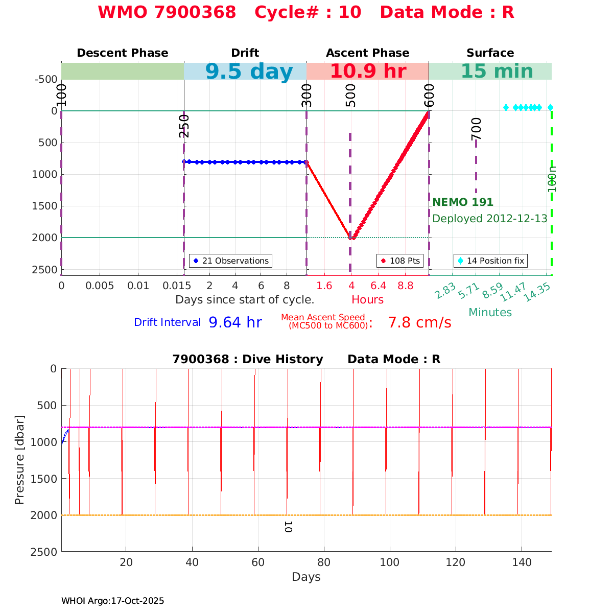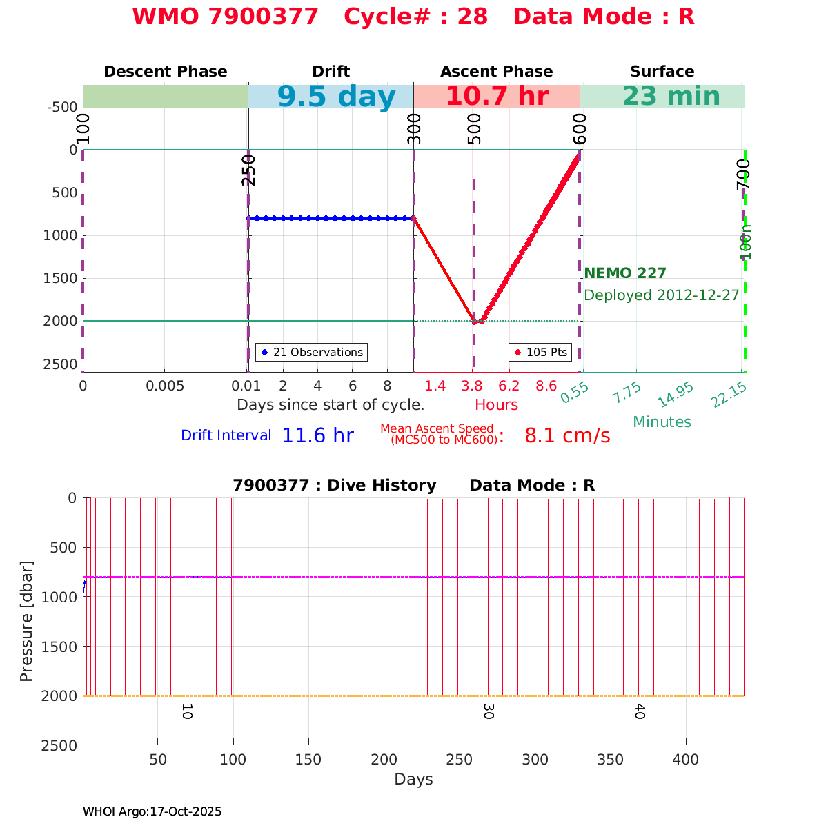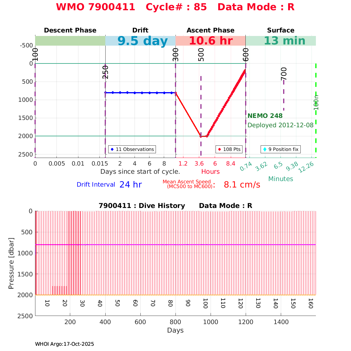 | WMO: #6901472 DAC: coriolis PI: Herve CLAUSTRE PROVOR_III: # KISTLER_2900PSIA: #2096303 SBE41CP: #3979 AANDERAA_OPTODE_4330: #840 SATLANTIC_OCR504_ICSW: #40190 ECO_FLBBCD: #2307 SUNA_V2: #200 Altimeter Comparison (IFREMER) EuroArgo Link | ![]() |