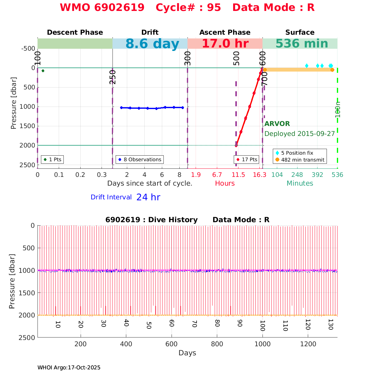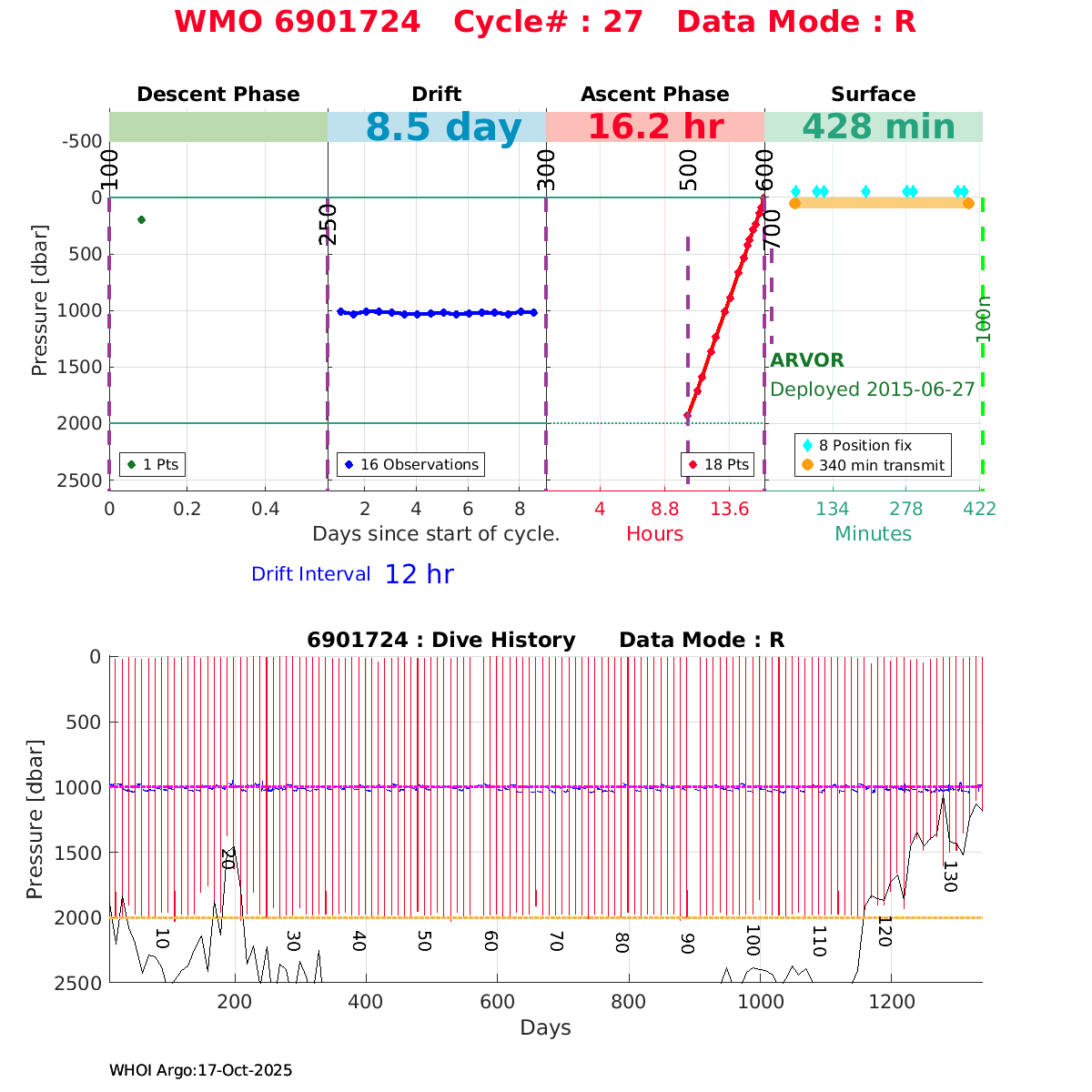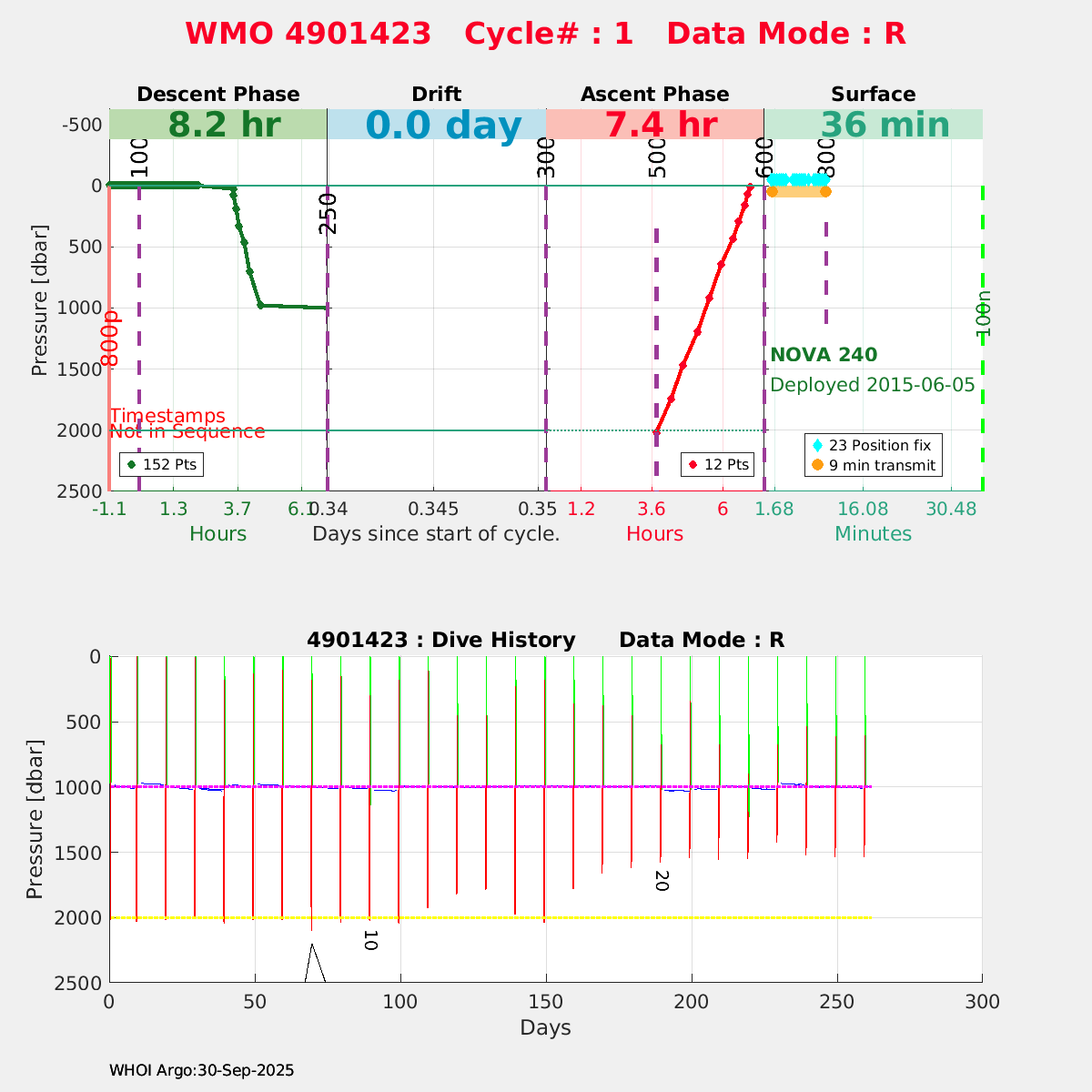 | WMO: #6901739 DAC: coriolis PI: Fabien DURAND ARVOR: # FLOATCLOCK: # KISTLER_2900PSIA: #2157430 SBE41CP_V2: #6382 Altimeter Comparison (IFREMER) EuroArgo Link | ![]() |