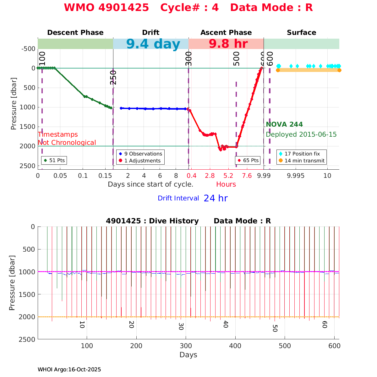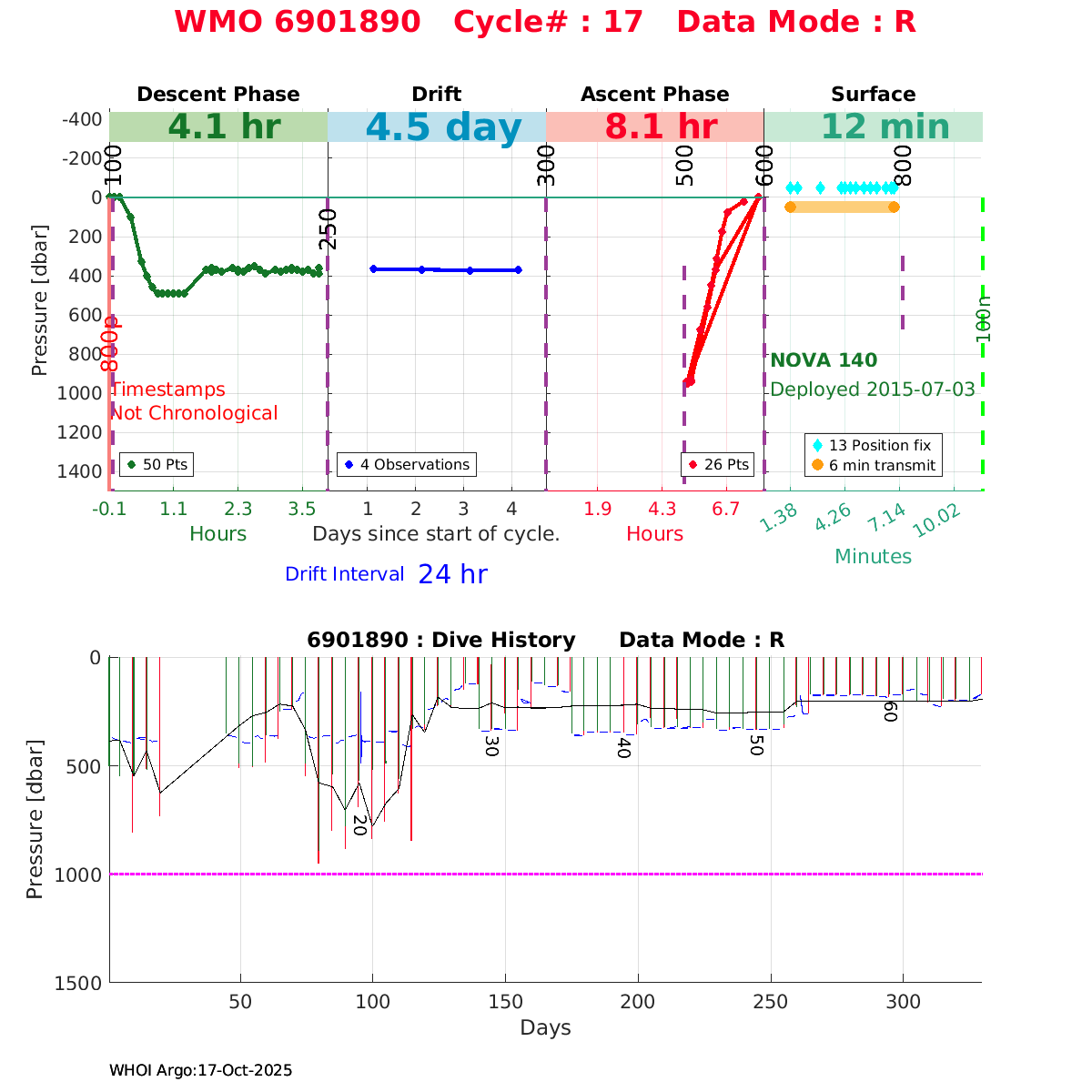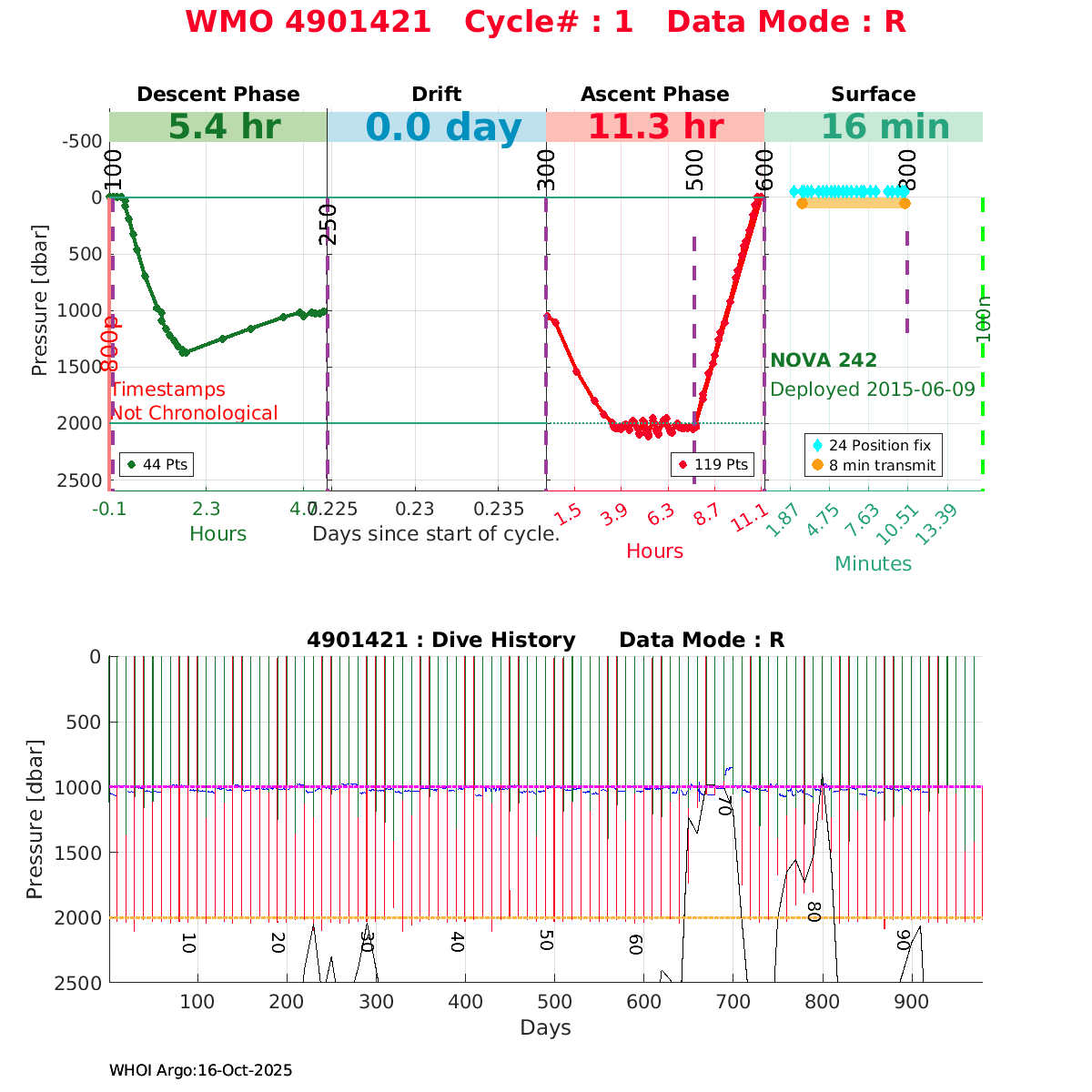 | WMO: #6901739 DAC: coriolis PI: Fabien DURAND ARVOR: # FLOATCLOCK: # KISTLER_2900PSIA: #2157430 SBE41CP_V2: #6382 Altimeter Comparison (IFREMER) EuroArgo Link | ![]() |