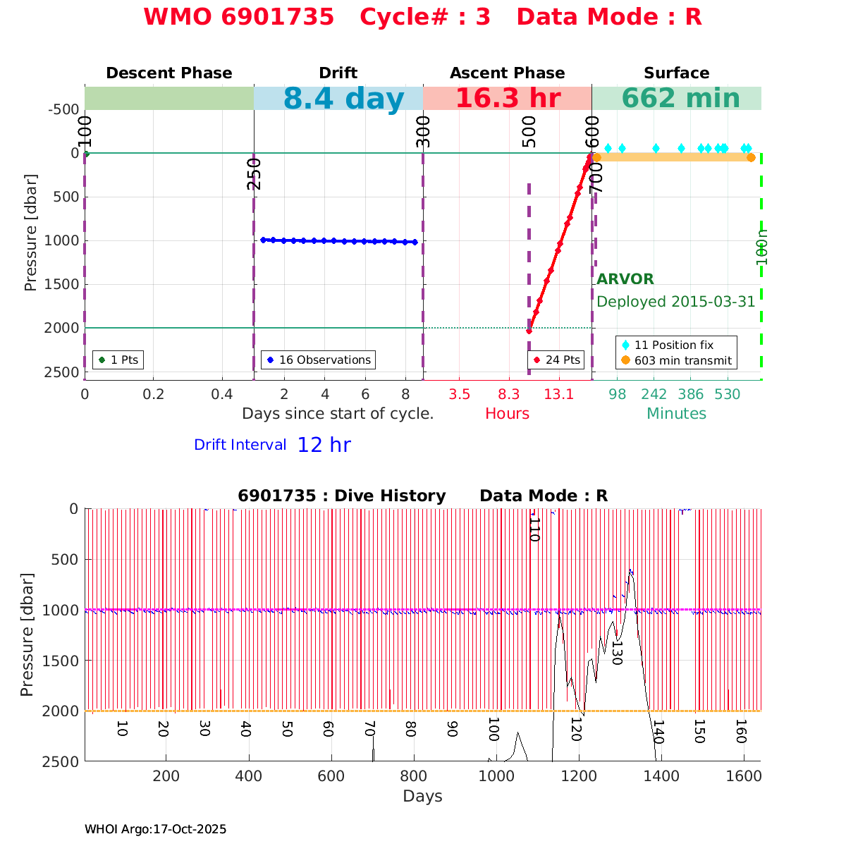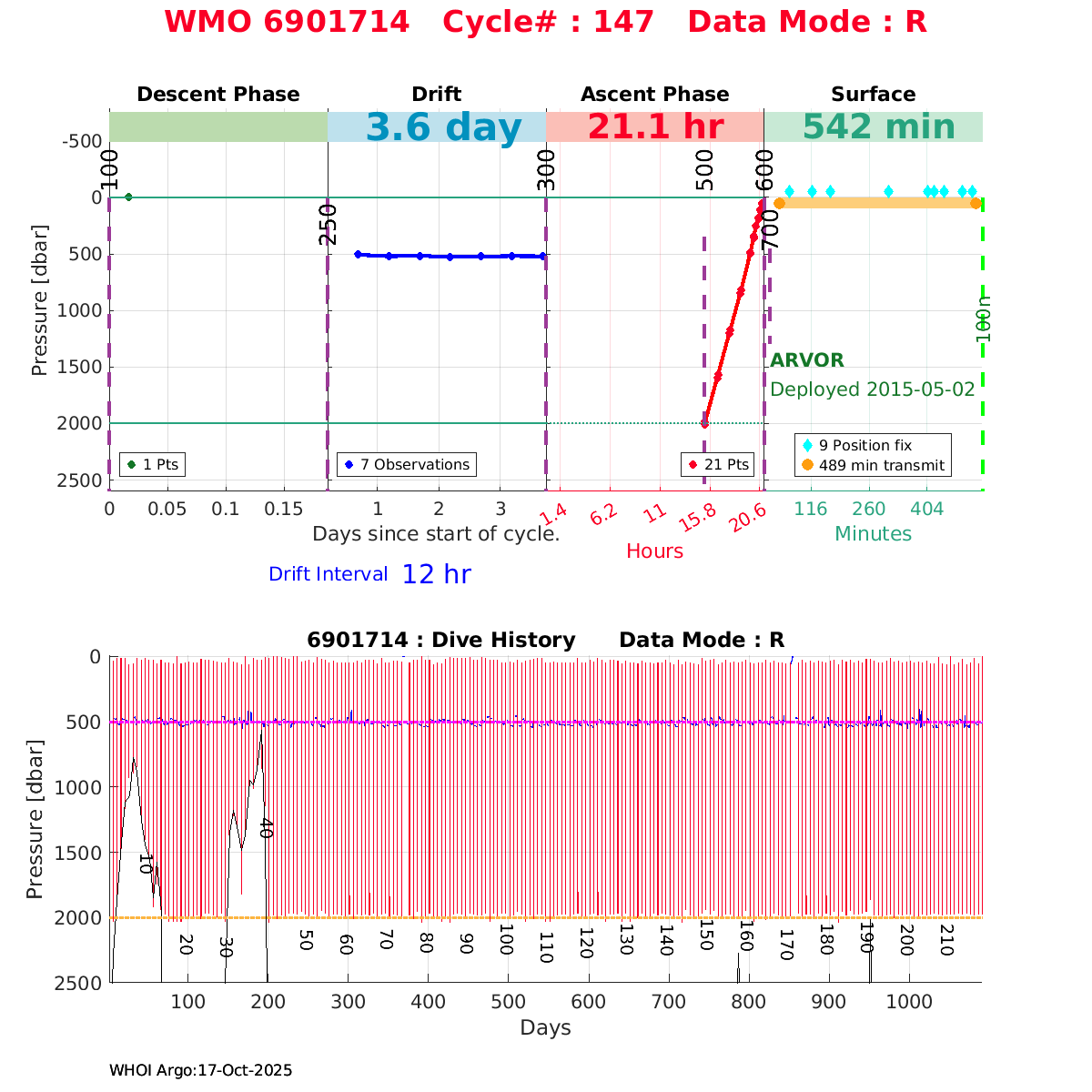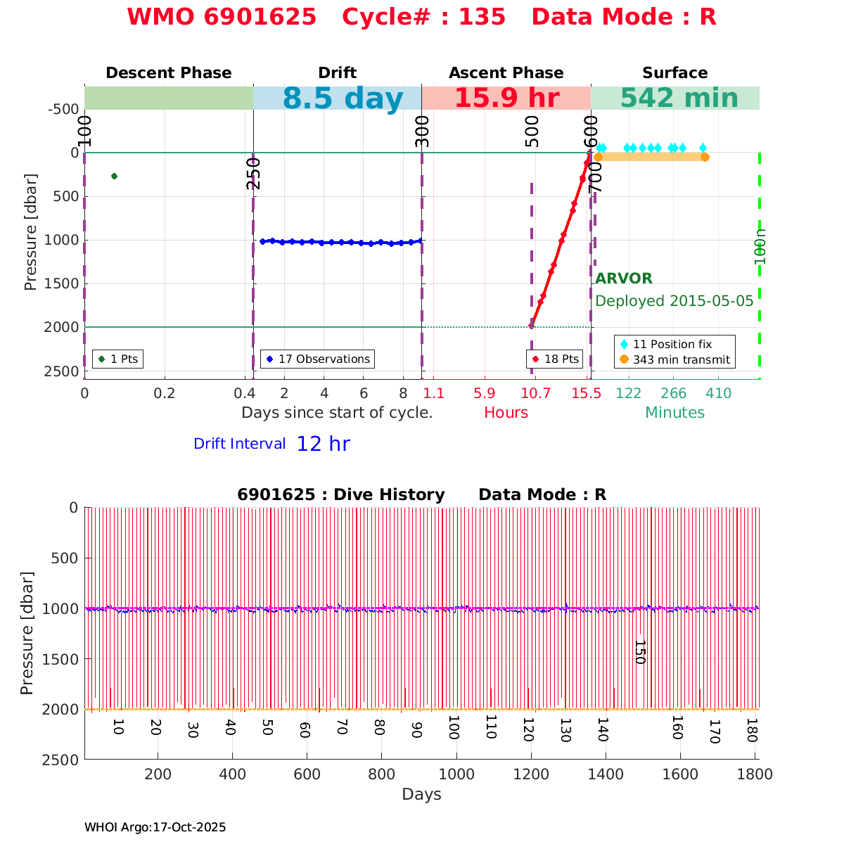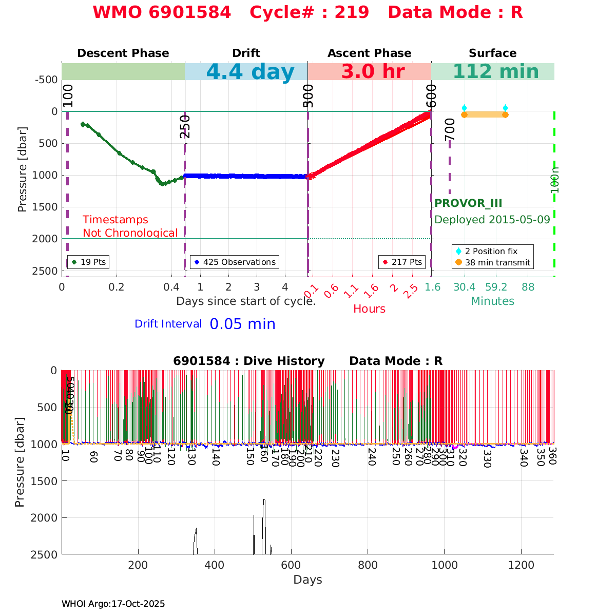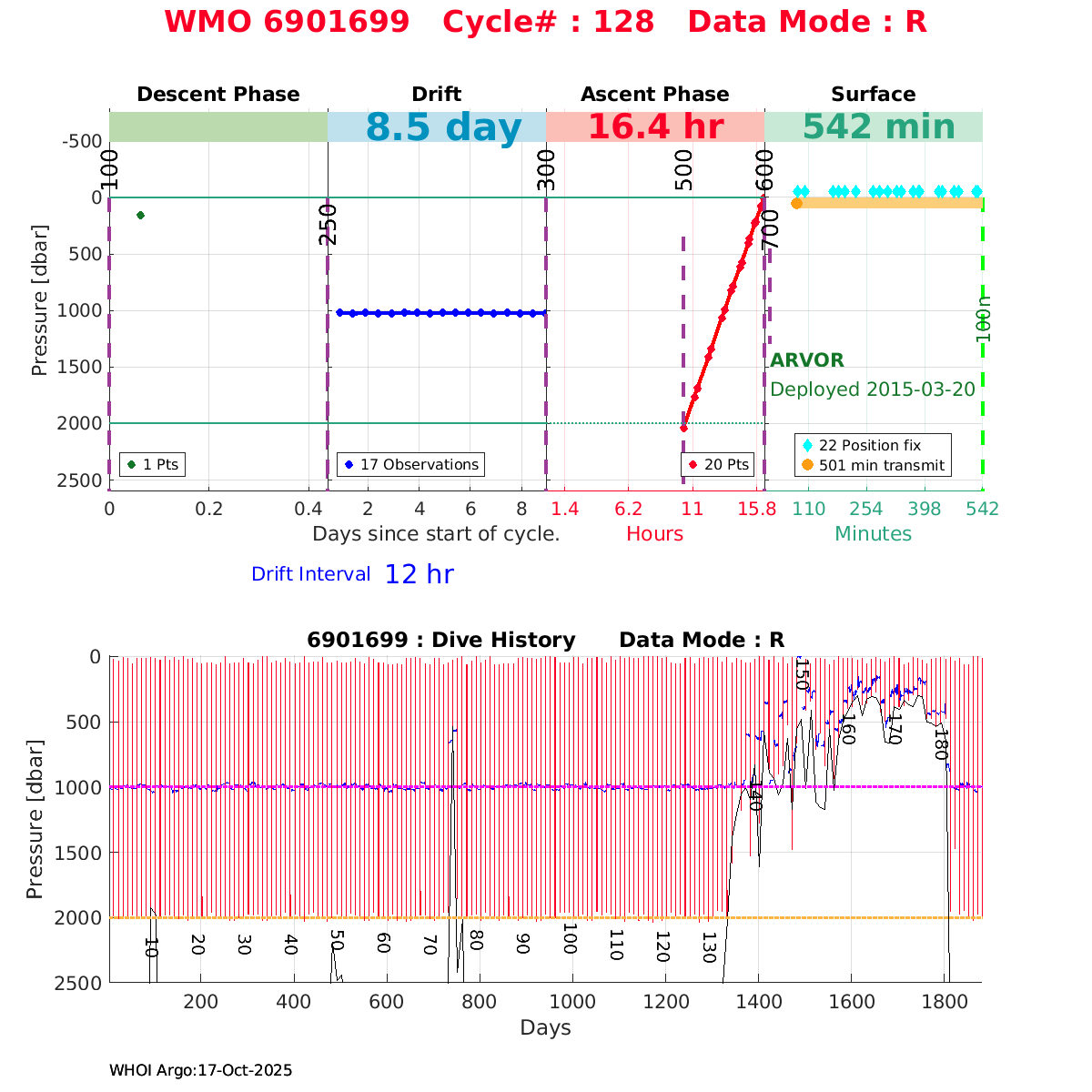| WMO: #6901730 DAC: coriolis PI: Fabien DURAND ARVOR: # FLOATCLOCK: # KISTLER_2900PSIA: #2152080 SBE41CP_V2: #6217 Altimeter Comparison (IFREMER) EuroArgo Link | ![]() |