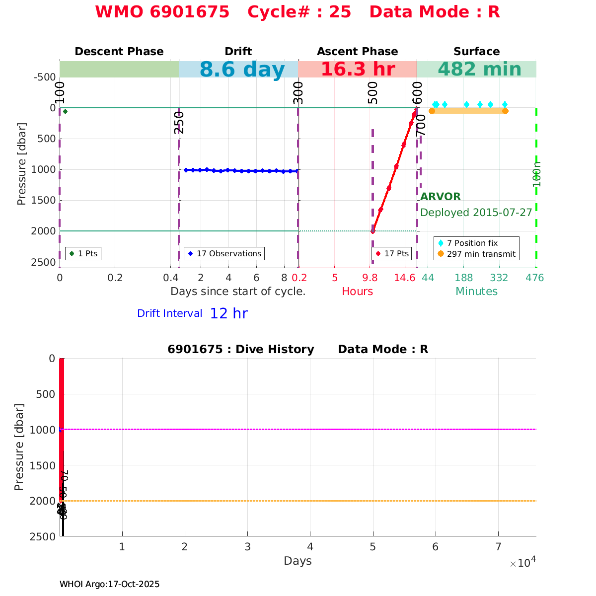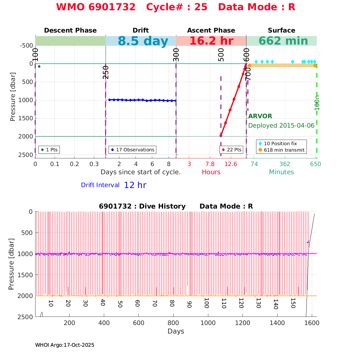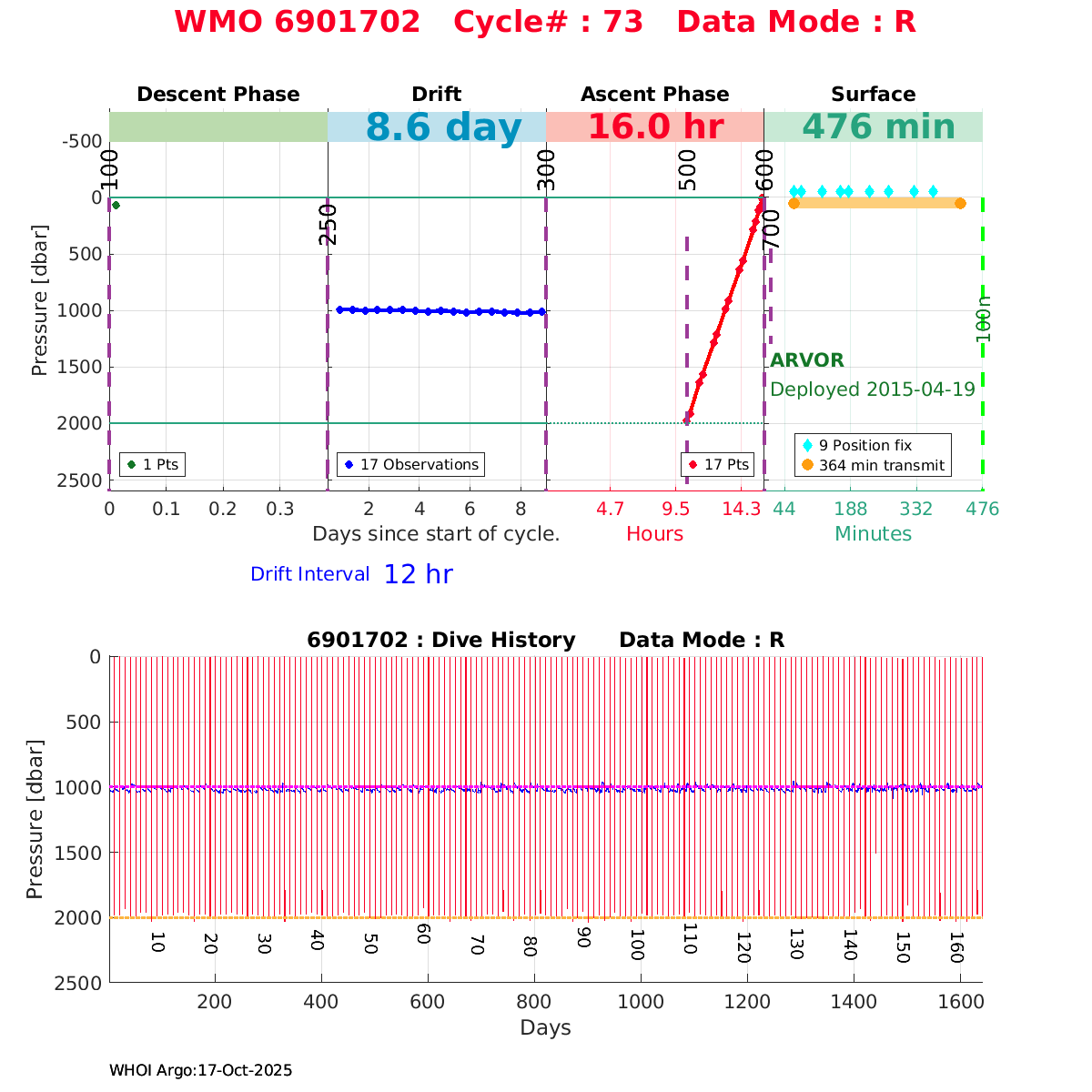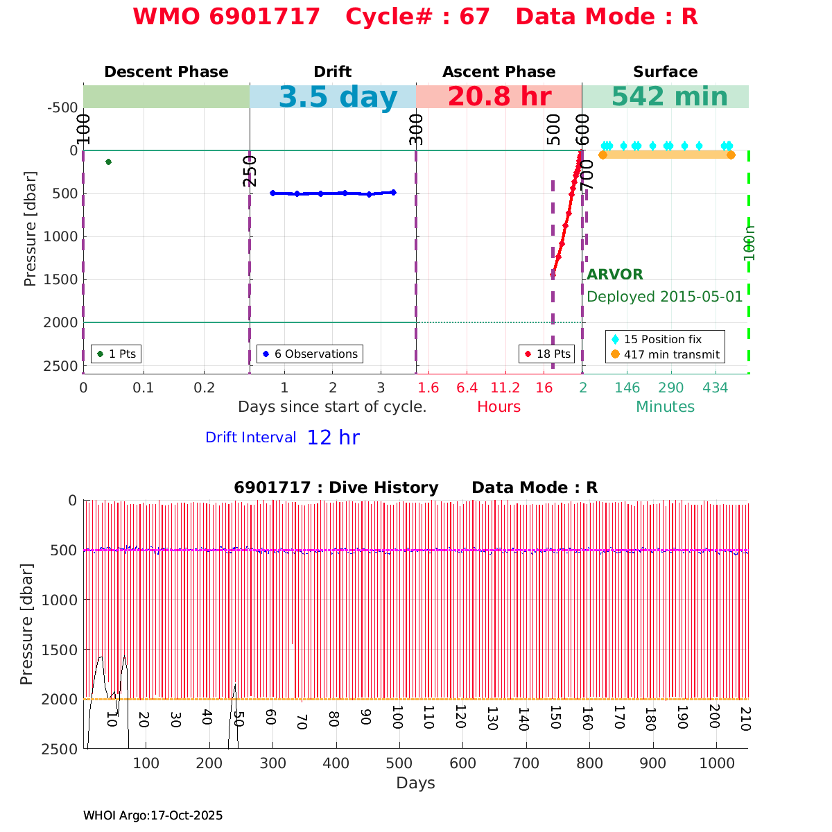 | WMO: #6901730 DAC: coriolis PI: Fabien DURAND ARVOR: # FLOATCLOCK: # KISTLER_2900PSIA: #2152080 SBE41CP_V2: #6217 Altimeter Comparison (IFREMER) EuroArgo Link | ![]() |