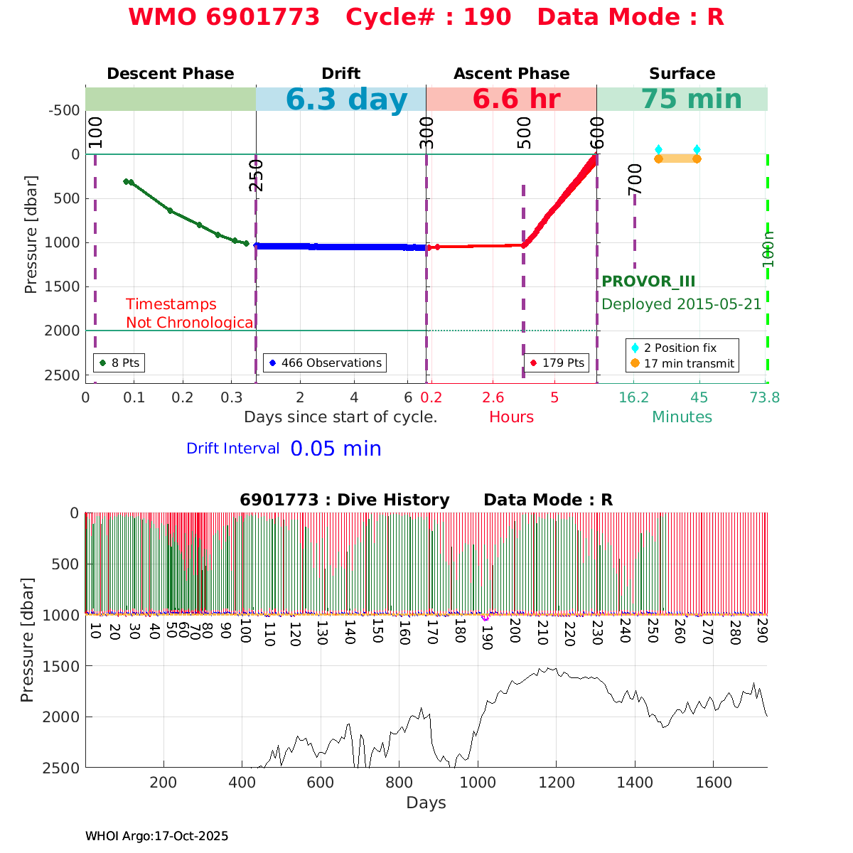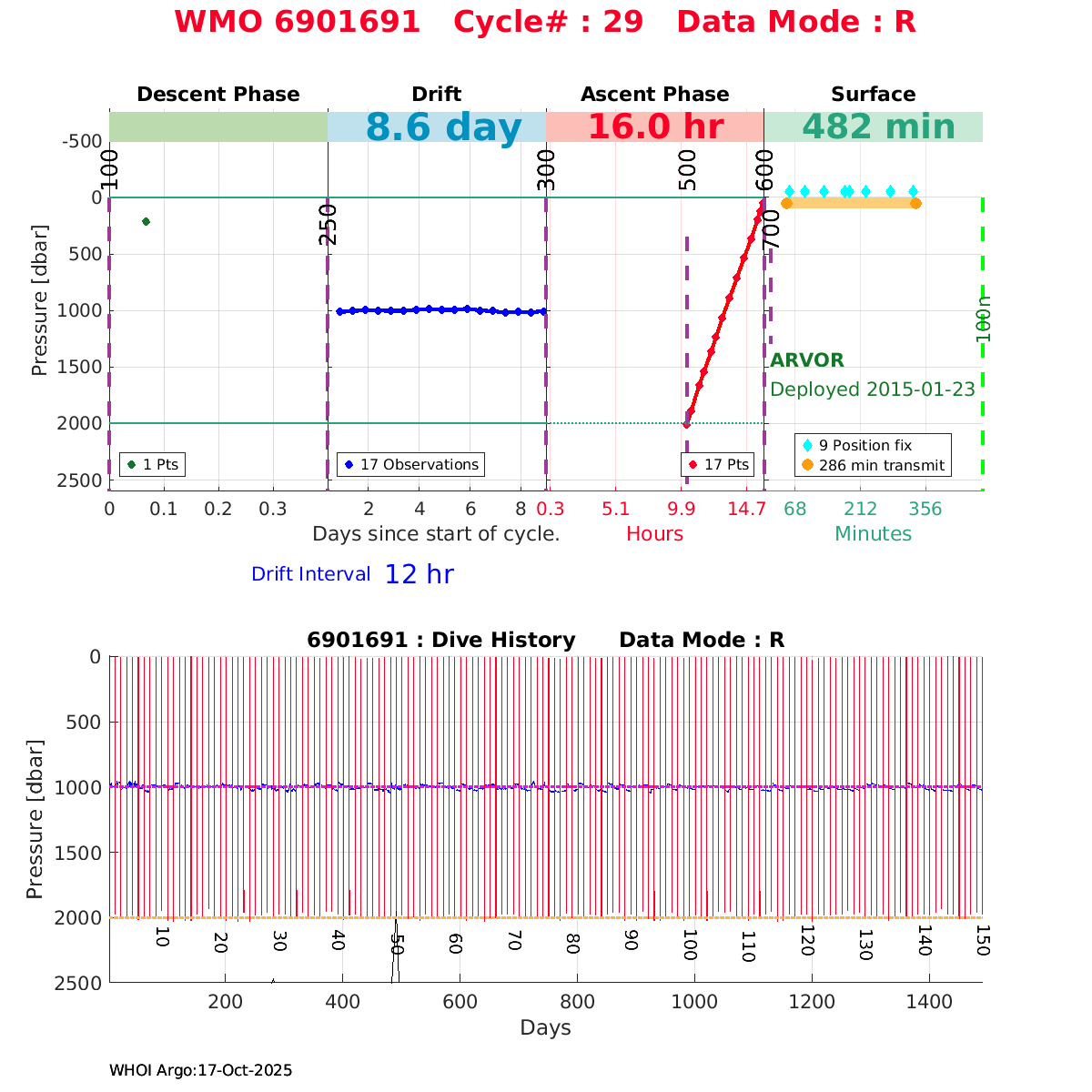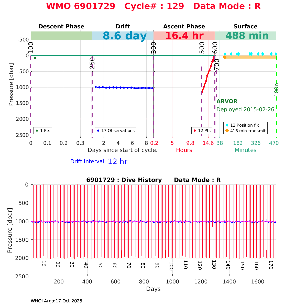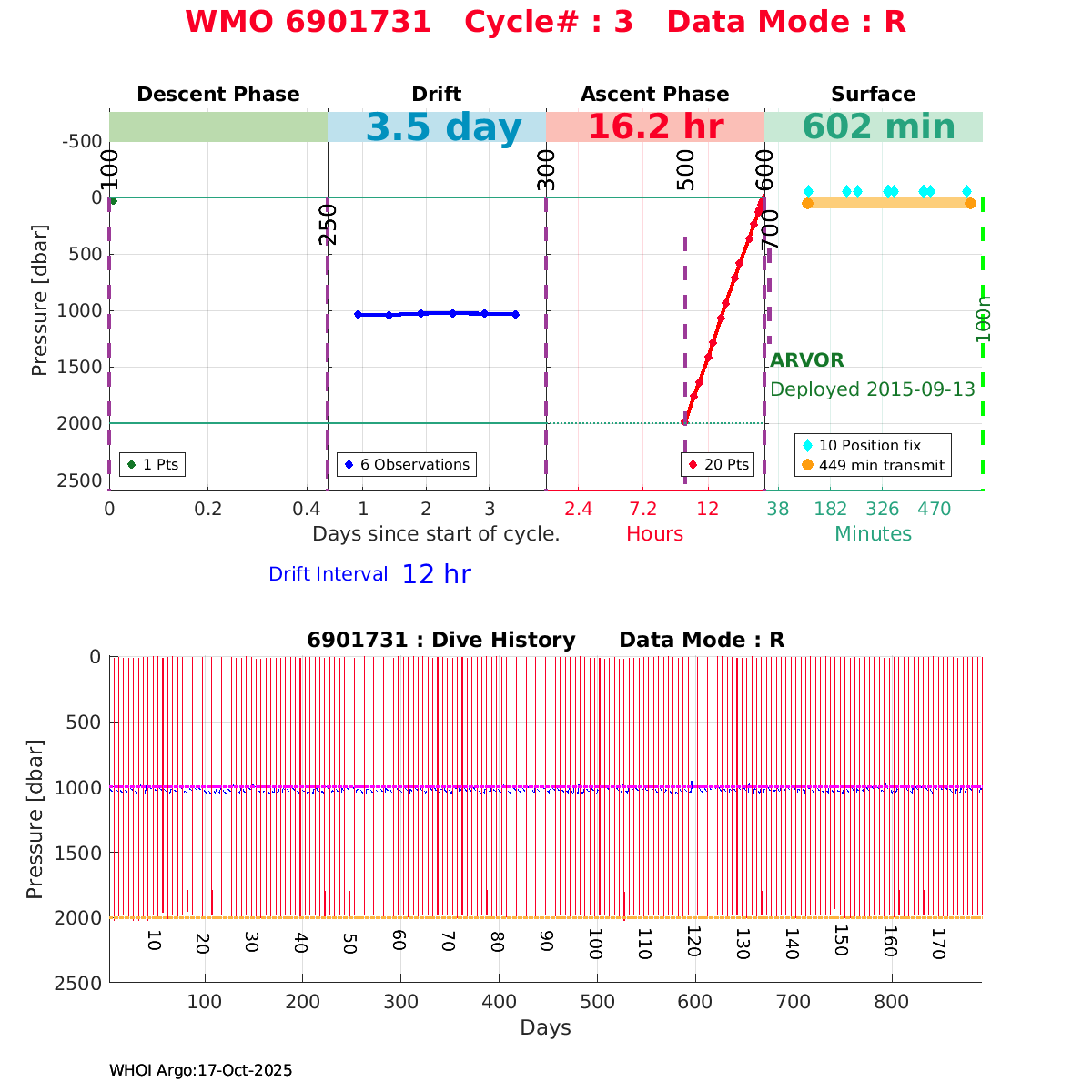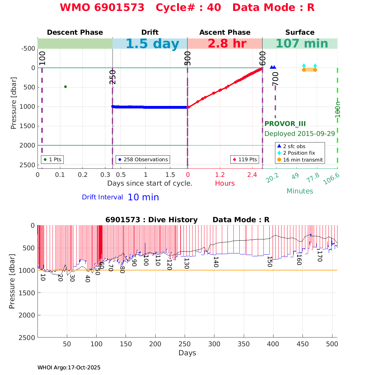 | WMO: #6901730 DAC: coriolis PI: Fabien DURAND ARVOR: # FLOATCLOCK: # KISTLER_2900PSIA: #2152080 SBE41CP_V2: #6217 Altimeter Comparison (IFREMER) EuroArgo Link | ![]() |