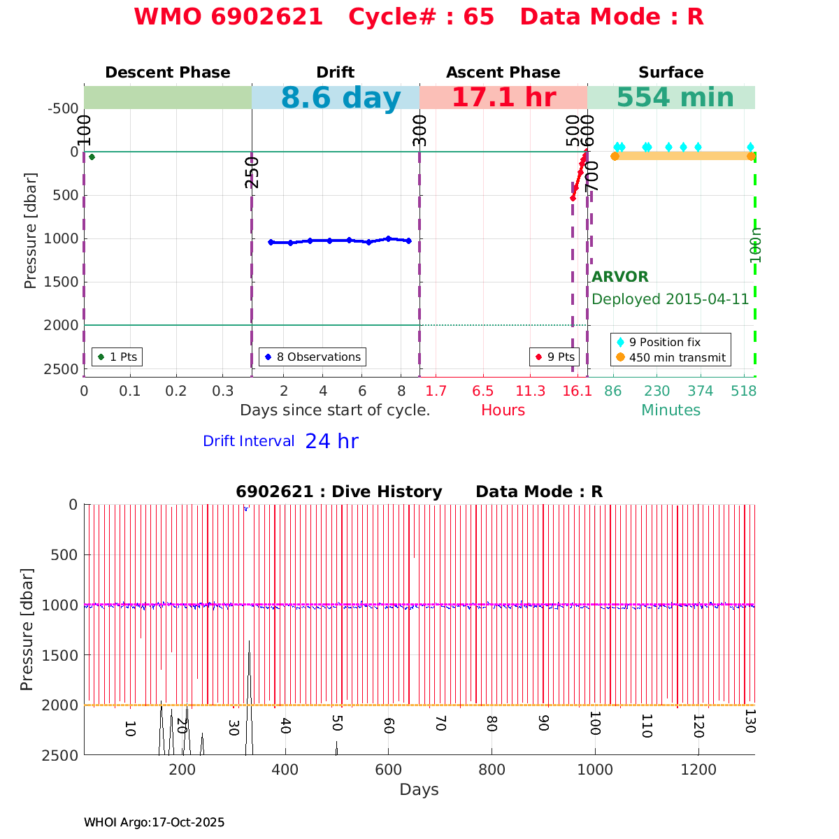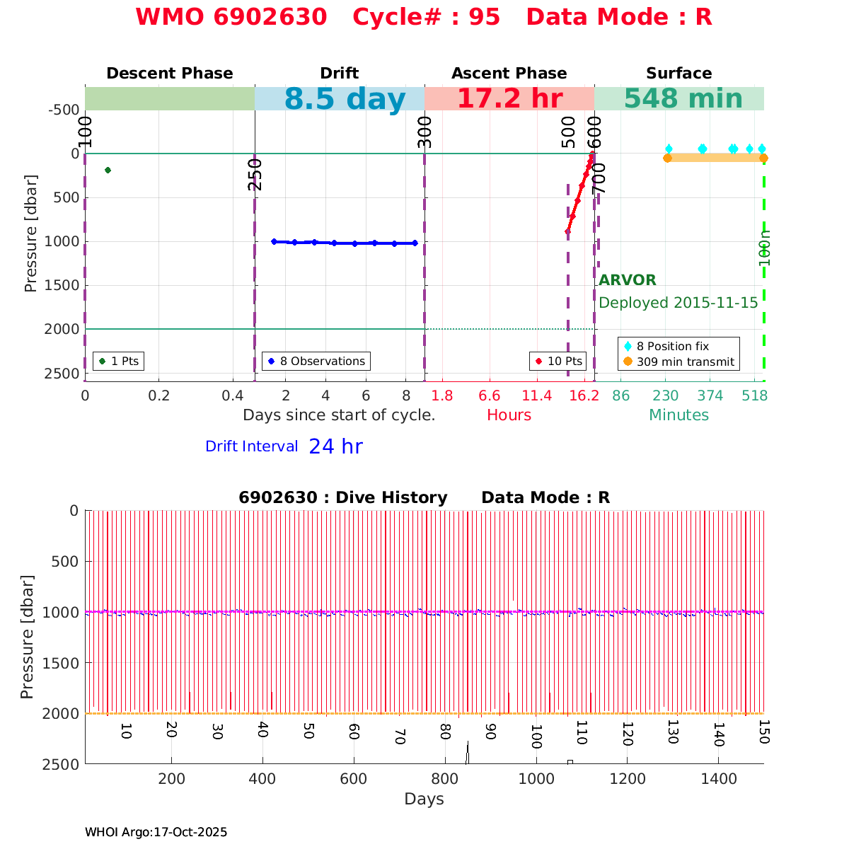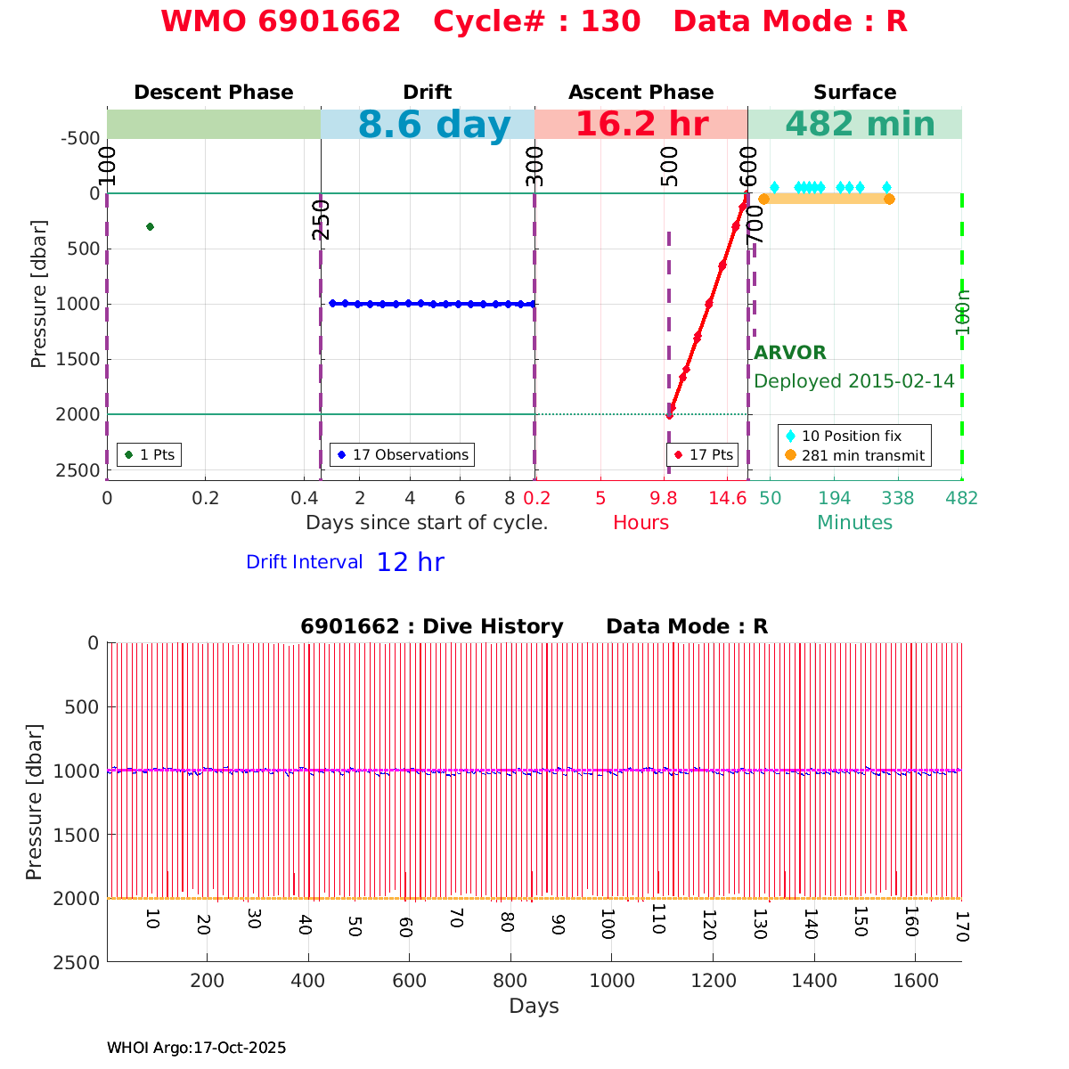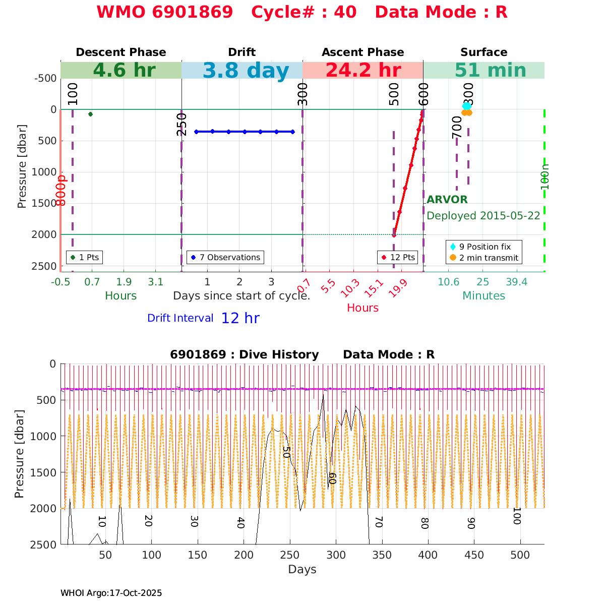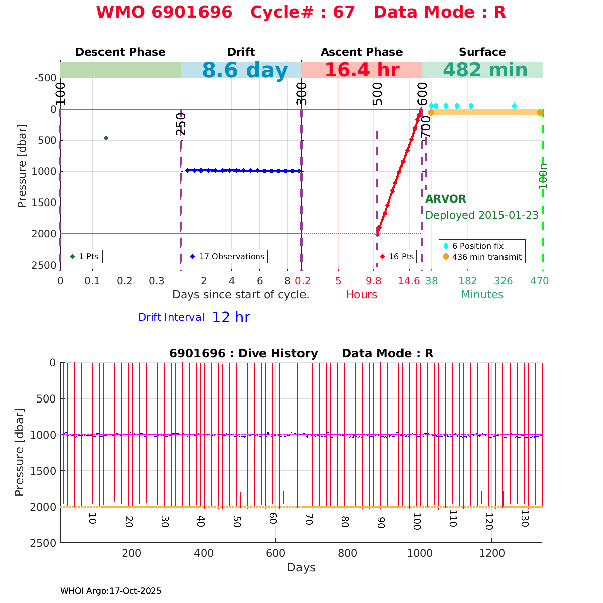 | WMO: #6901730 DAC: coriolis PI: Fabien DURAND ARVOR: # FLOATCLOCK: # KISTLER_2900PSIA: #2152080 SBE41CP_V2: #6217 Altimeter Comparison (IFREMER) EuroArgo Link | ![]() |