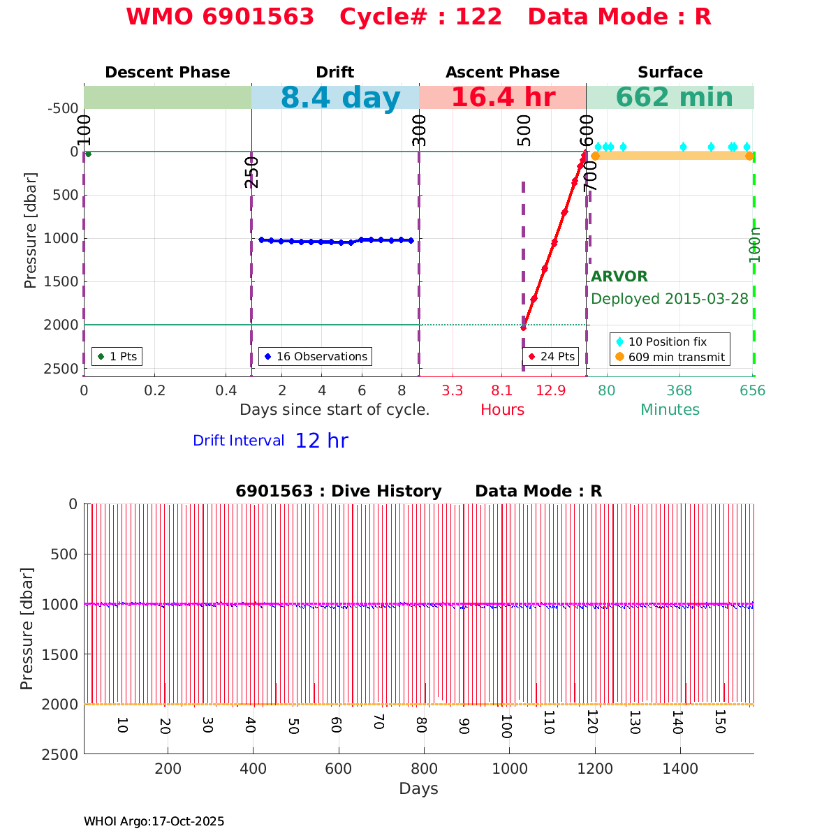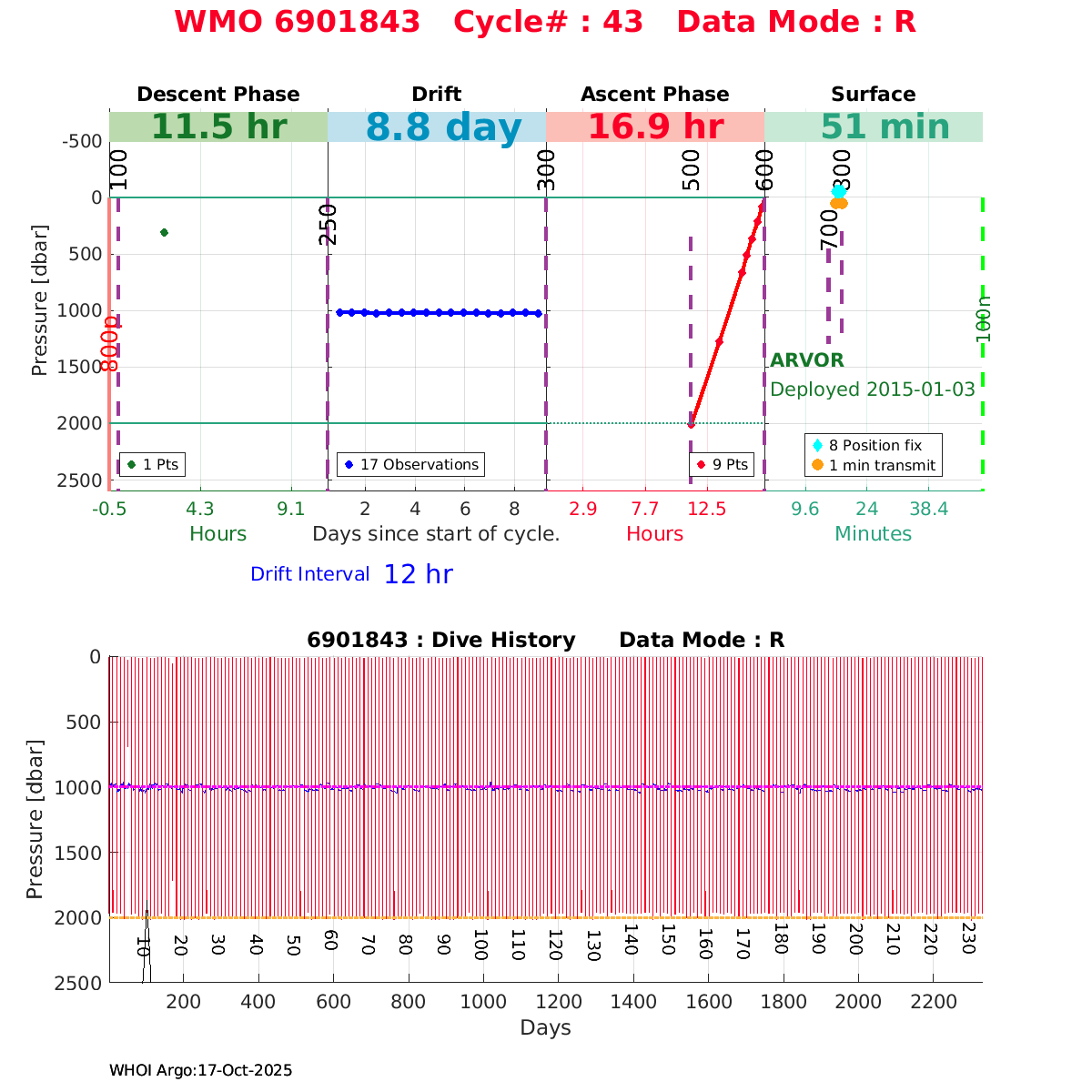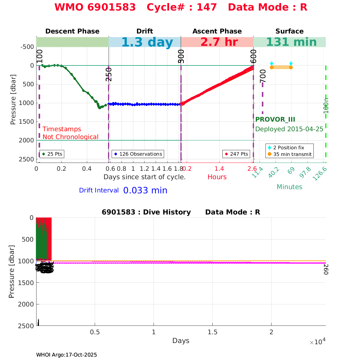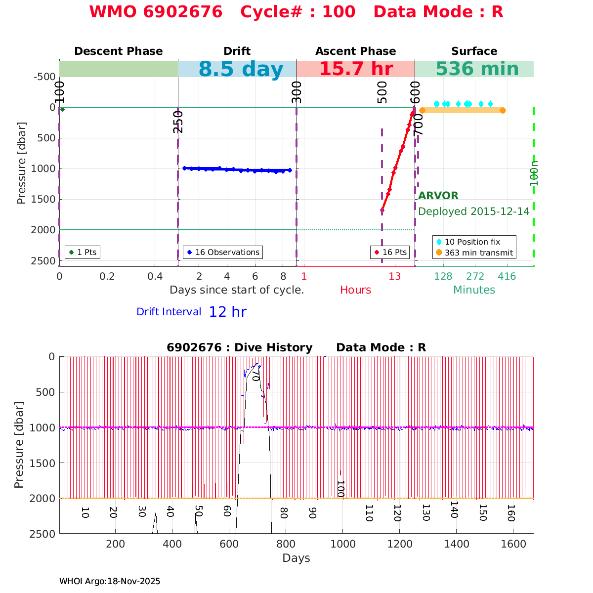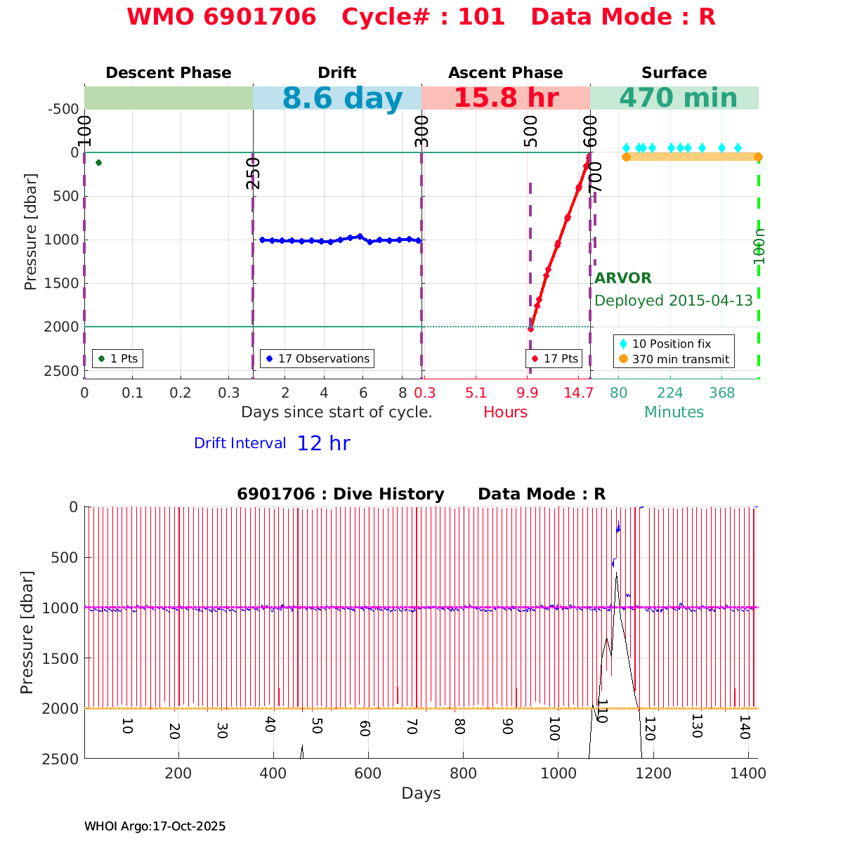 | WMO: #6901730 DAC: coriolis PI: Fabien DURAND ARVOR: # FLOATCLOCK: # KISTLER_2900PSIA: #2152080 SBE41CP_V2: #6217 Altimeter Comparison (IFREMER) EuroArgo Link | ![]() |
