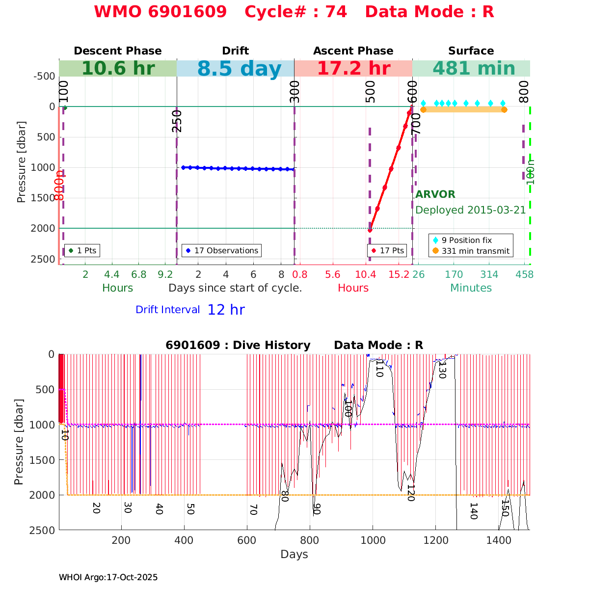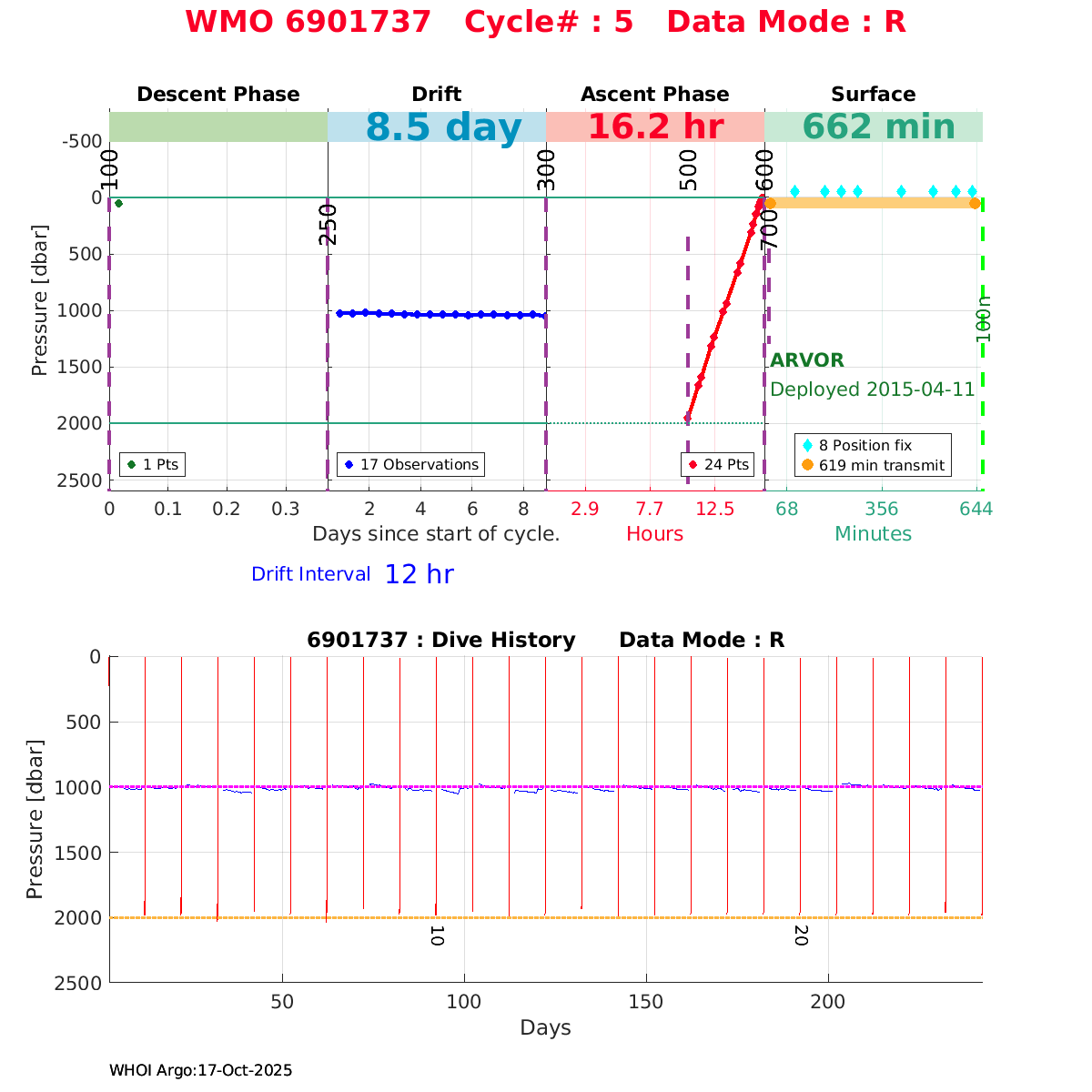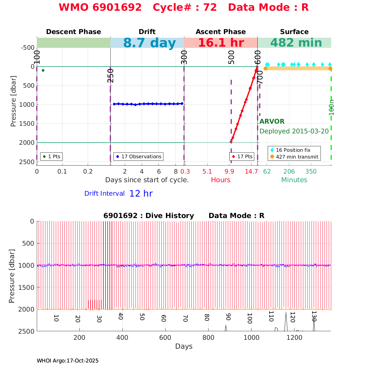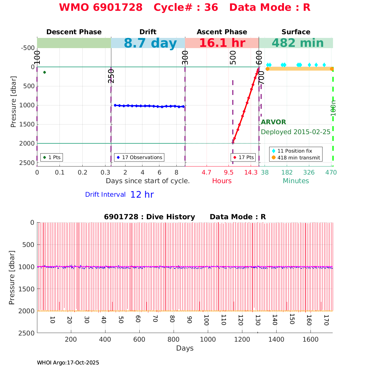 | WMO: #6901730 DAC: coriolis PI: Fabien DURAND ARVOR: # FLOATCLOCK: # KISTLER_2900PSIA: #2152080 SBE41CP_V2: #6217 Altimeter Comparison (IFREMER) EuroArgo Link | ![]() |