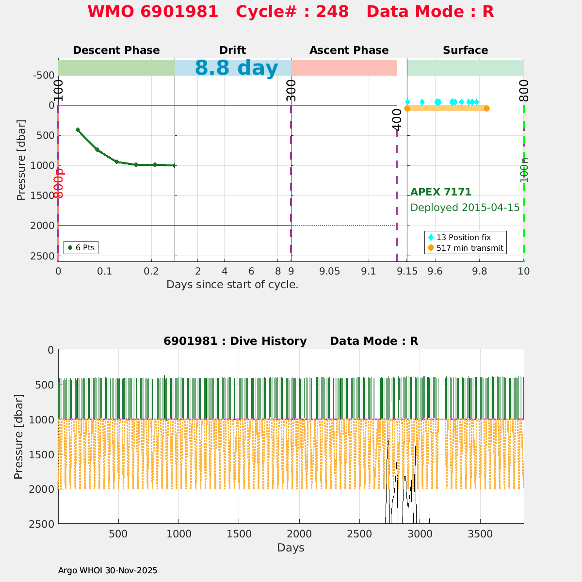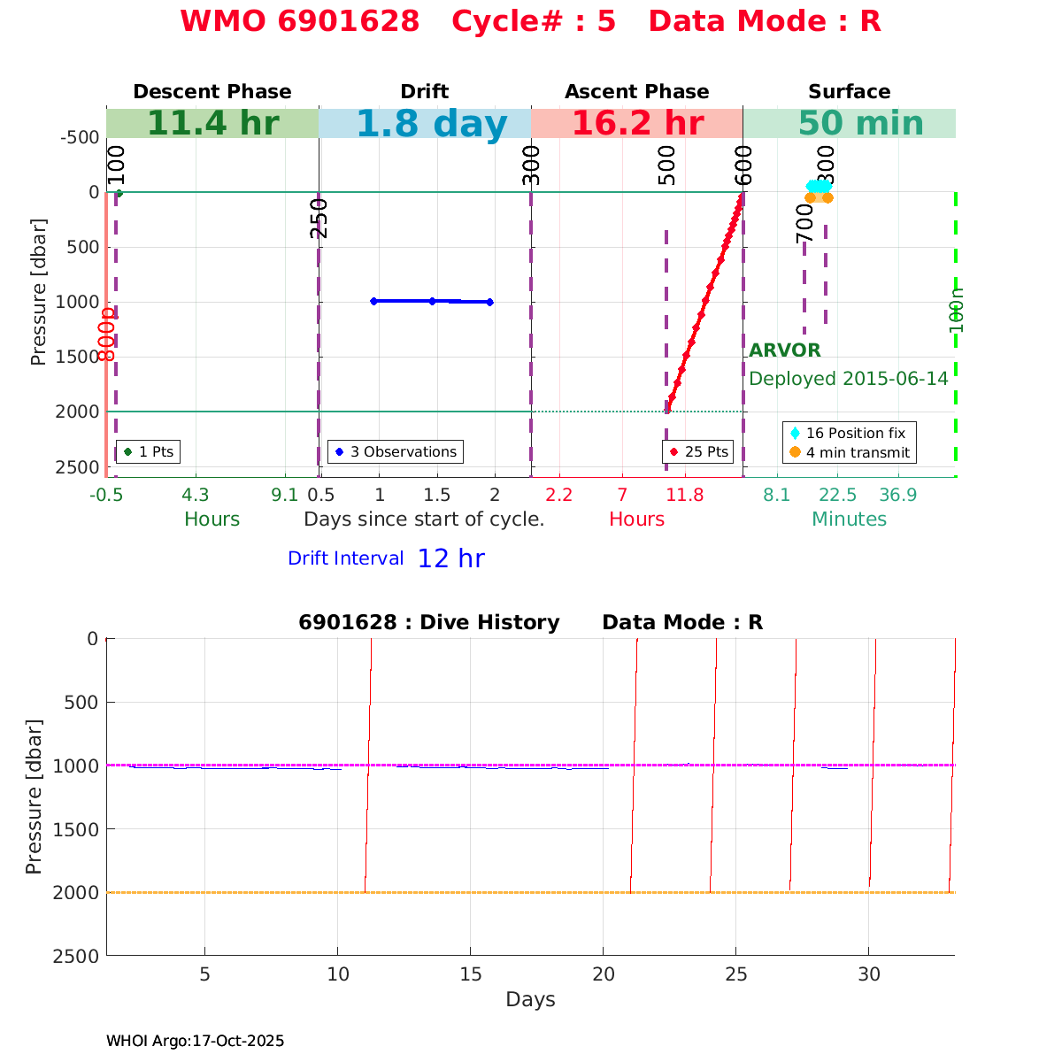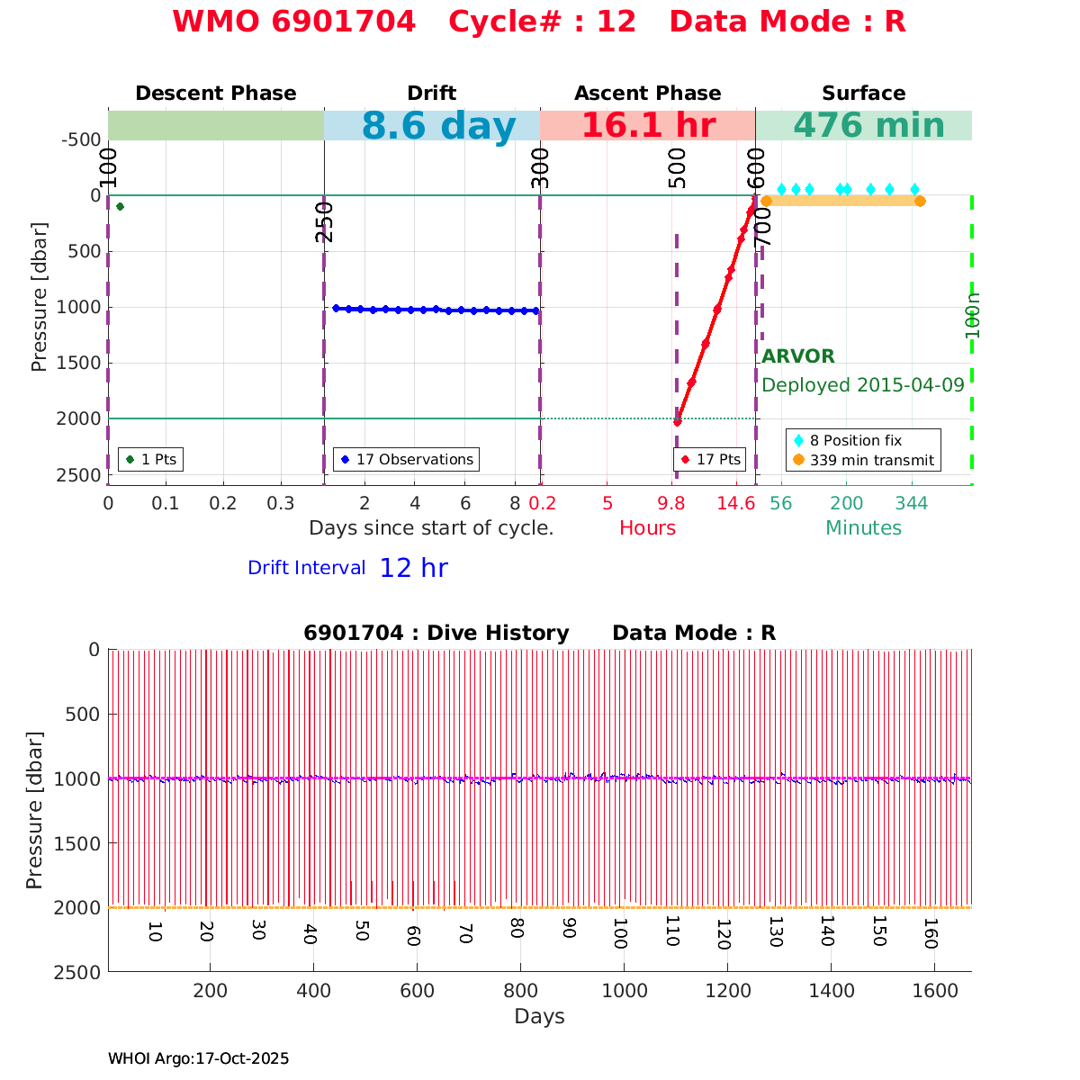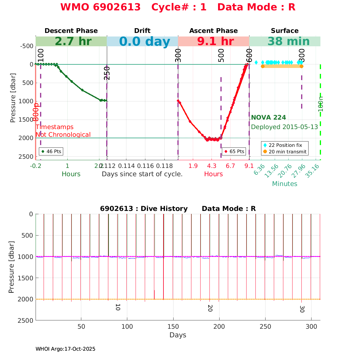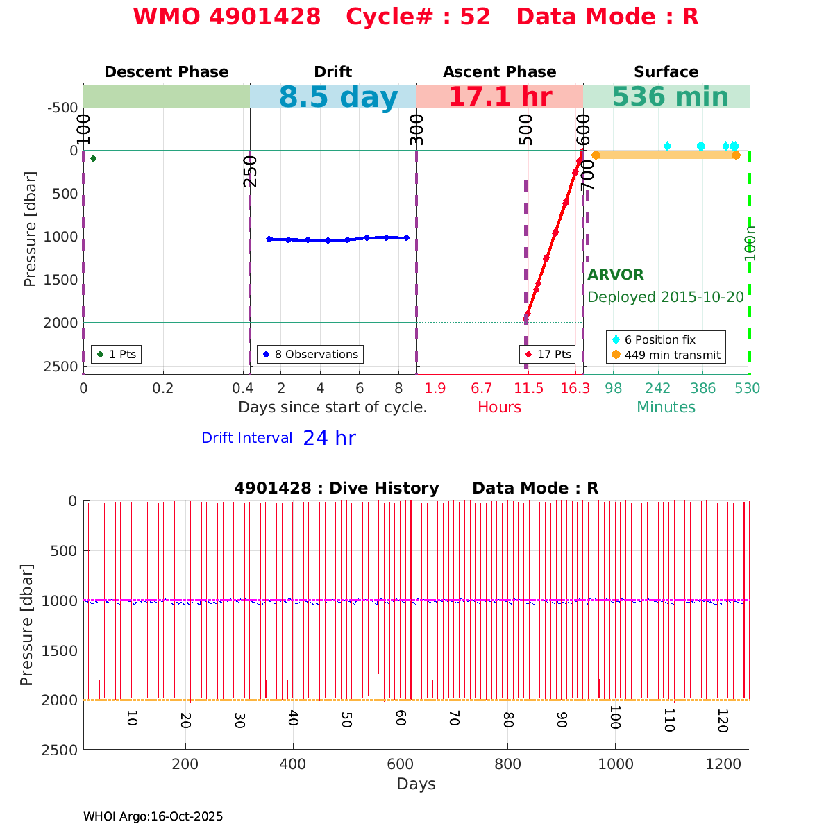 | WMO: #6901730 DAC: coriolis PI: Fabien DURAND ARVOR: # FLOATCLOCK: # KISTLER_2900PSIA: #2152080 SBE41CP_V2: #6217 Altimeter Comparison (IFREMER) EuroArgo Link | ![]() |