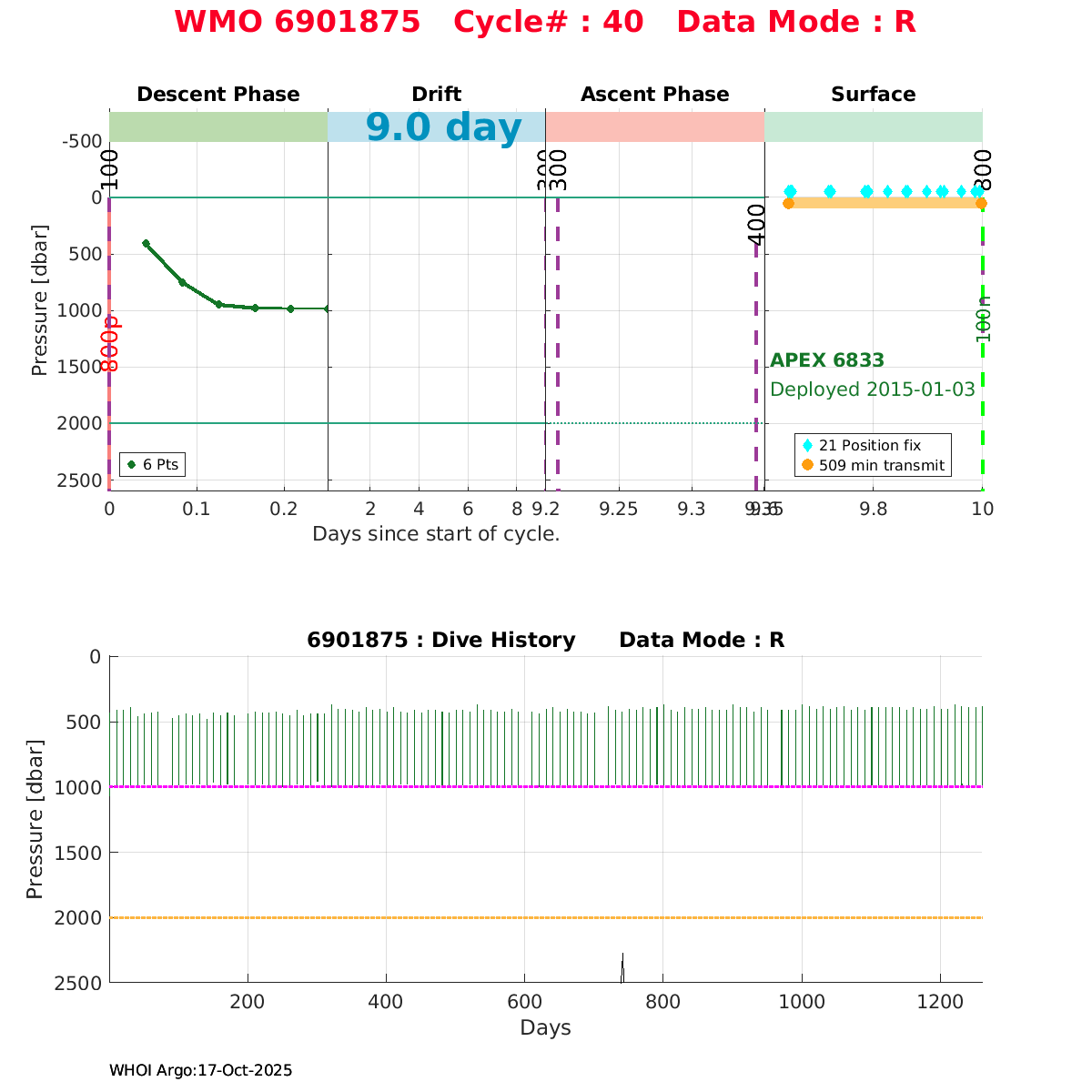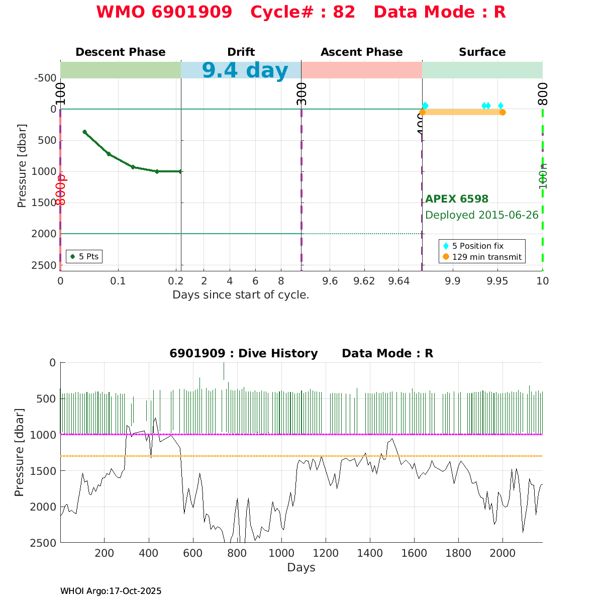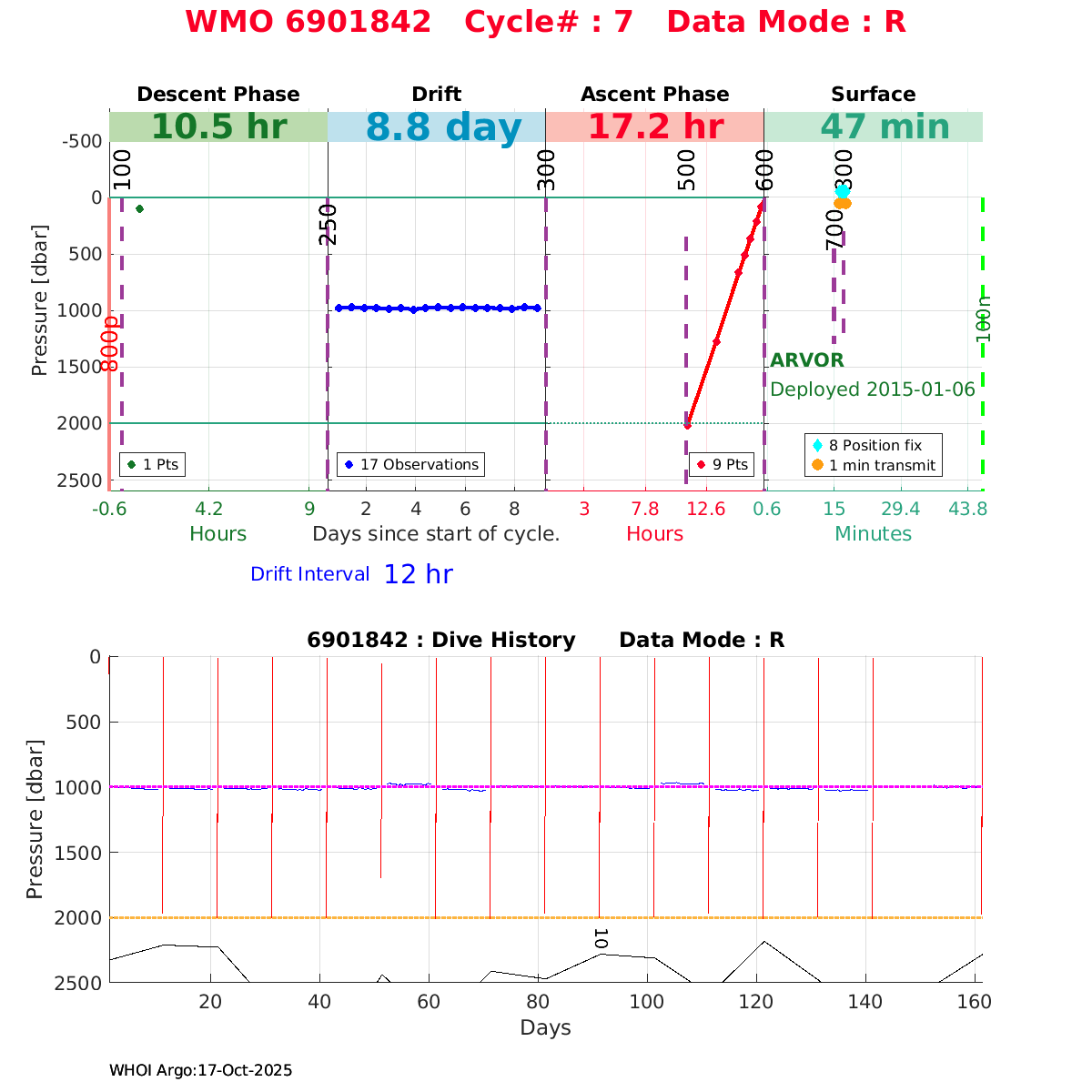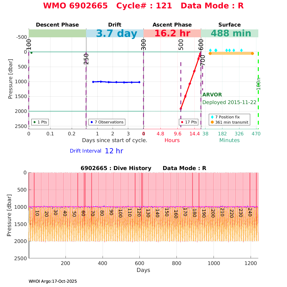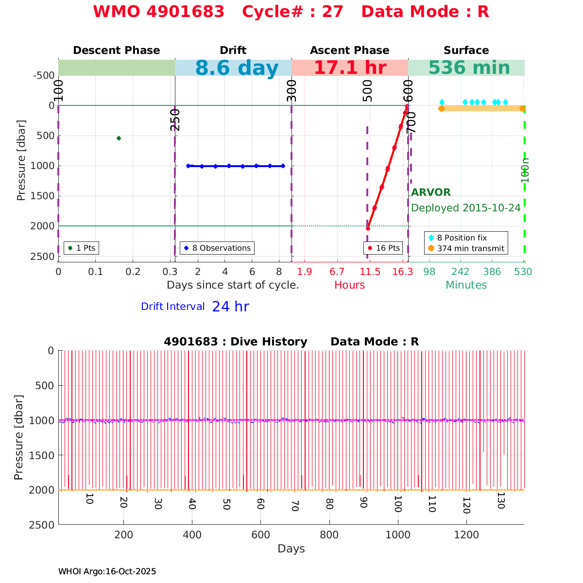 | WMO: #6901875 DAC: coriolis PI: Pierre-Marie POULAIN APEX: #6833 DRUCK_2900PSIA: #3628273 SBE41: #6303 Altimeter Comparison (IFREMER) EuroArgo Link | ![]() |