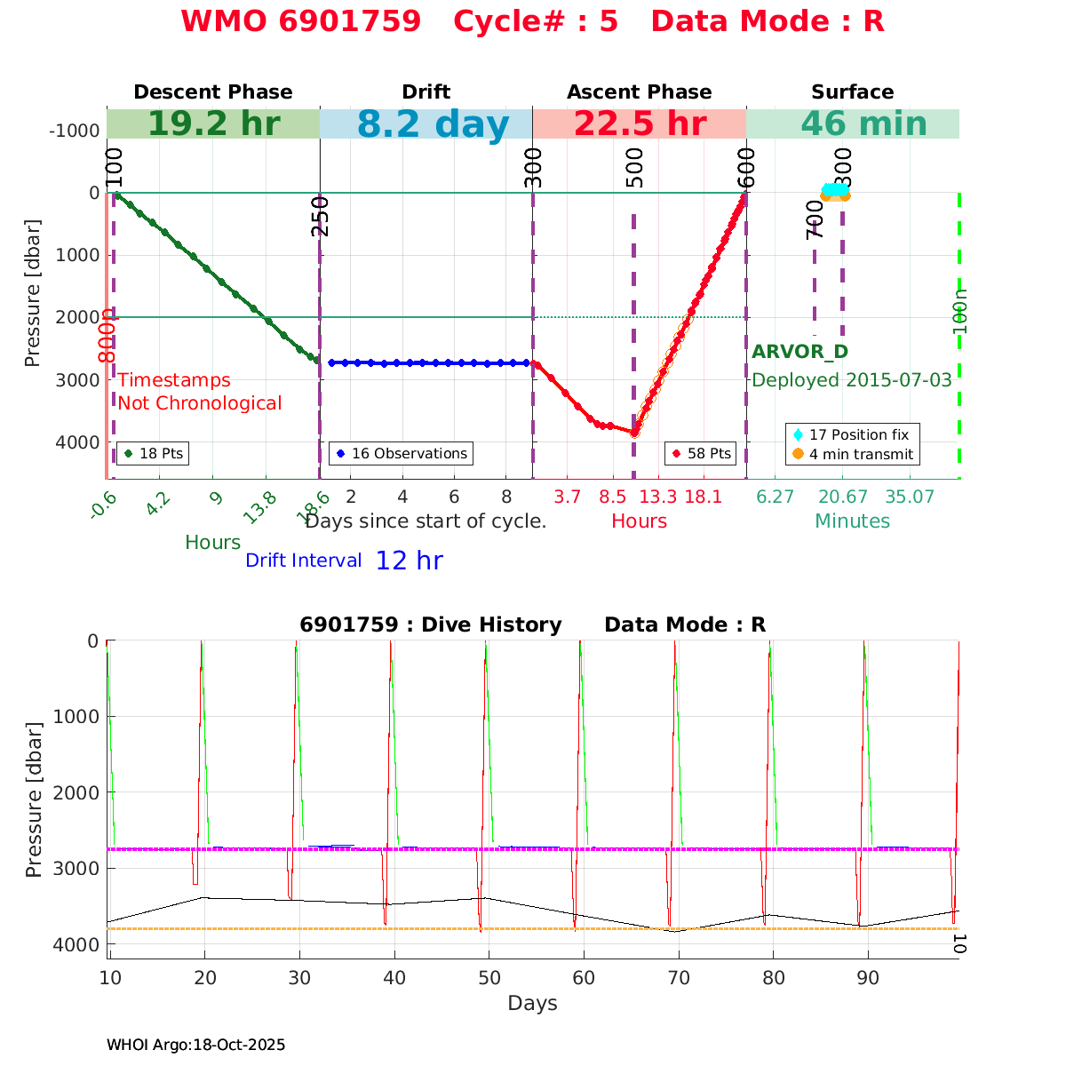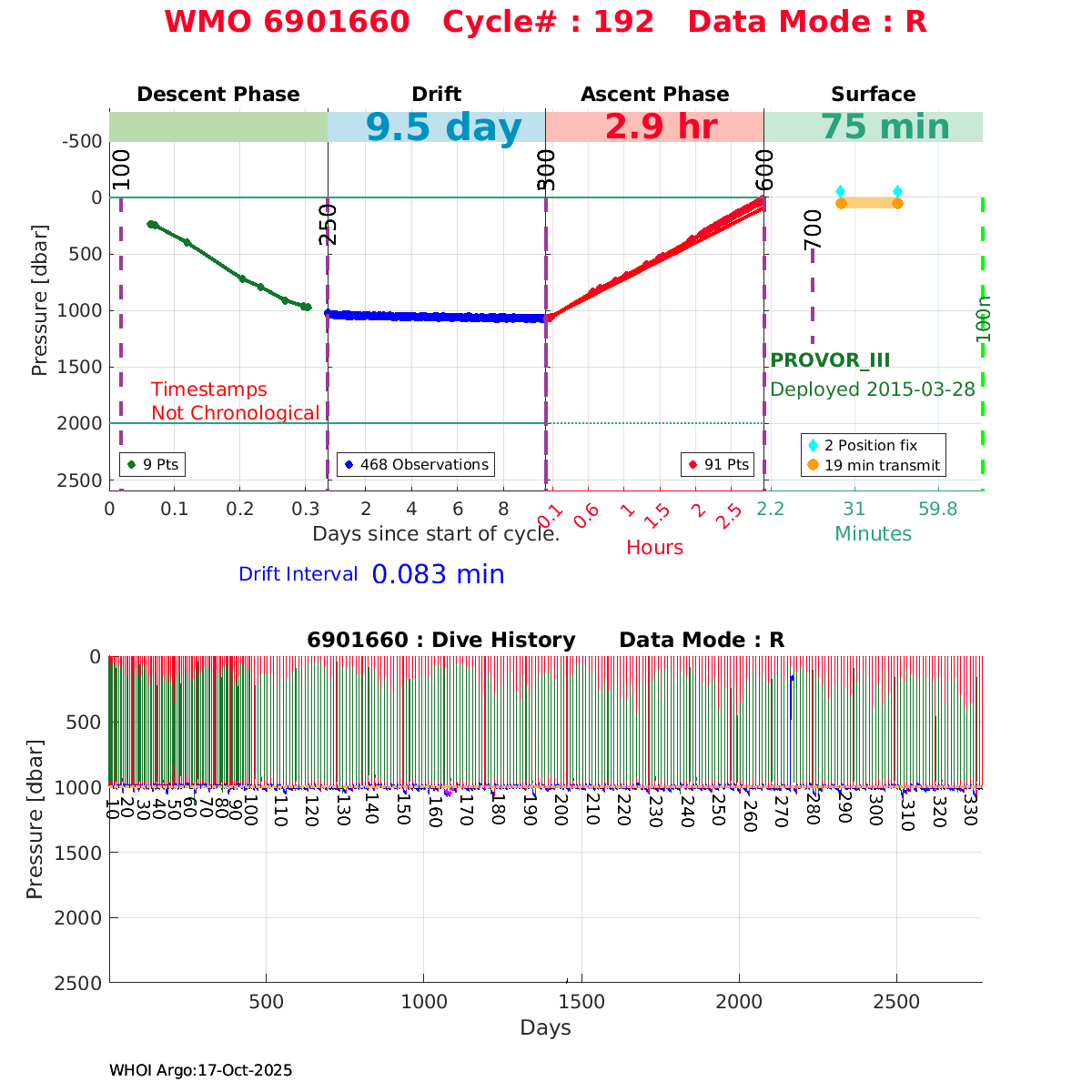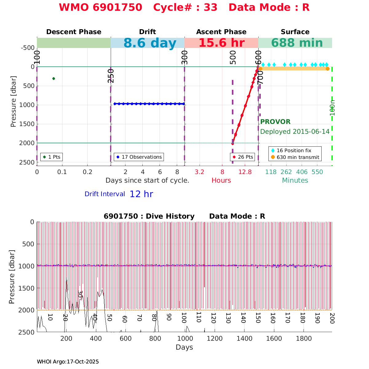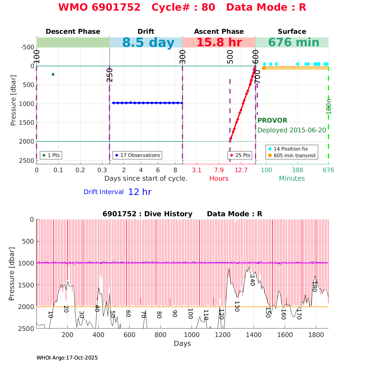 | WMO: #6901875 DAC: coriolis PI: Pierre-Marie POULAIN APEX: #6833 DRUCK_2900PSIA: #3628273 SBE41: #6303 Altimeter Comparison (IFREMER) EuroArgo Link | ![]() |