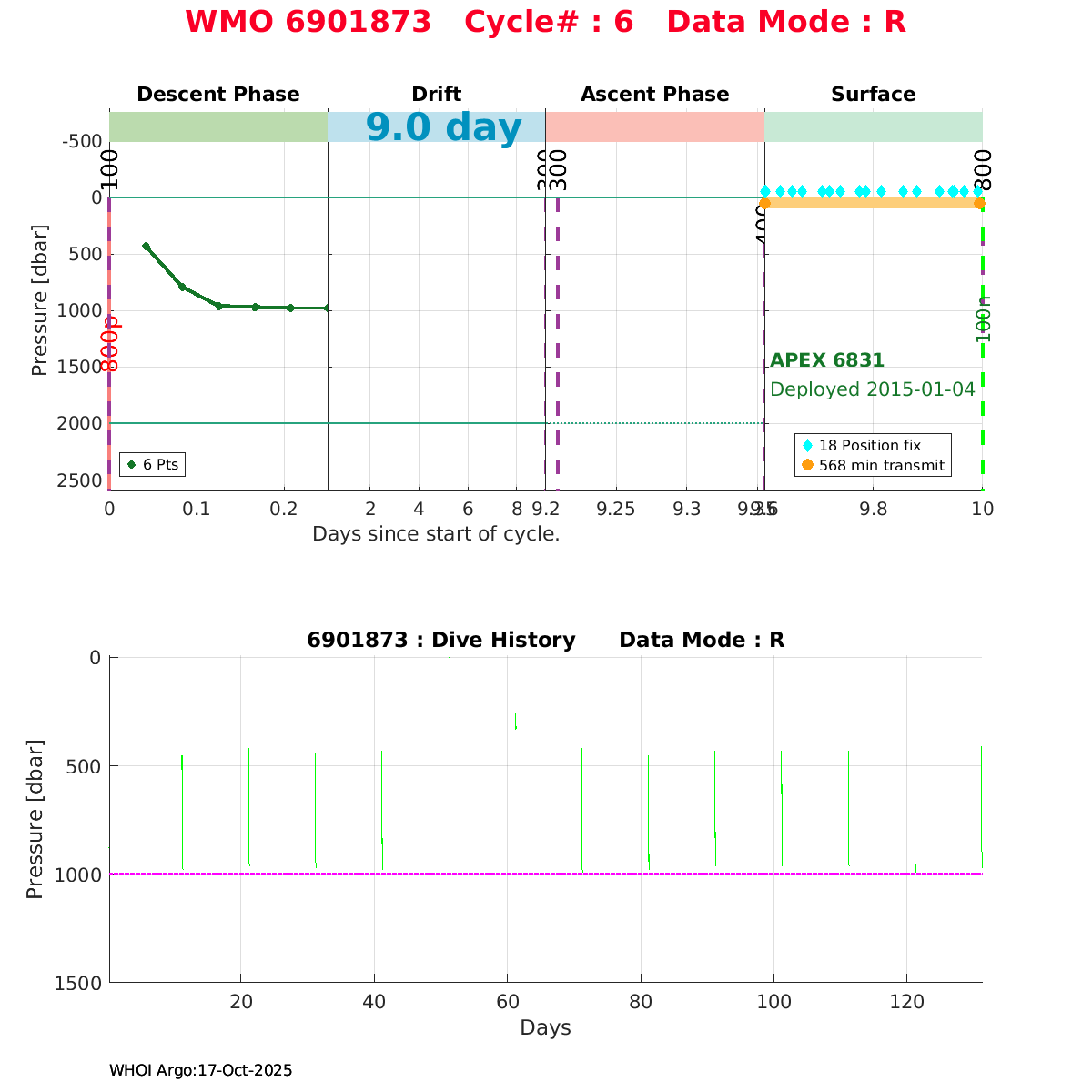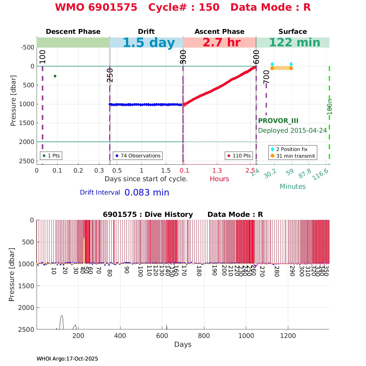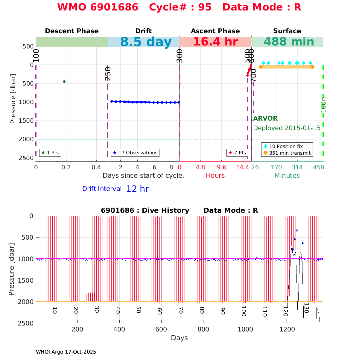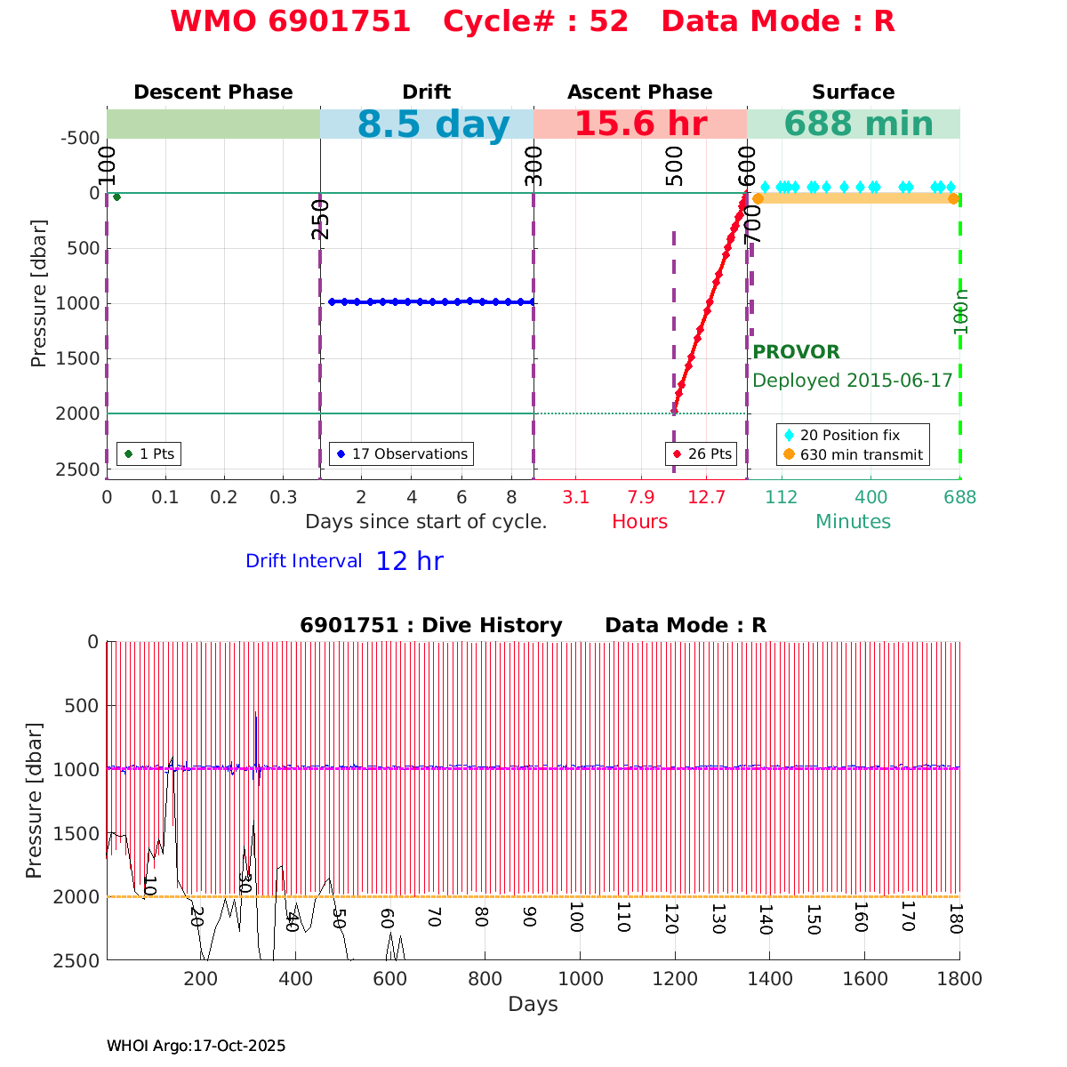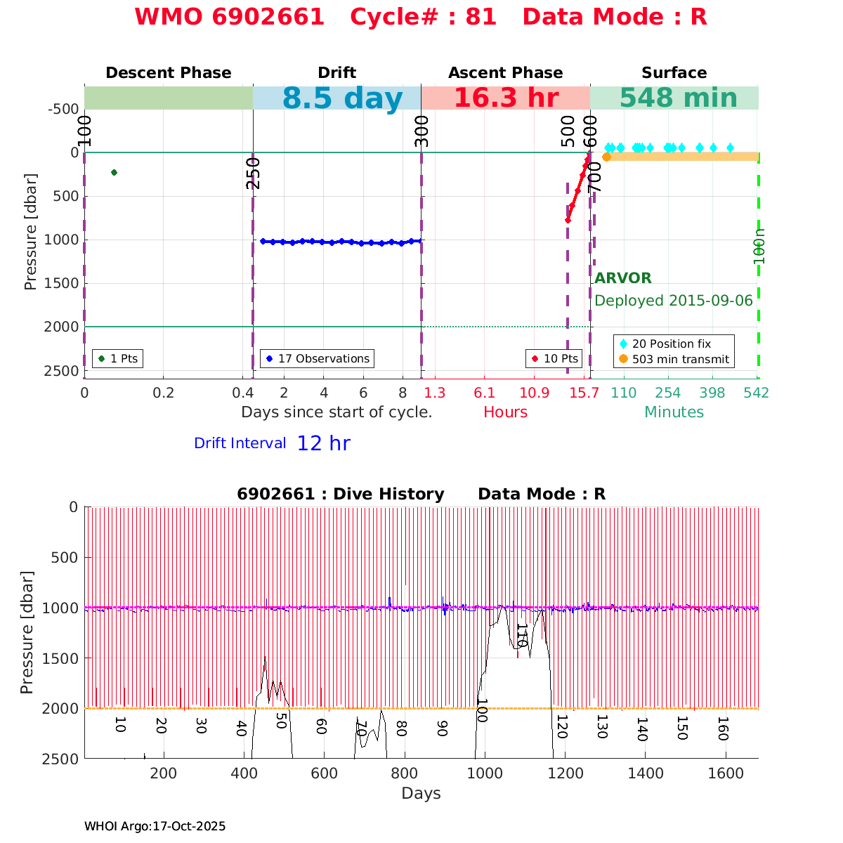 | WMO: #6901875 DAC: coriolis PI: Pierre-Marie POULAIN APEX: #6833 DRUCK_2900PSIA: #3628273 SBE41: #6303 Altimeter Comparison (IFREMER) EuroArgo Link | ![]() |