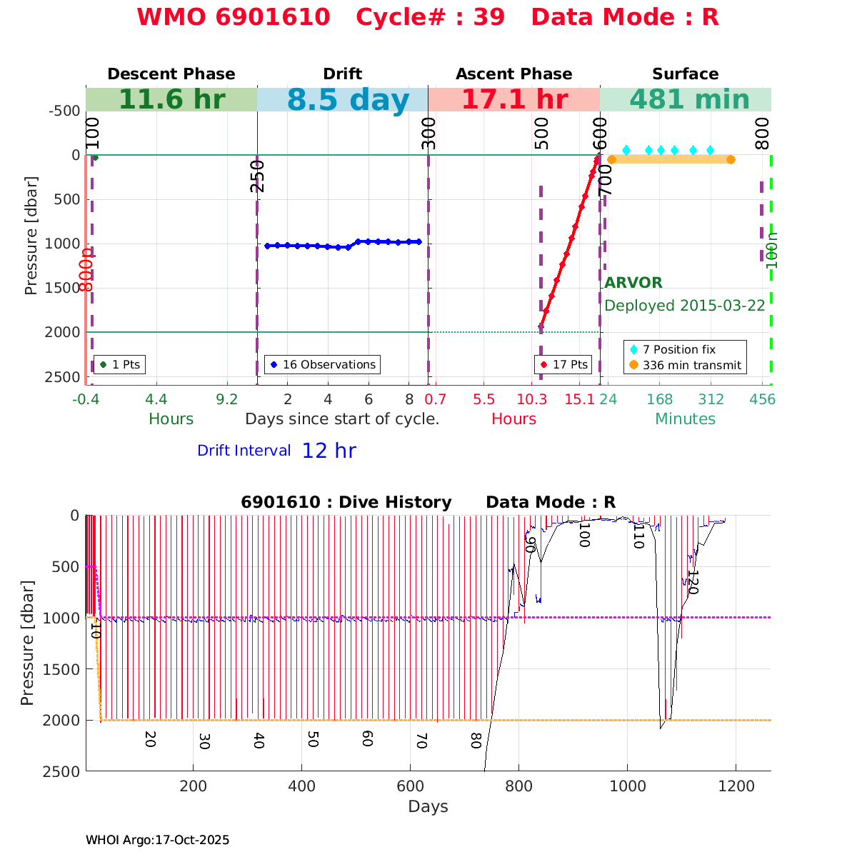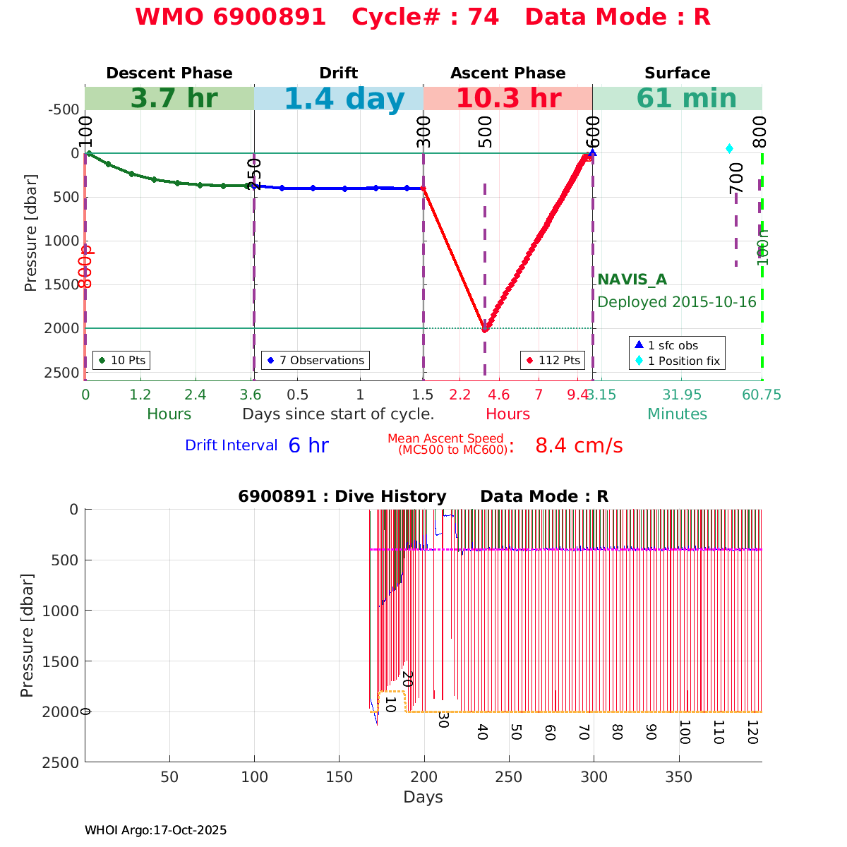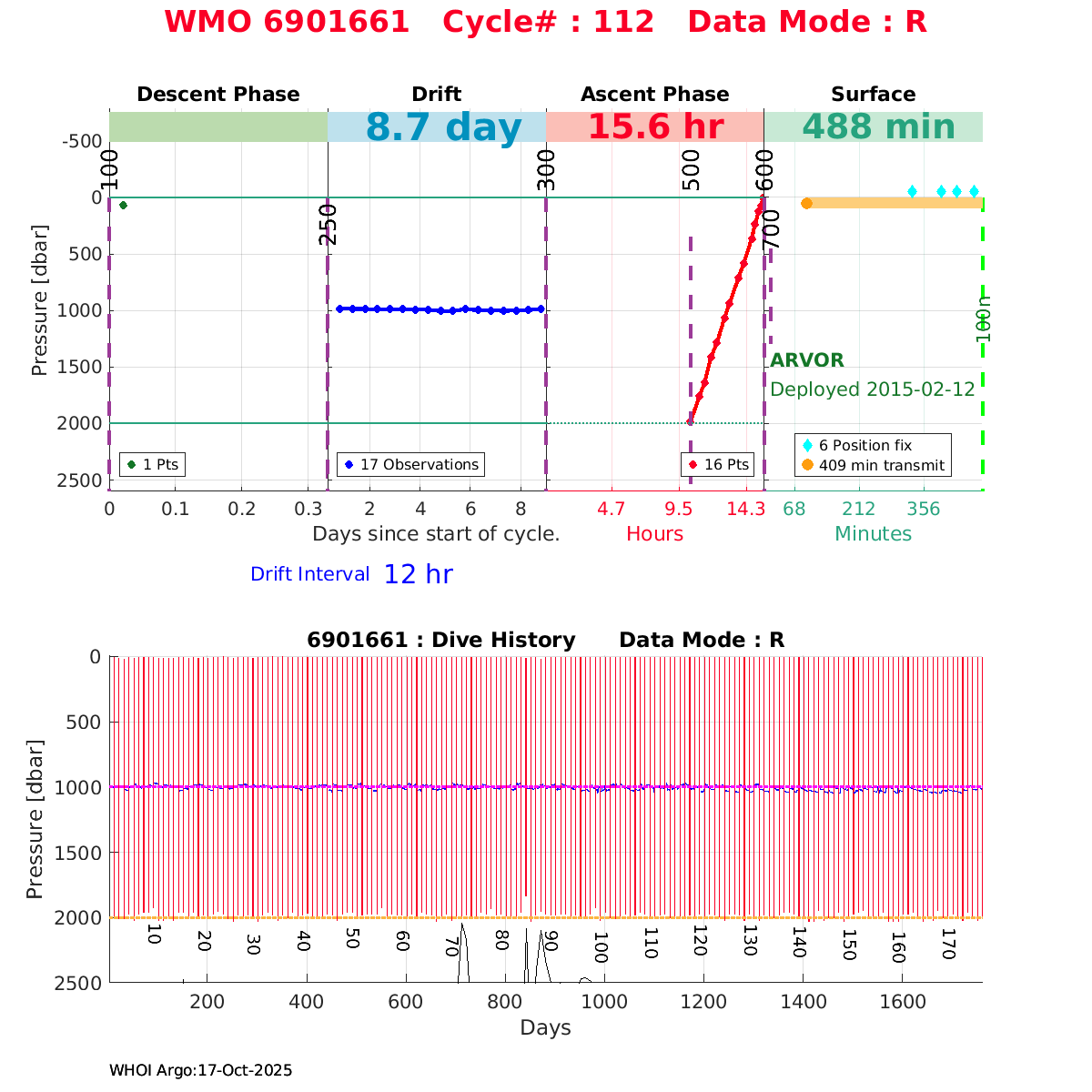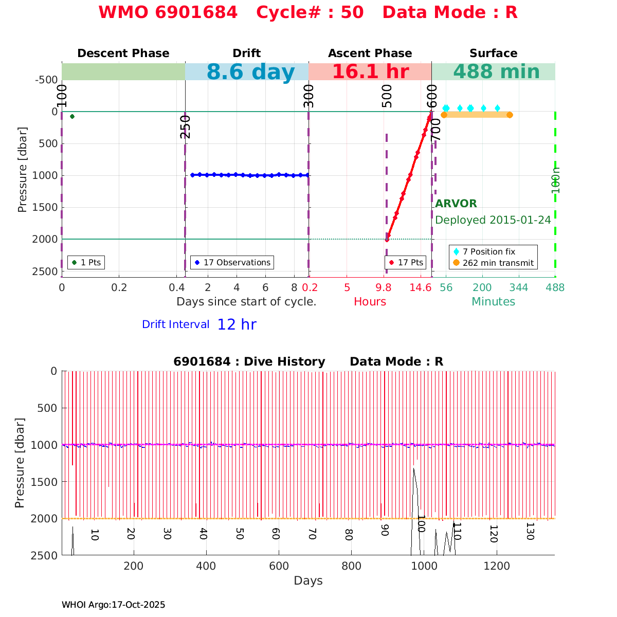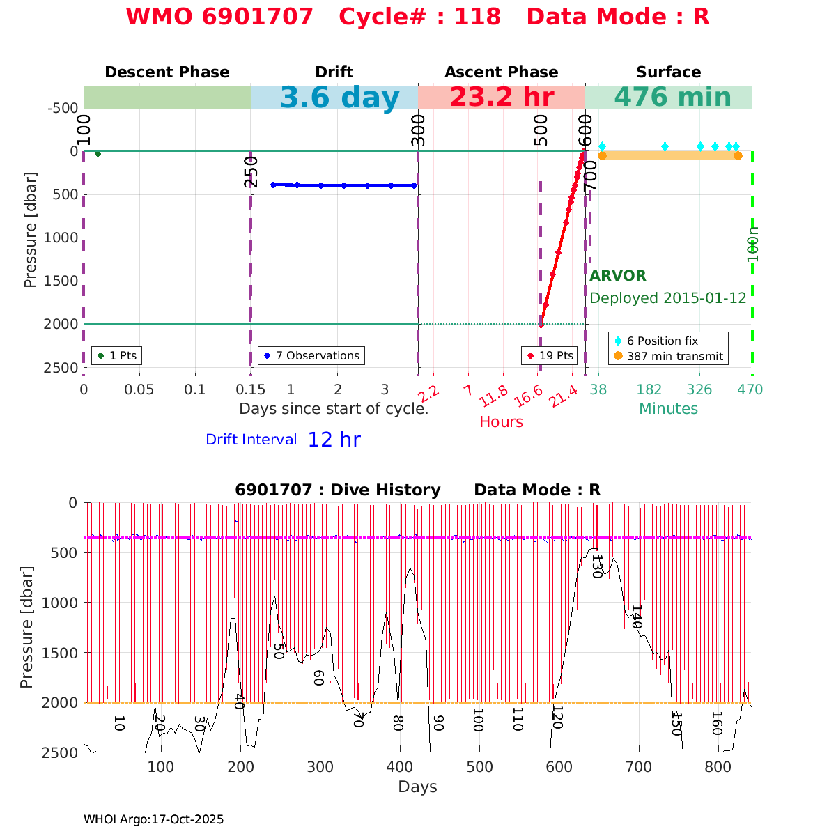 | WMO: #6901875 DAC: coriolis PI: Pierre-Marie POULAIN APEX: #6833 DRUCK_2900PSIA: #3628273 SBE41: #6303 Altimeter Comparison (IFREMER) EuroArgo Link | ![]() |
