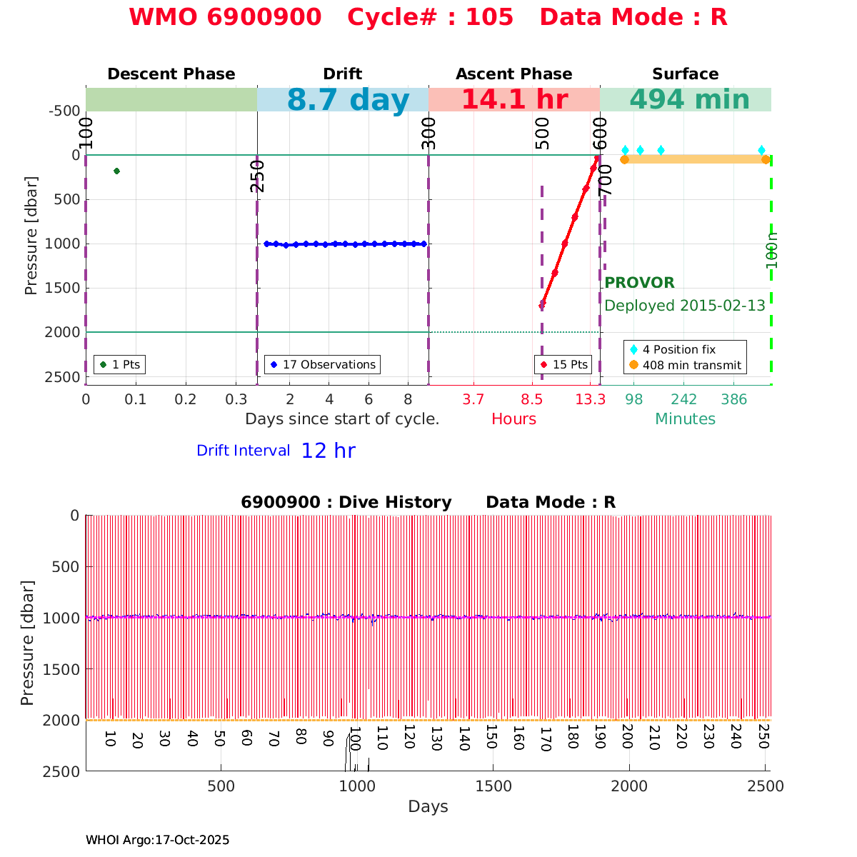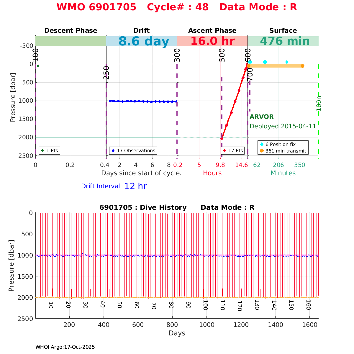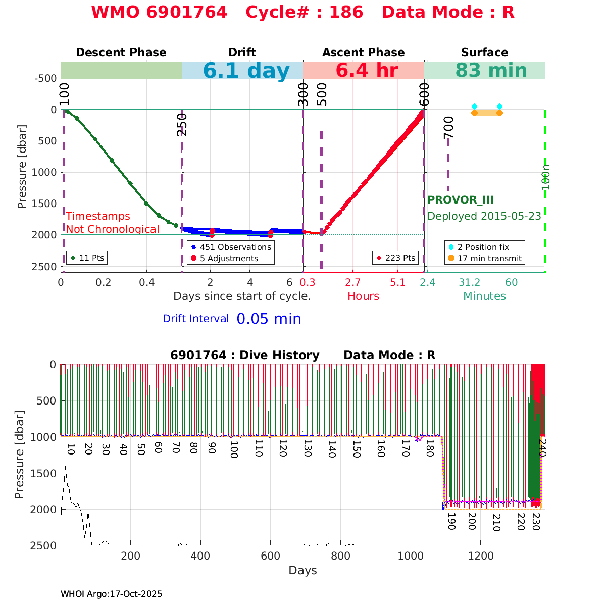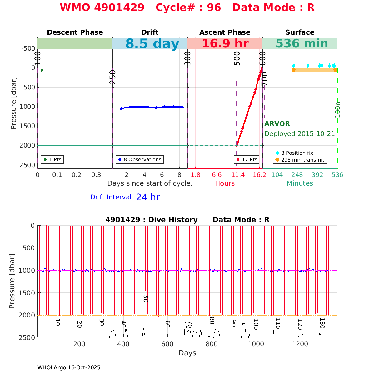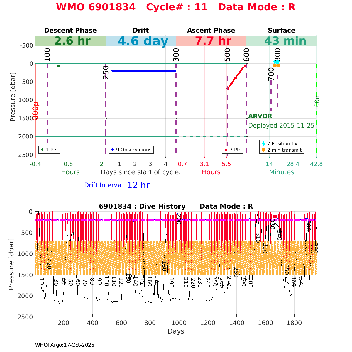 | WMO: #6901875 DAC: coriolis PI: Pierre-Marie POULAIN APEX: #6833 DRUCK_2900PSIA: #3628273 SBE41: #6303 Altimeter Comparison (IFREMER) EuroArgo Link | ![]() |