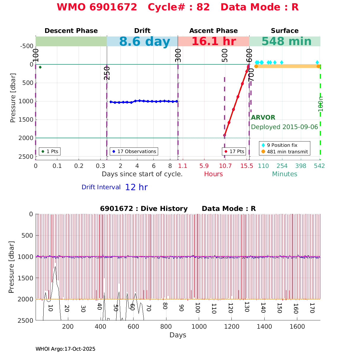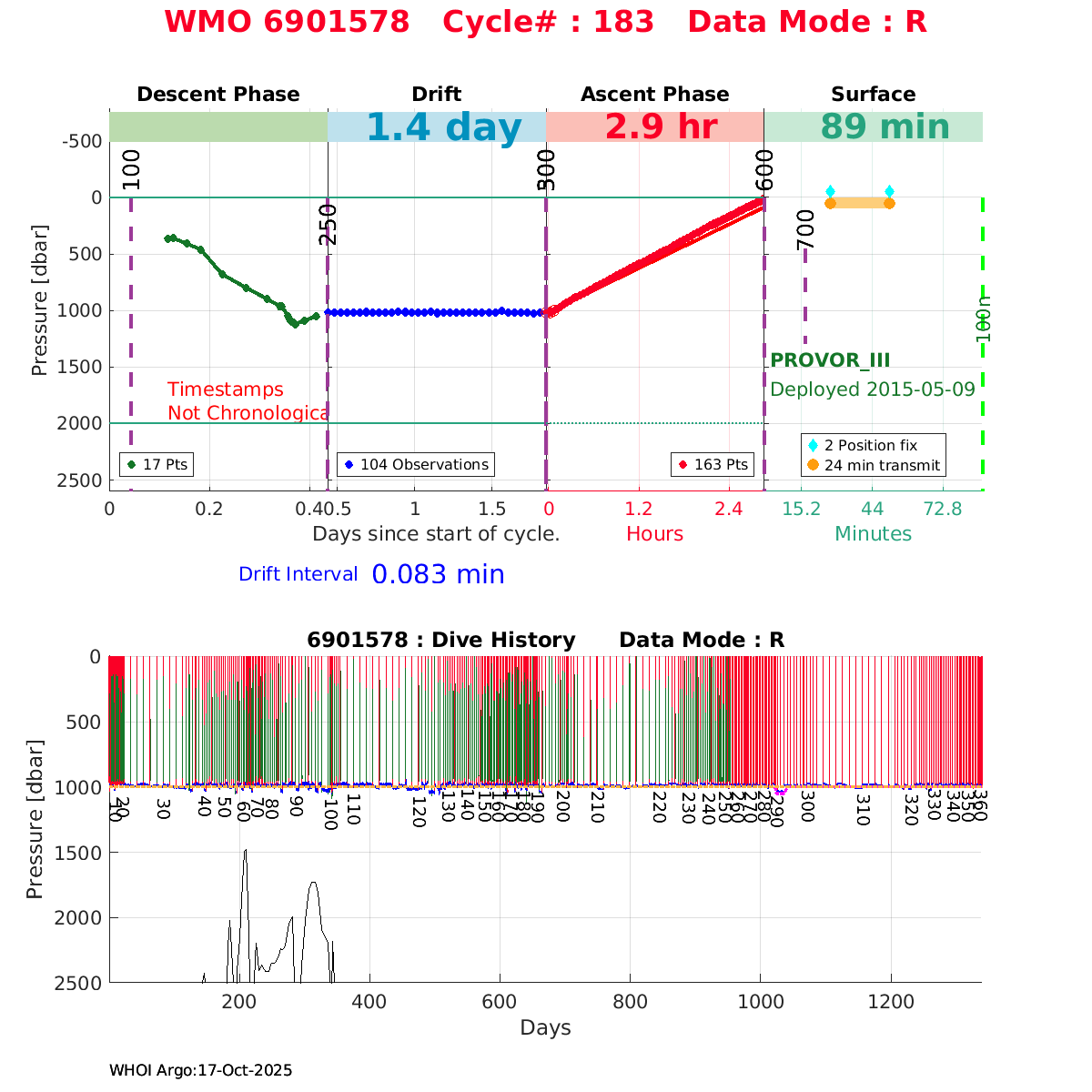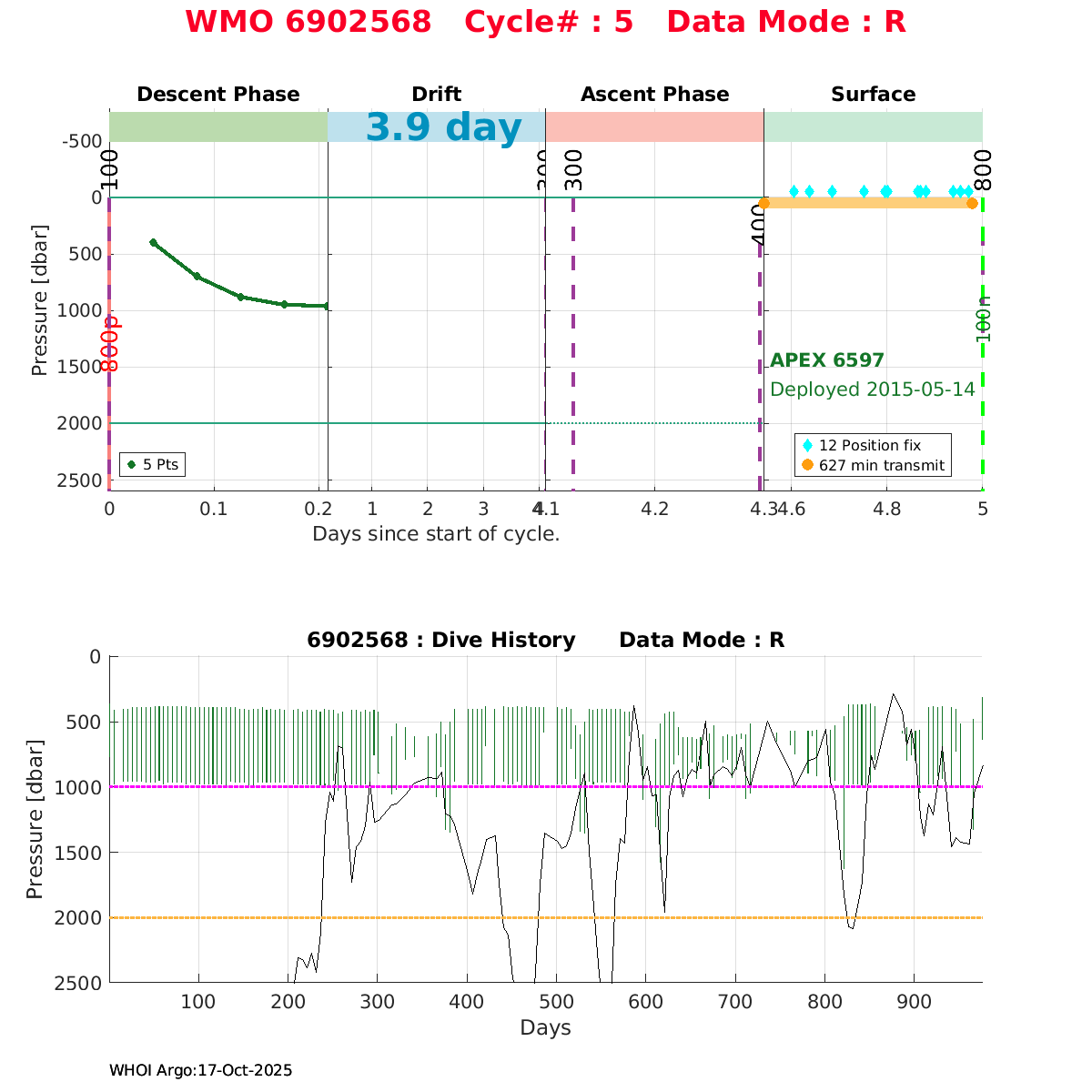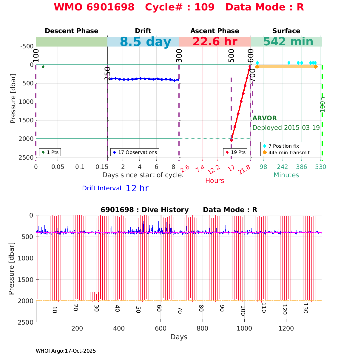 | WMO: #6901875 DAC: coriolis PI: Pierre-Marie POULAIN APEX: #6833 DRUCK_2900PSIA: #3628273 SBE41: #6303 Altimeter Comparison (IFREMER) EuroArgo Link | ![]() |