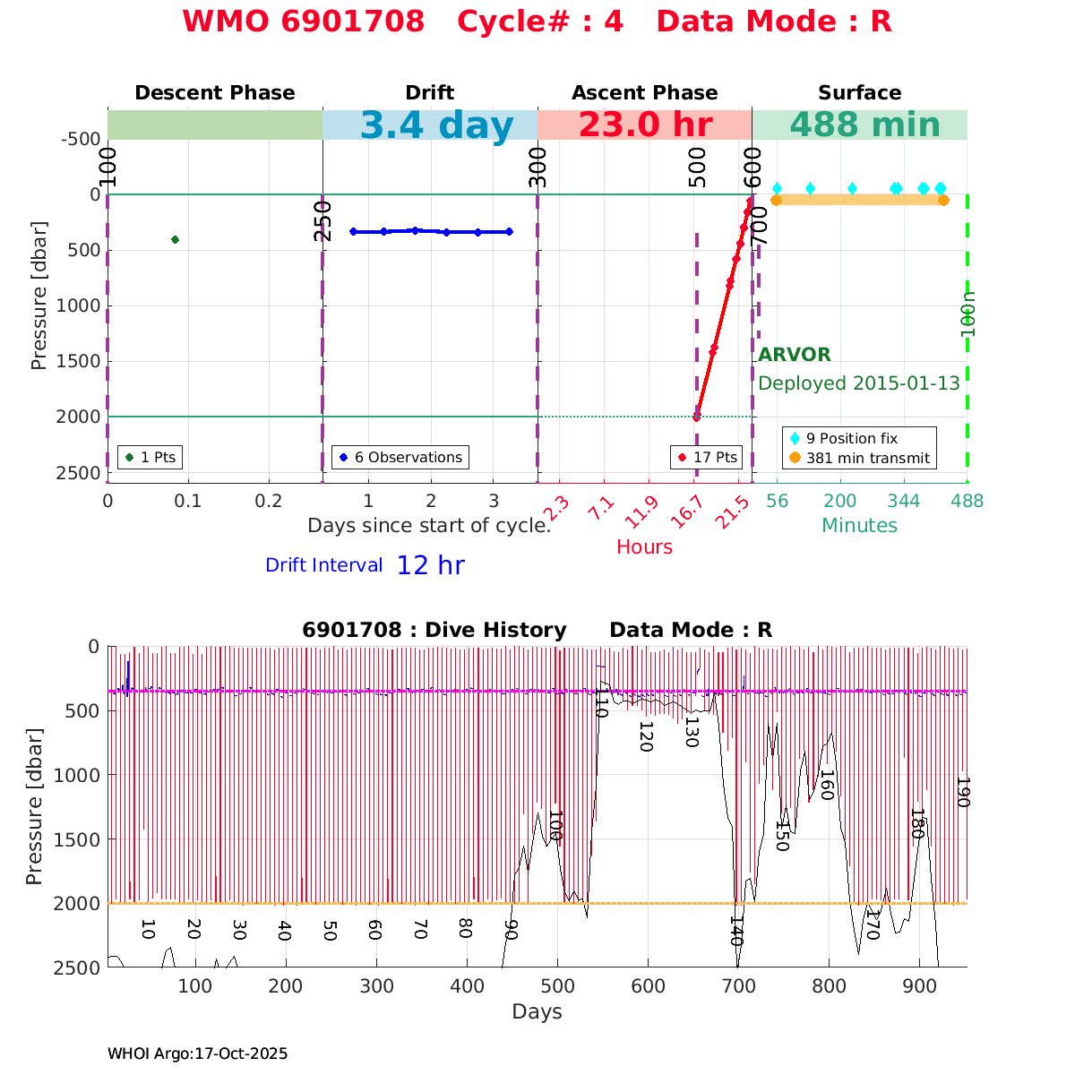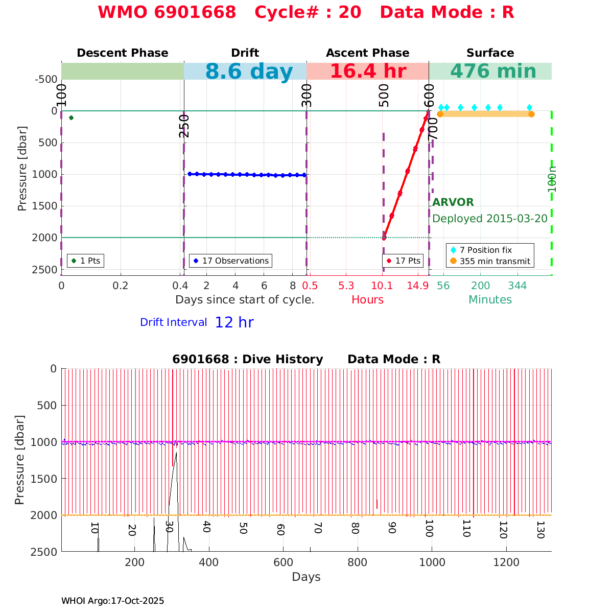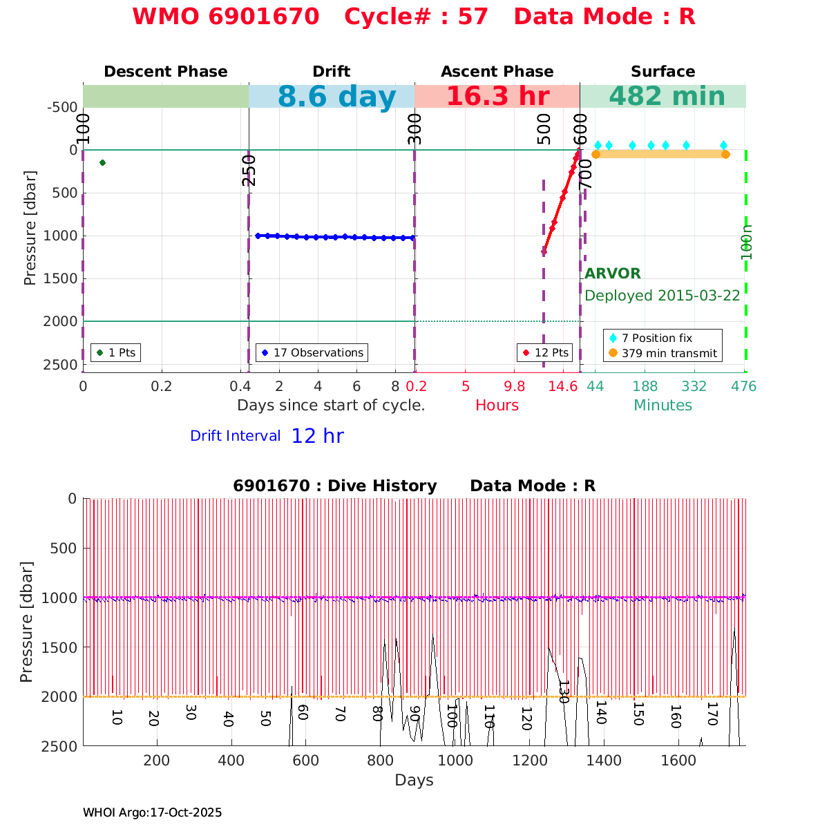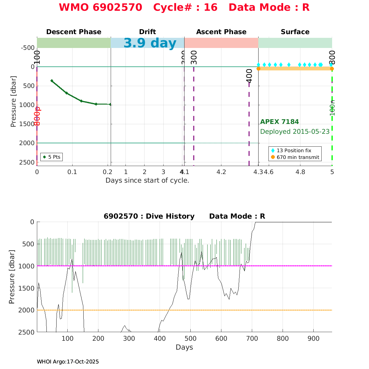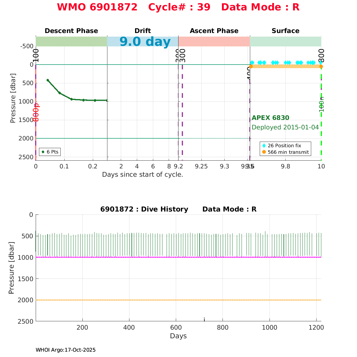 | WMO: #6901875 DAC: coriolis PI: Pierre-Marie POULAIN APEX: #6833 DRUCK_2900PSIA: #3628273 SBE41: #6303 Altimeter Comparison (IFREMER) EuroArgo Link | ![]() |