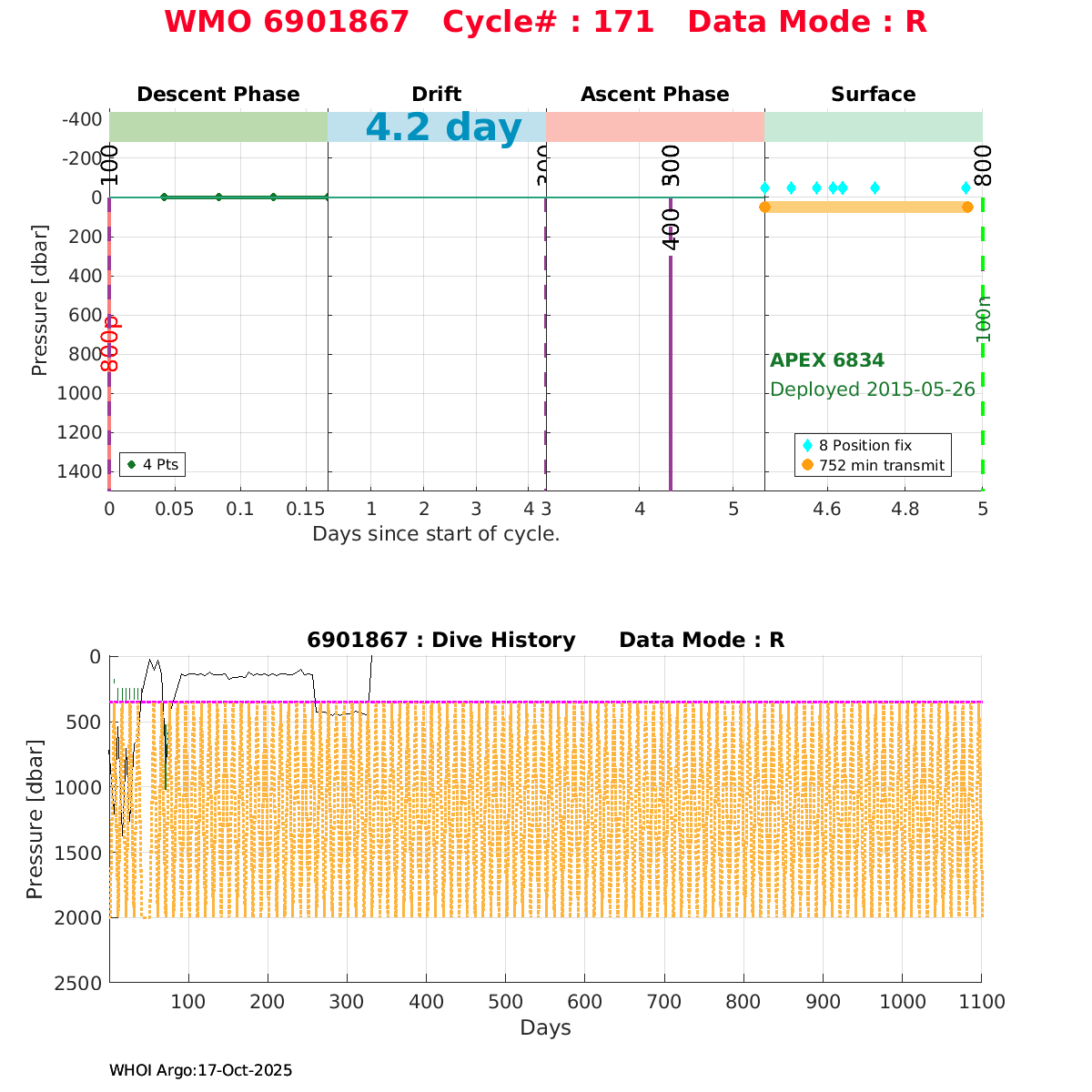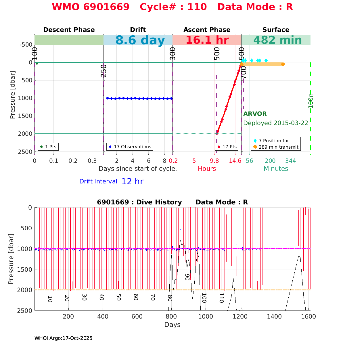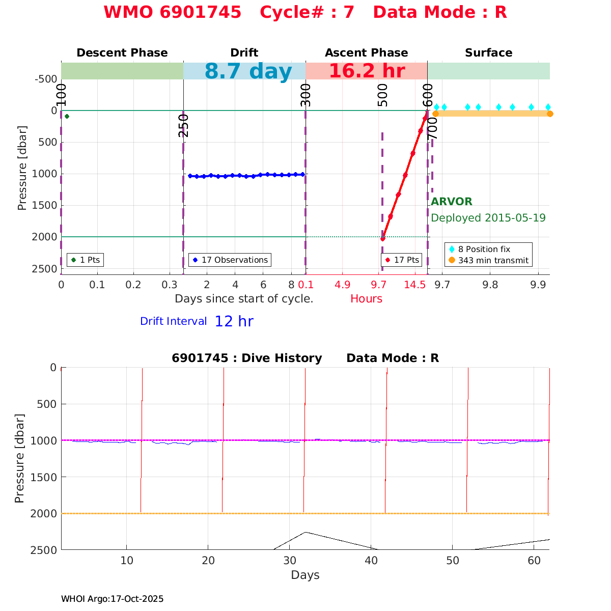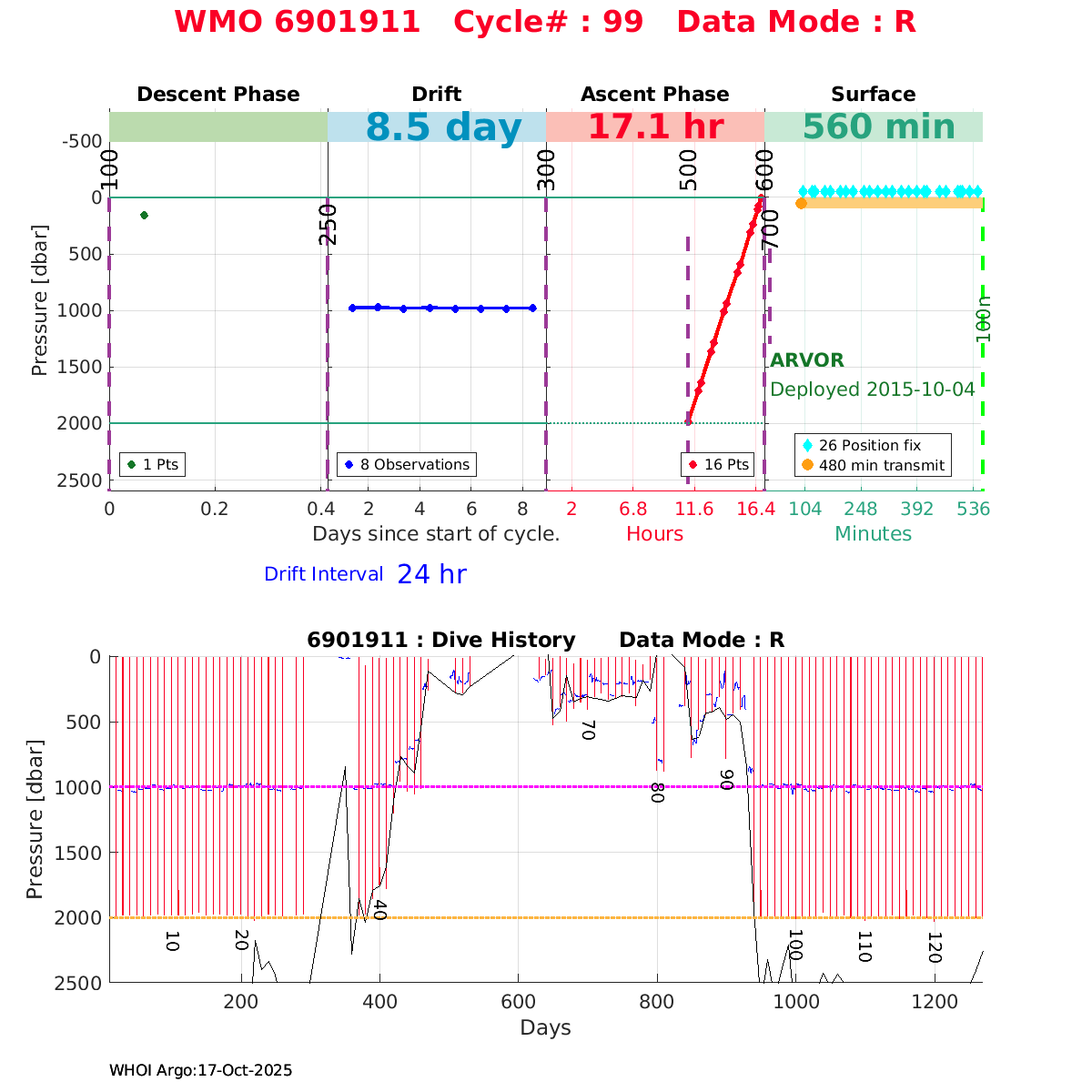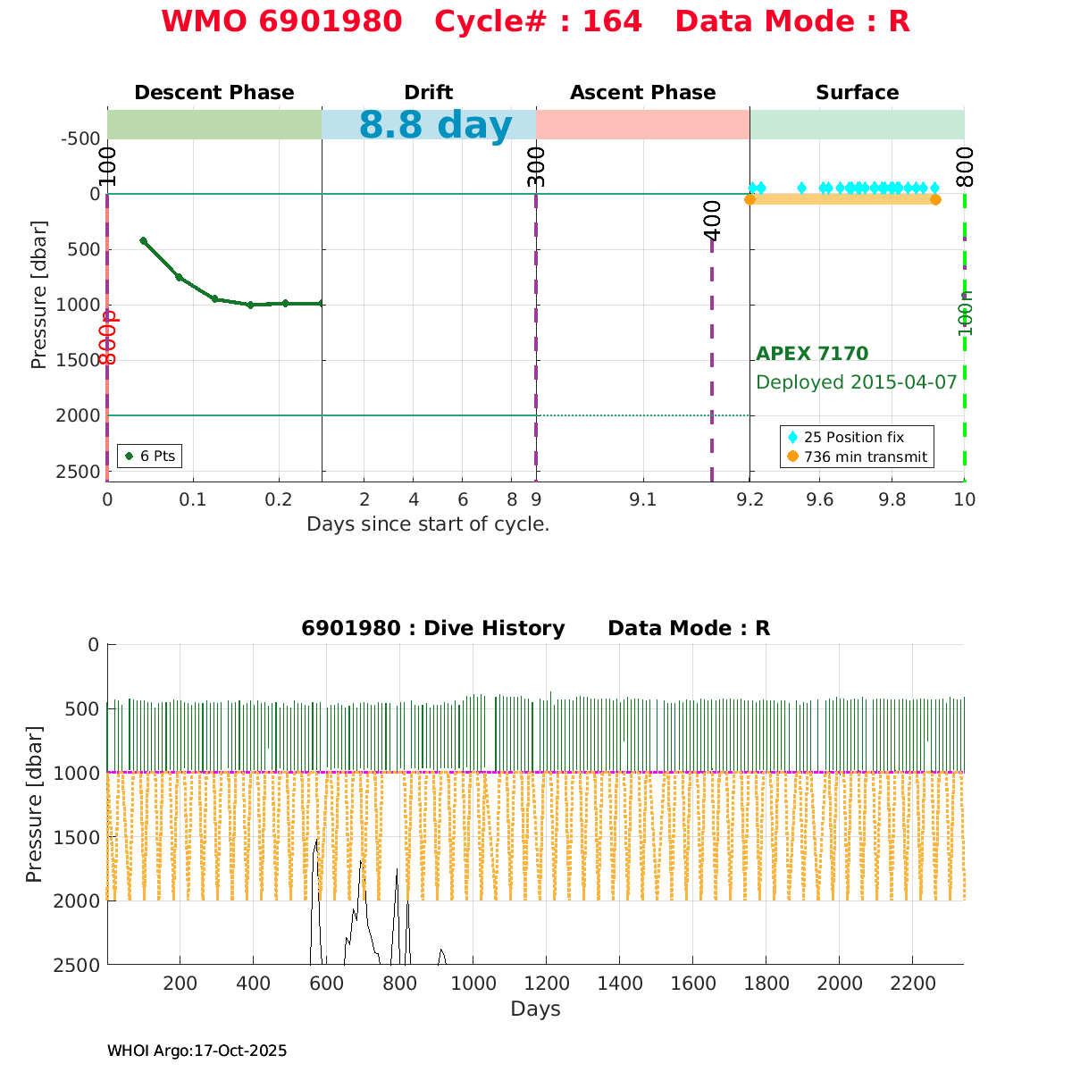 | WMO: #6901875 DAC: coriolis PI: Pierre-Marie POULAIN APEX: #6833 DRUCK_2900PSIA: #3628273 SBE41: #6303 Altimeter Comparison (IFREMER) EuroArgo Link | ![]() |