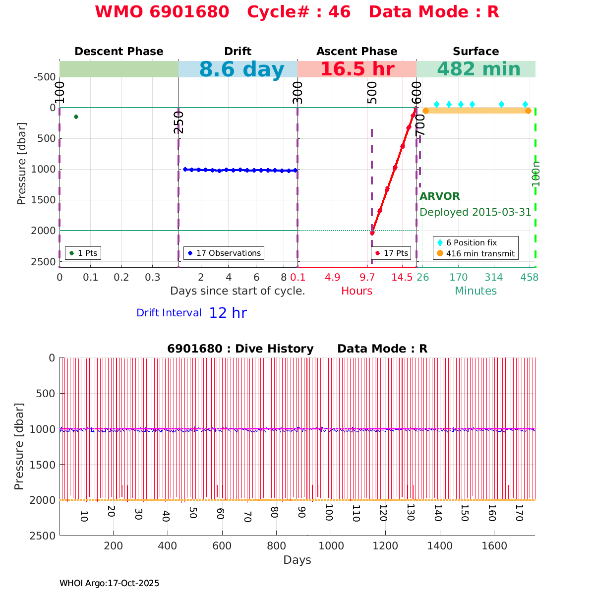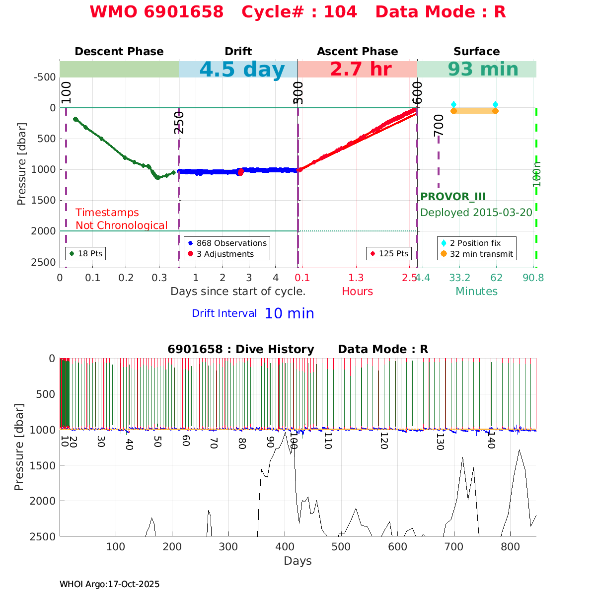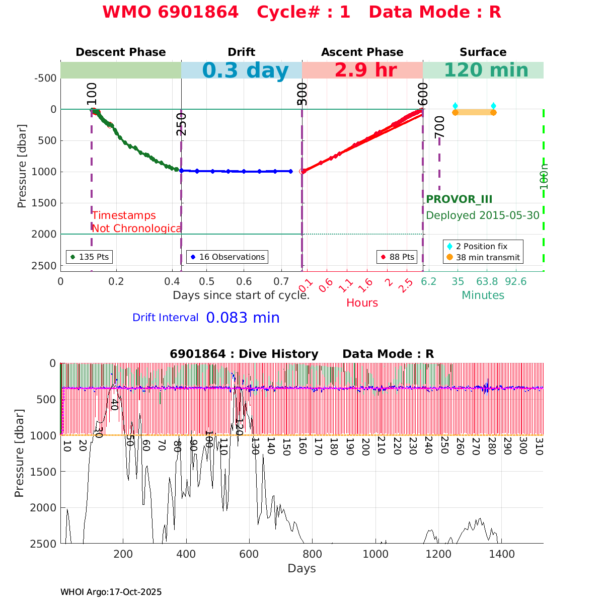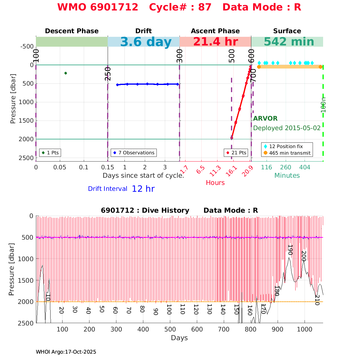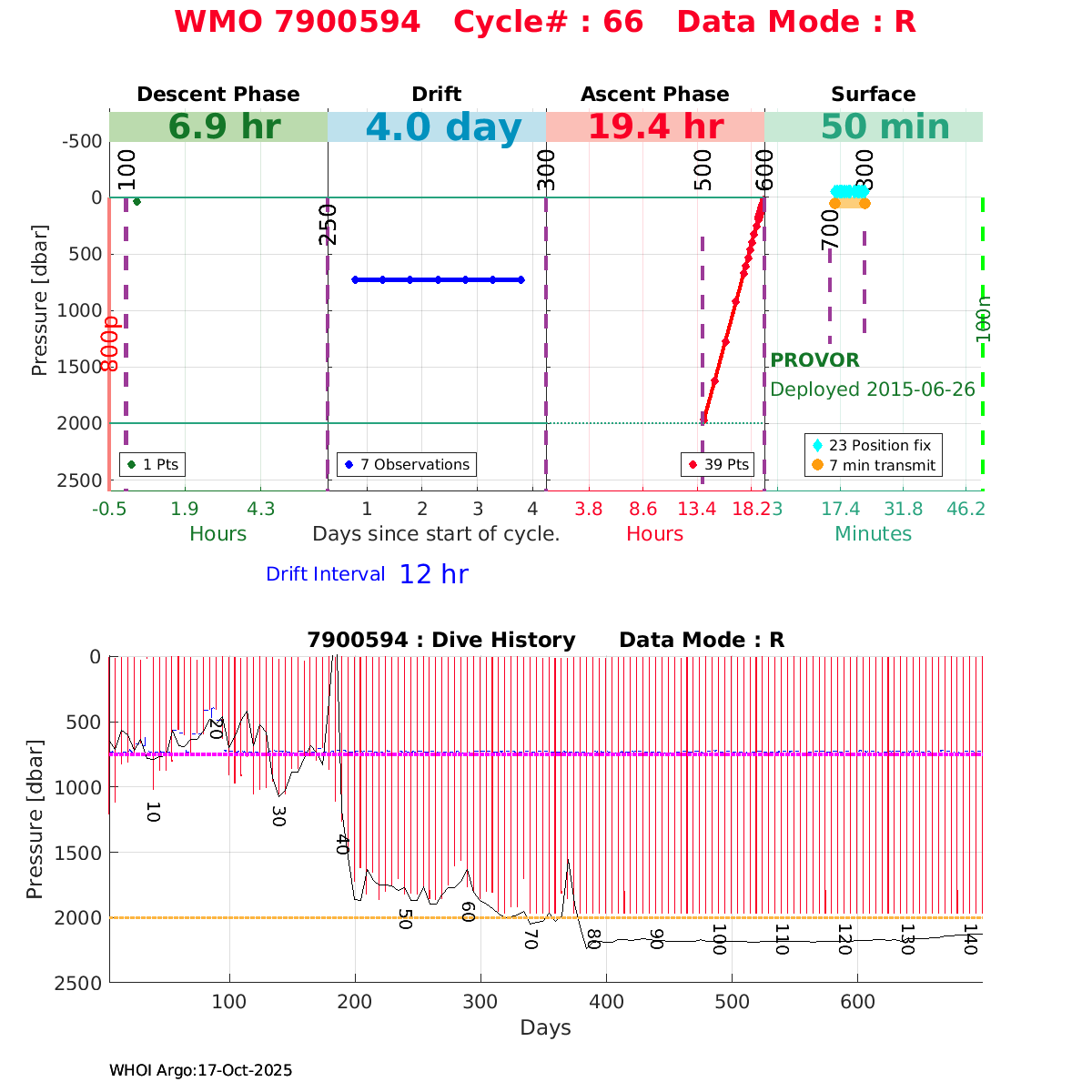 | WMO: #6901666 DAC: coriolis PI: Christophe MAES ARVOR: # FLOATCLOCK: # KISTLER_2900PSIA: #2149188 SBE41CP_V2: #6053 Altimeter Comparison (IFREMER) EuroArgo Link | ![]() |