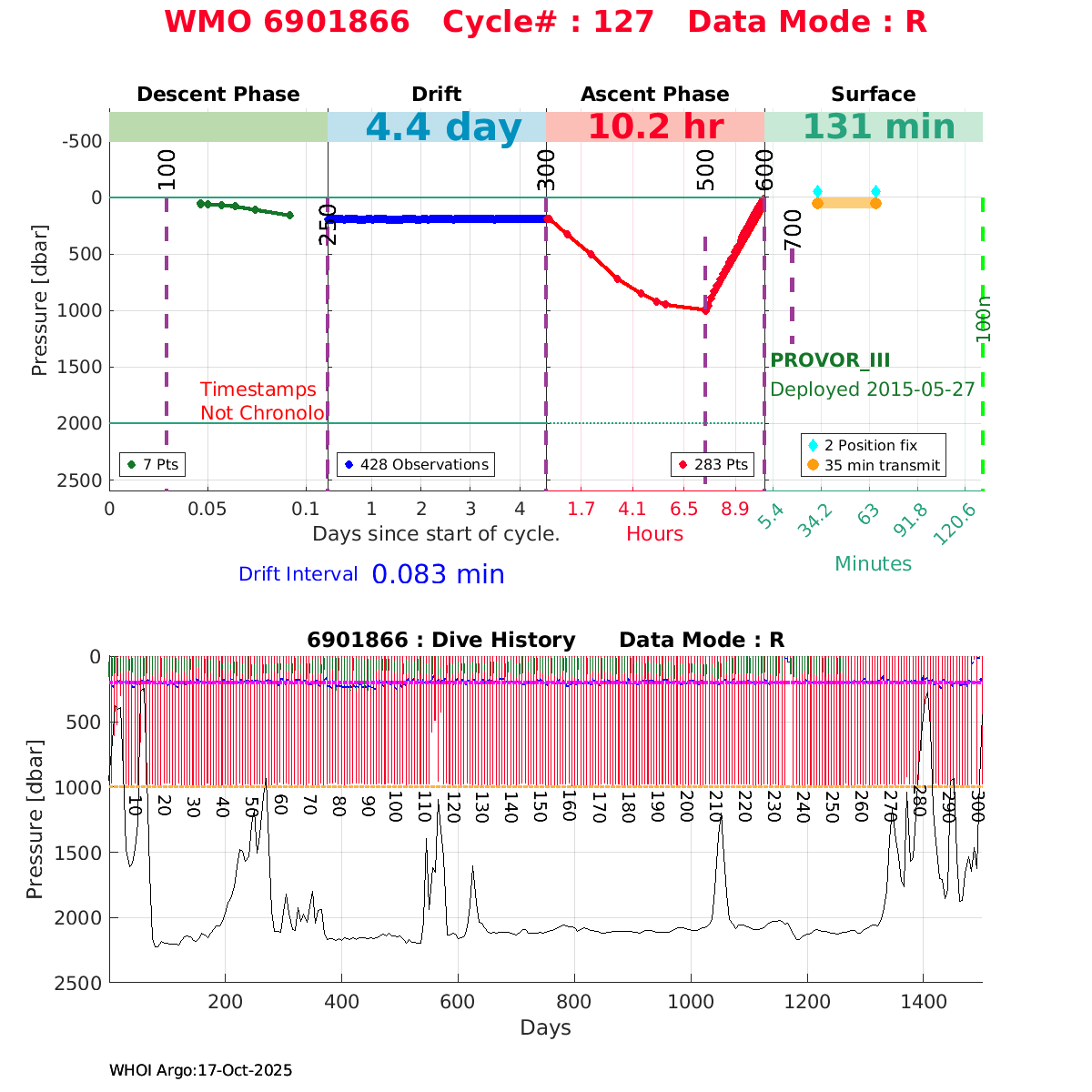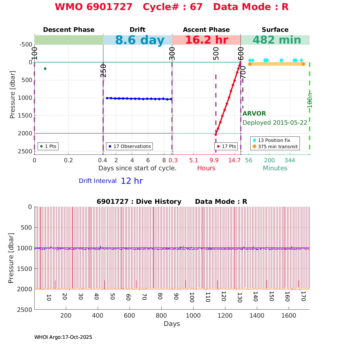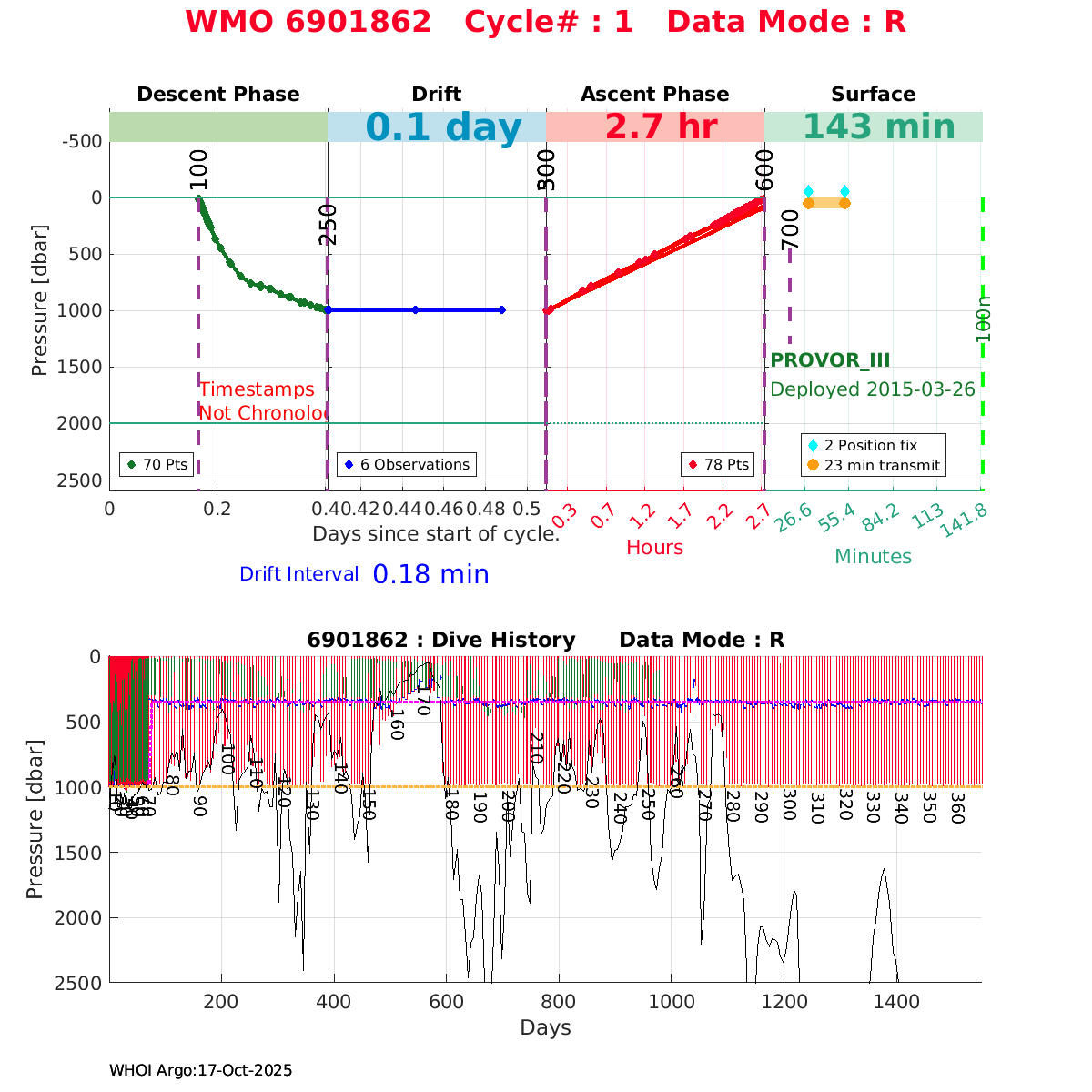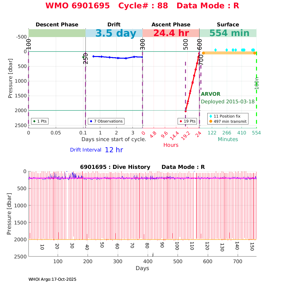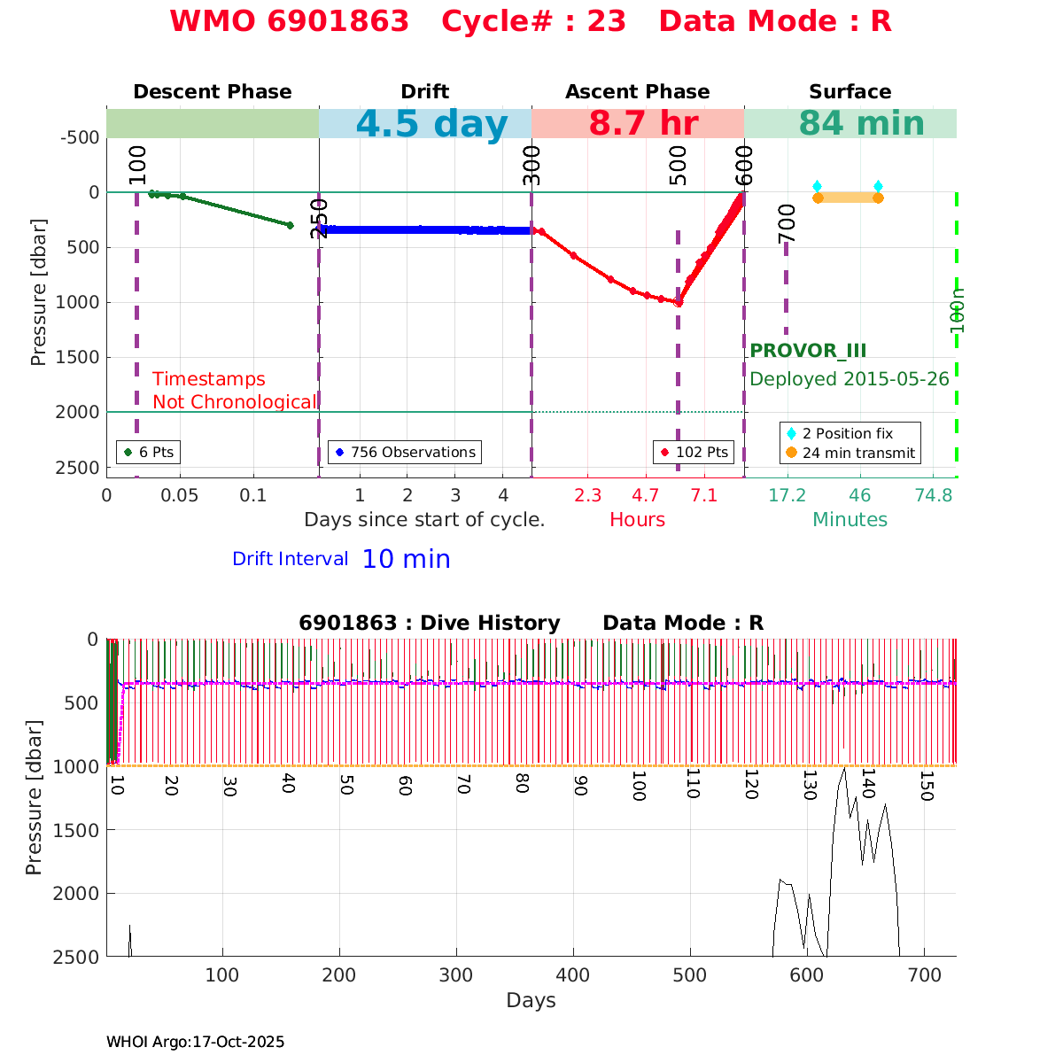| WMO: #6901666 DAC: coriolis PI: Christophe MAES ARVOR: # FLOATCLOCK: # KISTLER_2900PSIA: #2149188 SBE41CP_V2: #6053 Altimeter Comparison (IFREMER) EuroArgo Link | ![]() |