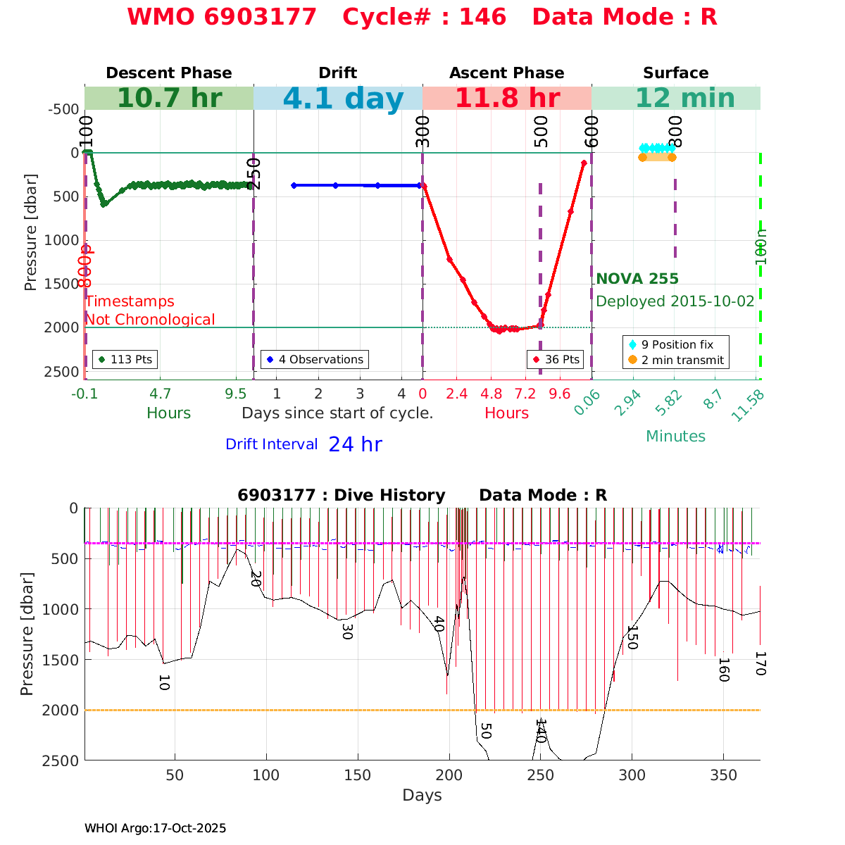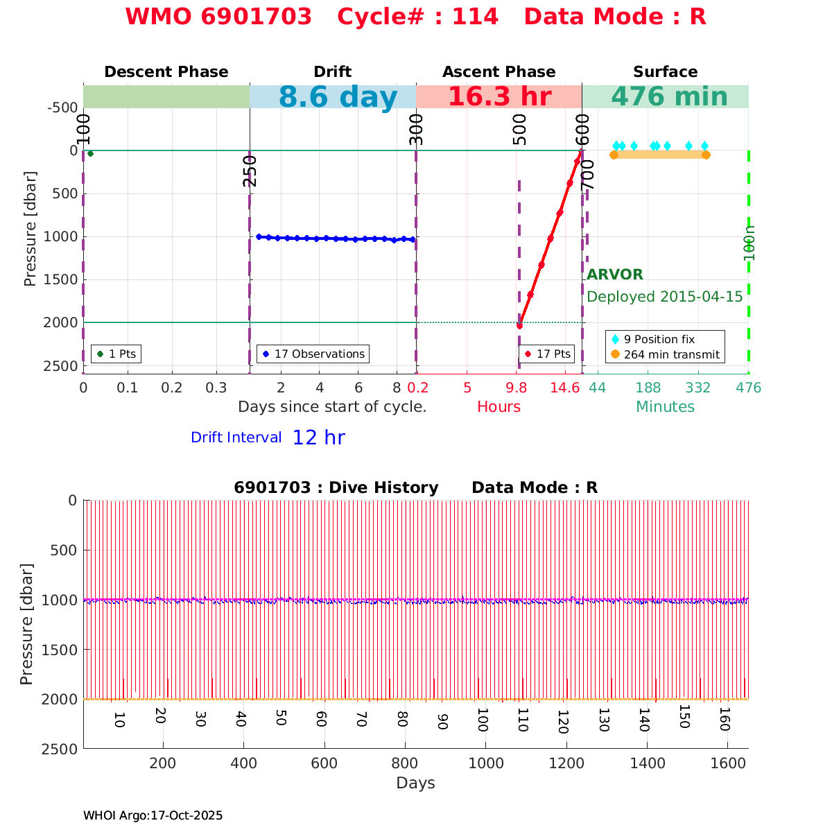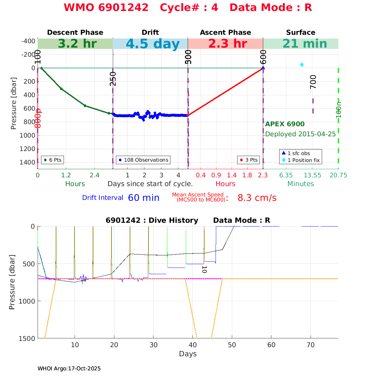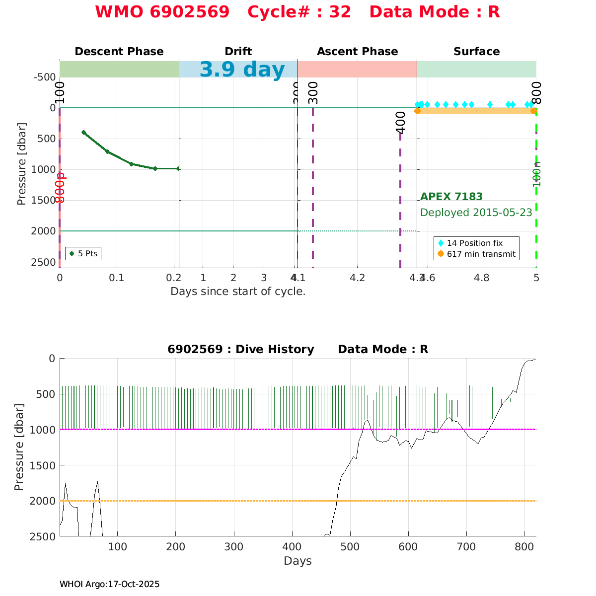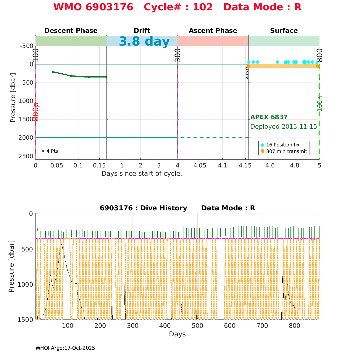 | WMO: #6903176 DAC: coriolis PI: Pierre-Marie POULAIN APEX: #6837 DRUCK_2900PSIA: #3847187 SBE41: #6315 Altimeter Comparison (IFREMER) EuroArgo Link | ![]() |
