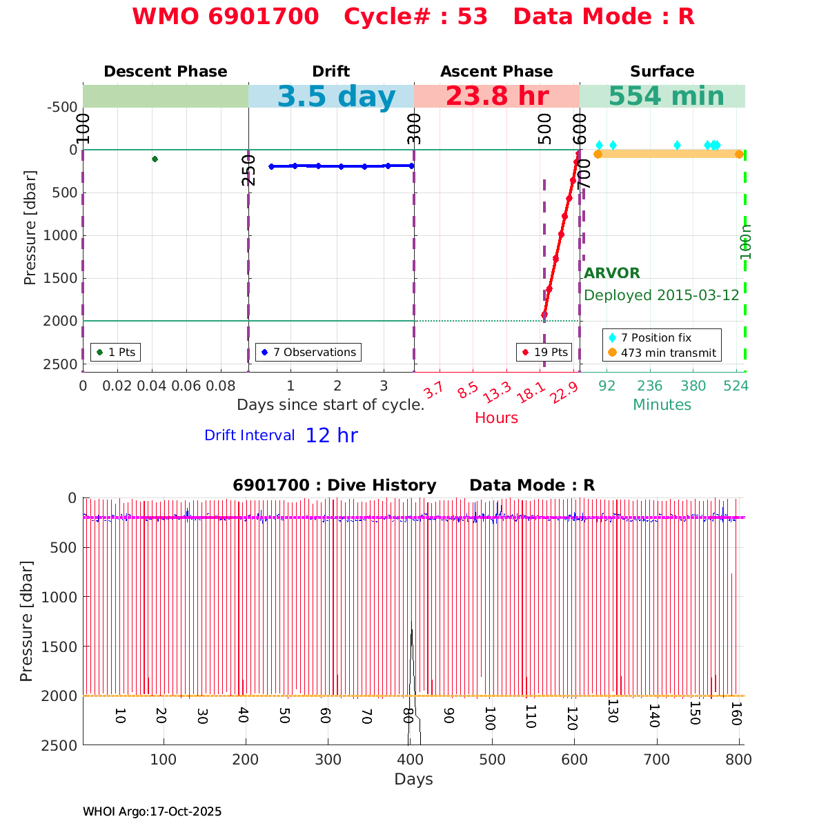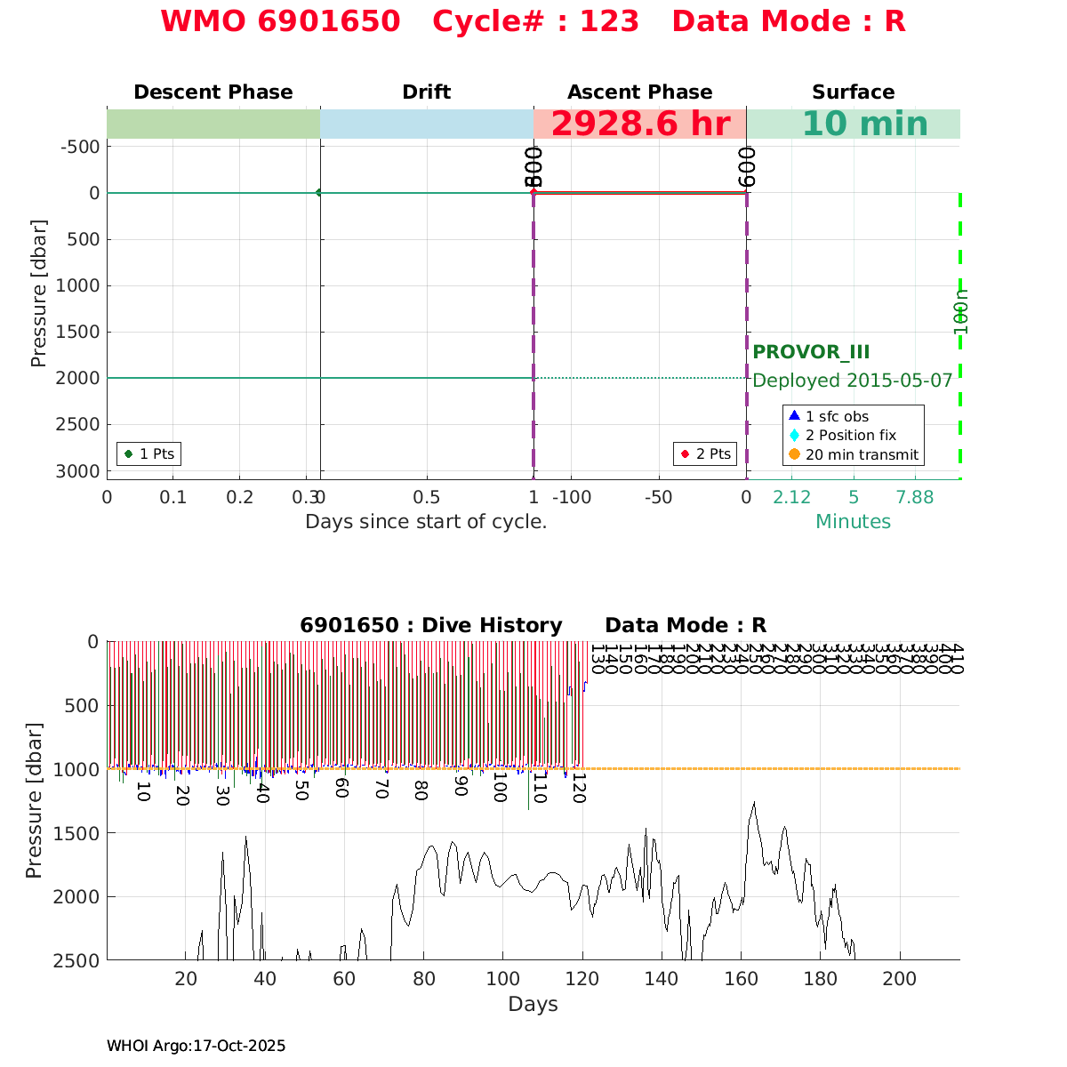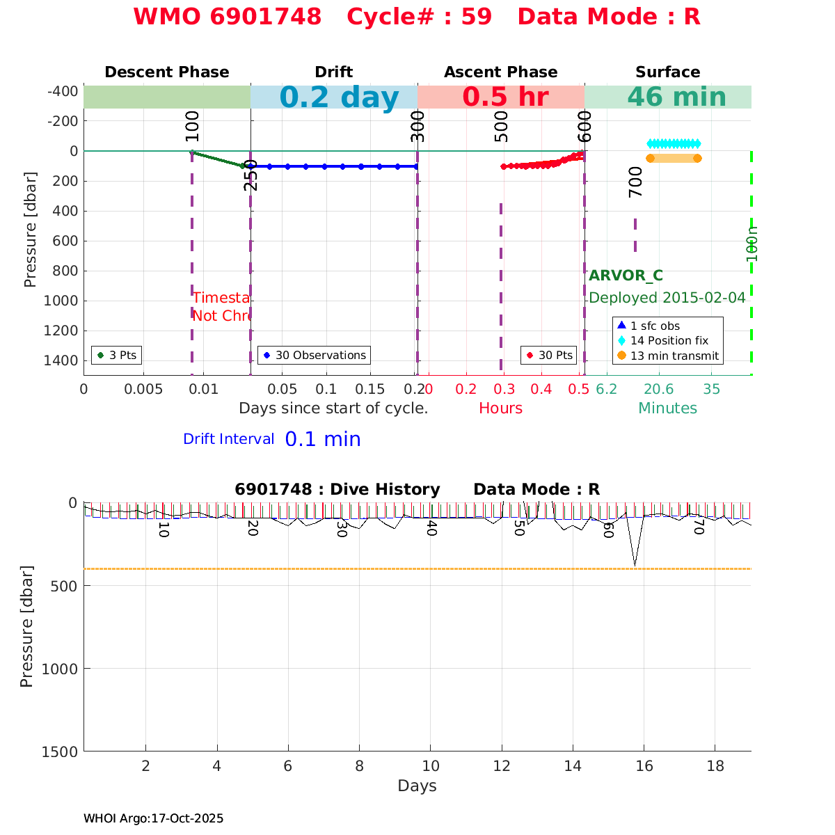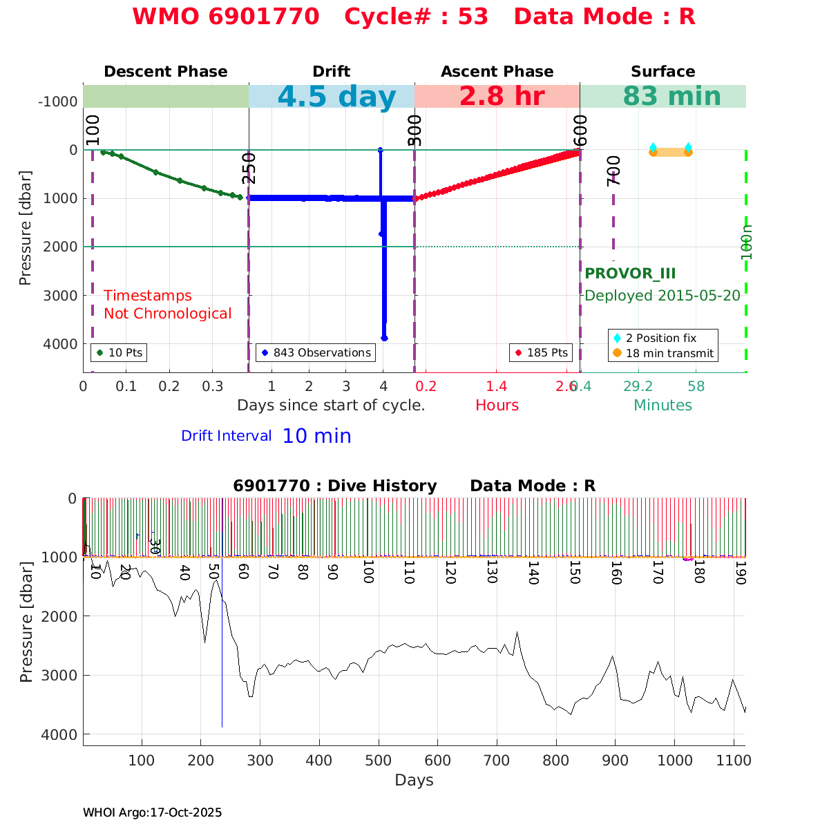 | WMO: #6901723 DAC: coriolis PI: Virginie THIERRY ARVOR: # FLOATCLOCK: # KISTLER_2900PSIA: #2150611 SBE41CP_V2: #6208 Altimeter Comparison (IFREMER) EuroArgo Link | ![]() |
