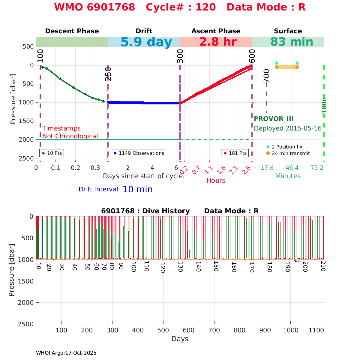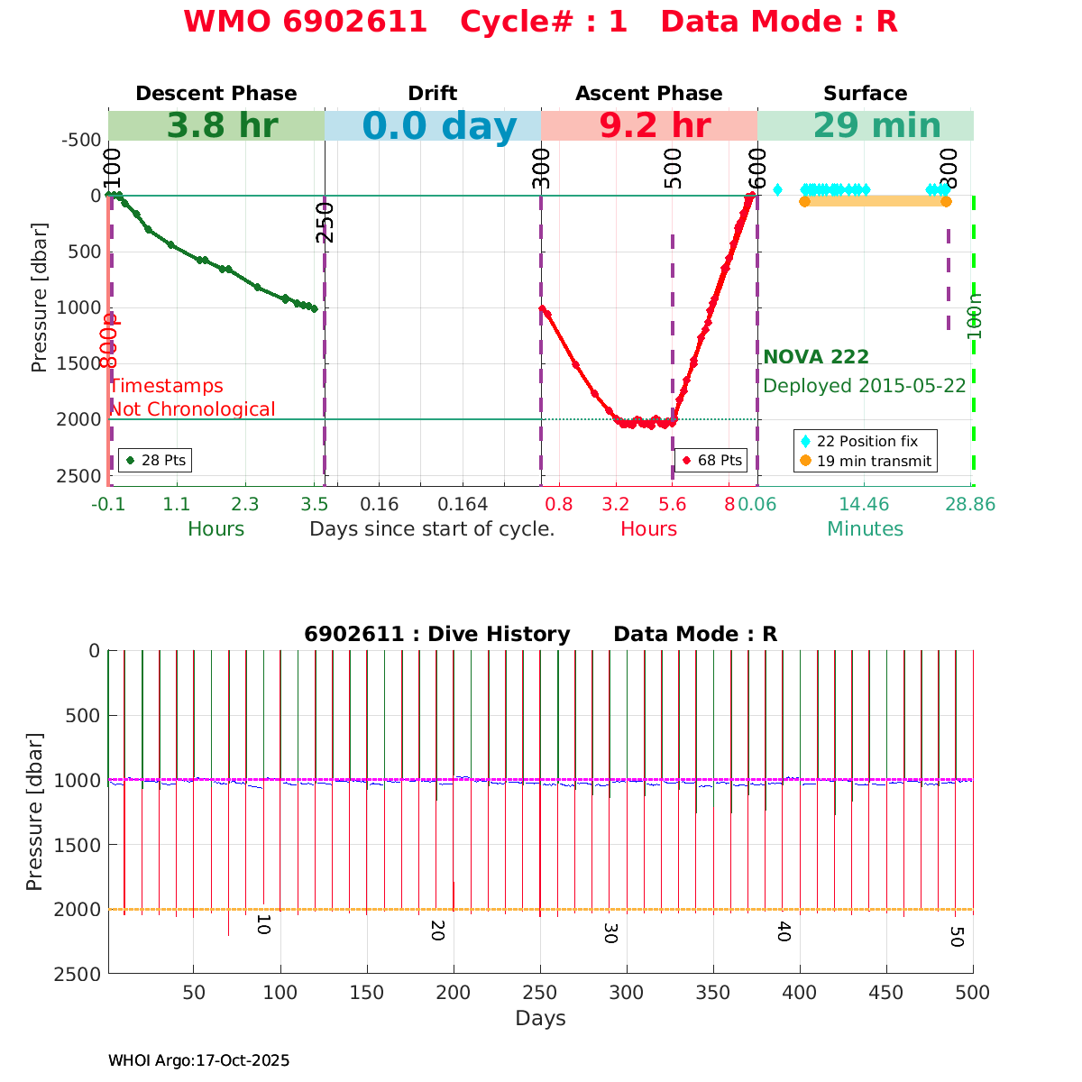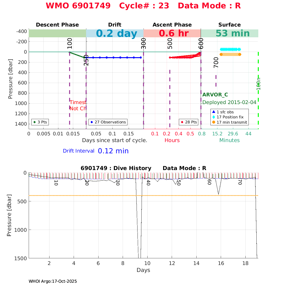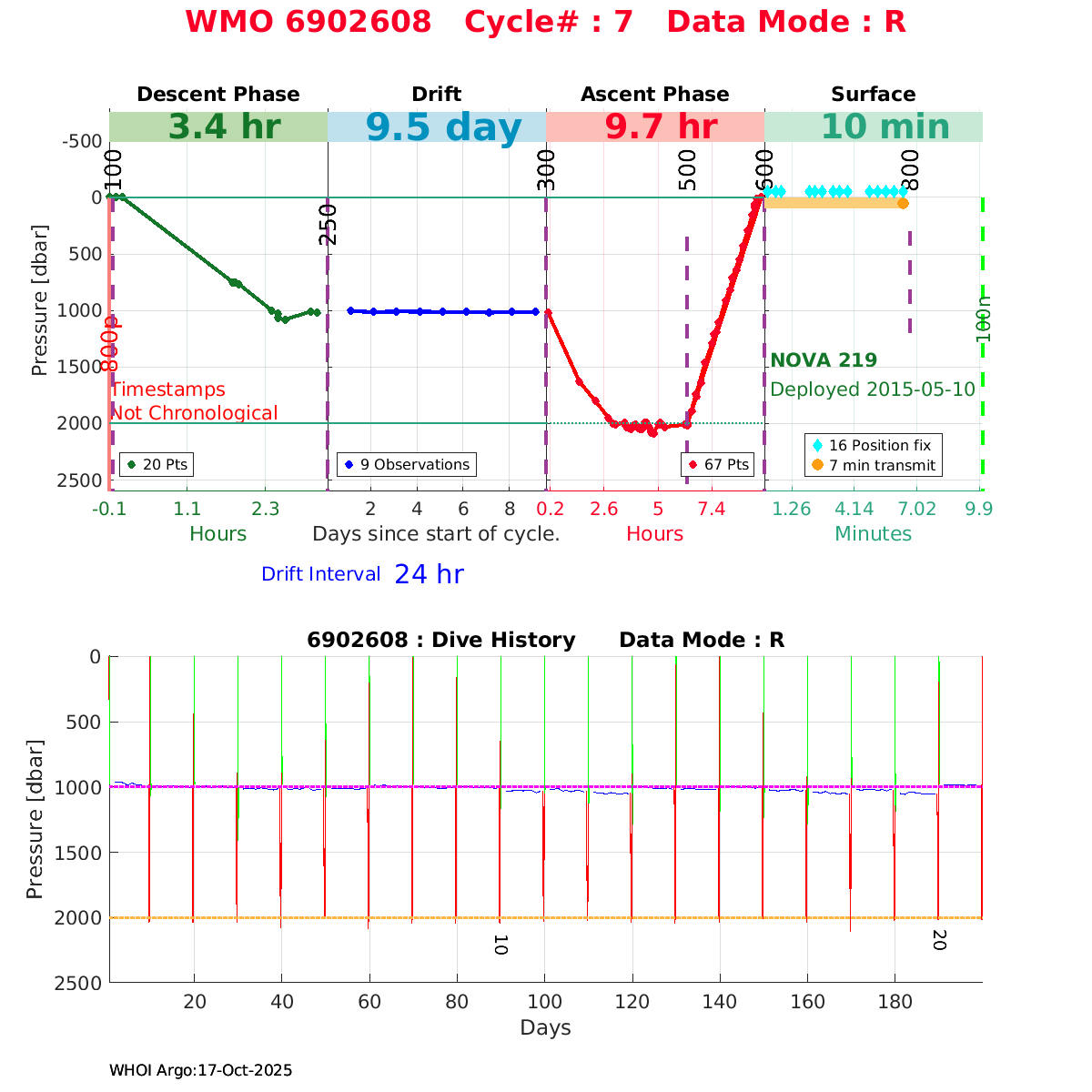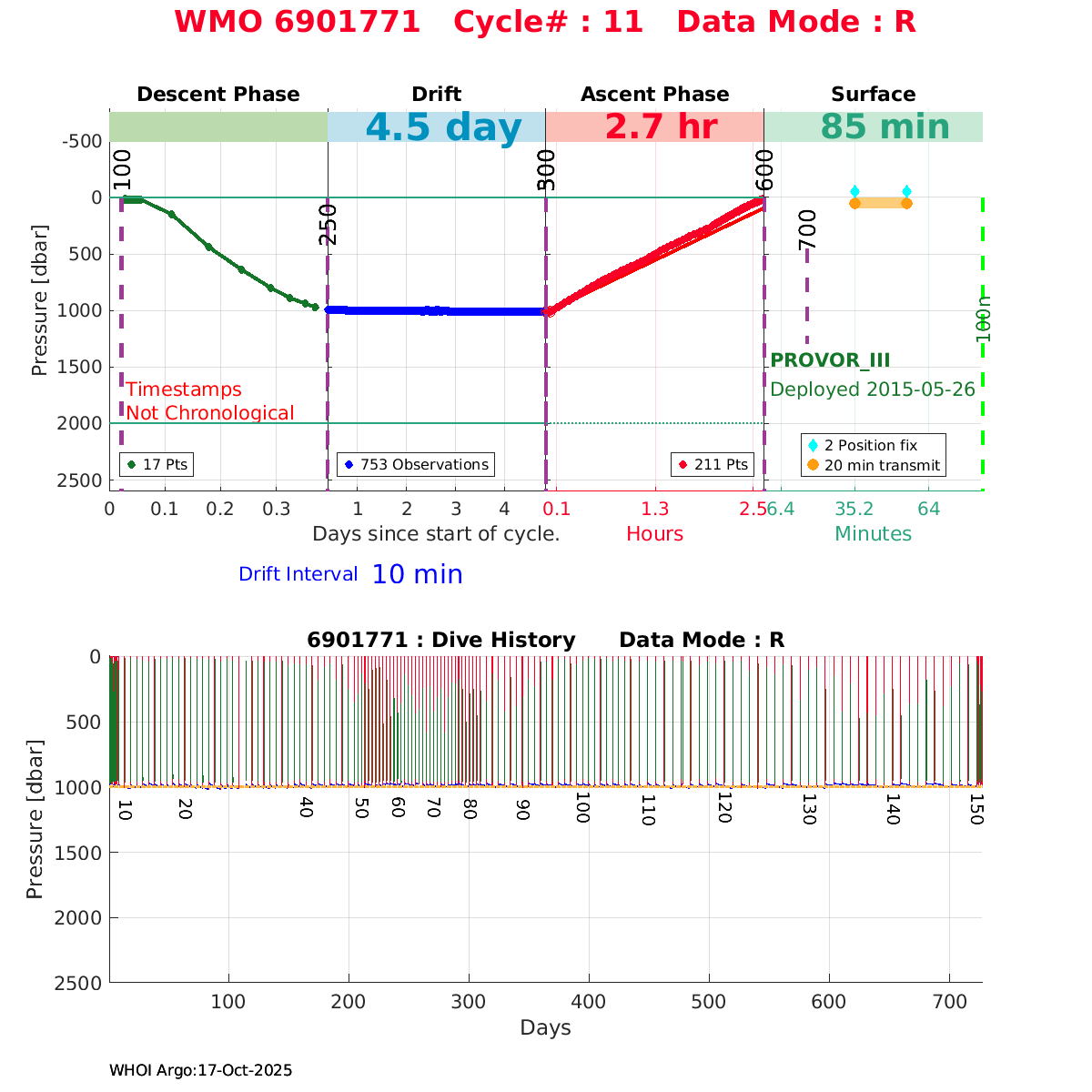 | WMO: #6901723 DAC: coriolis PI: Virginie THIERRY ARVOR: # FLOATCLOCK: # KISTLER_2900PSIA: #2150611 SBE41CP_V2: #6208 Altimeter Comparison (IFREMER) EuroArgo Link | ![]() |
