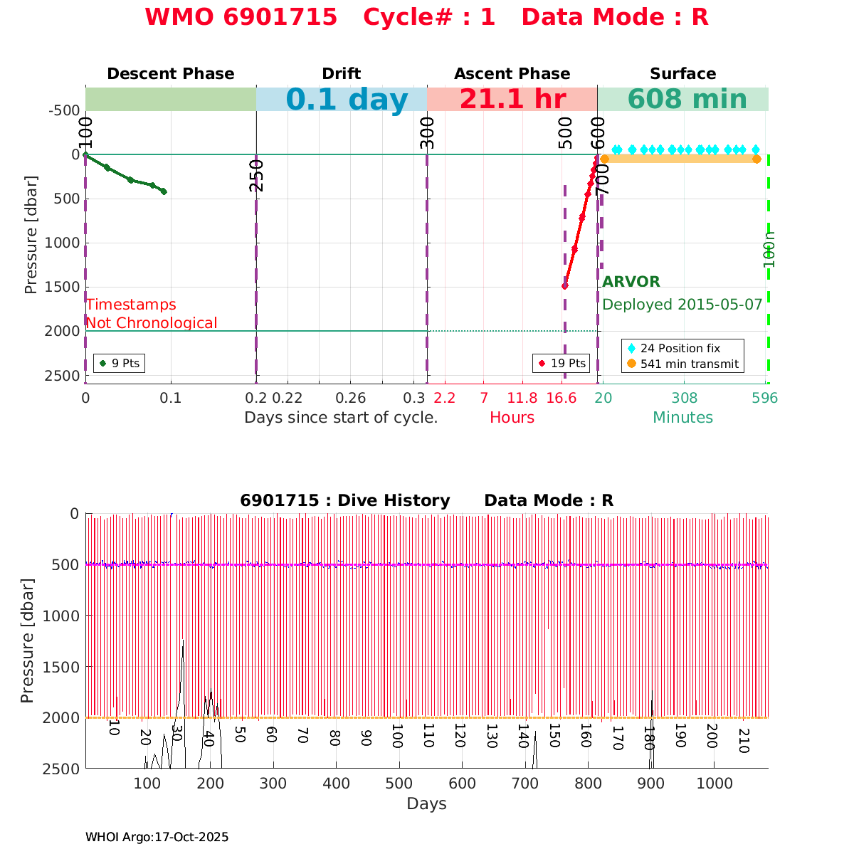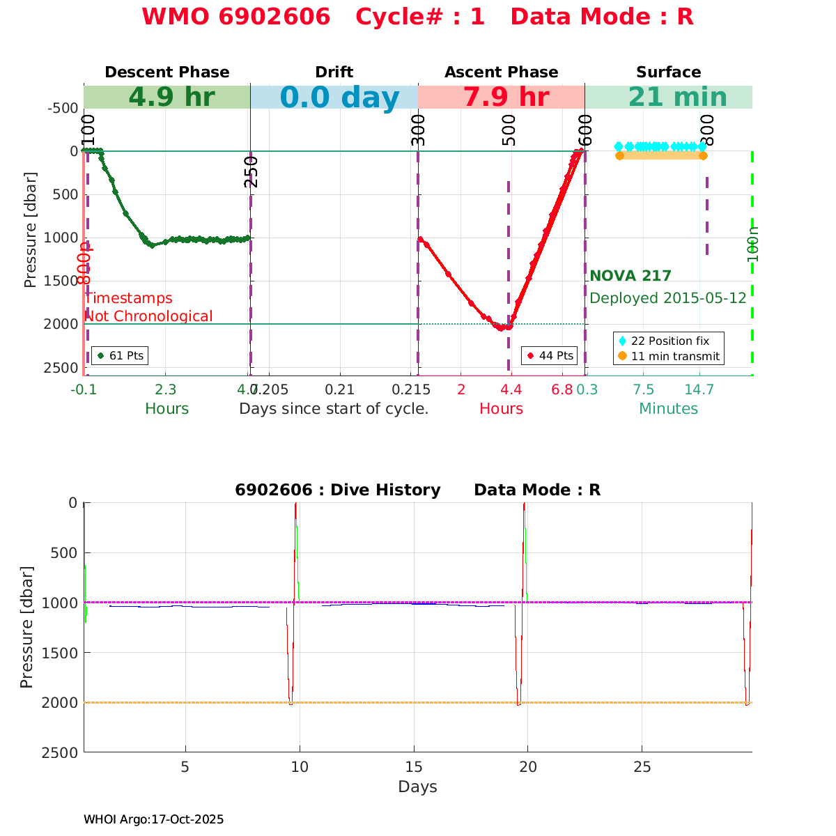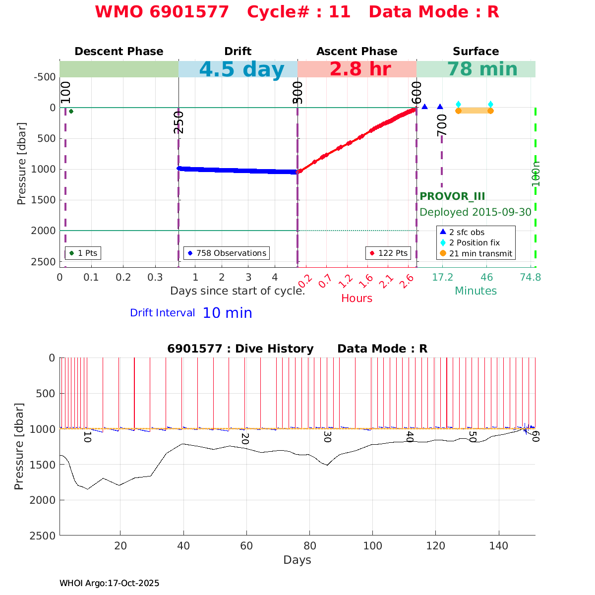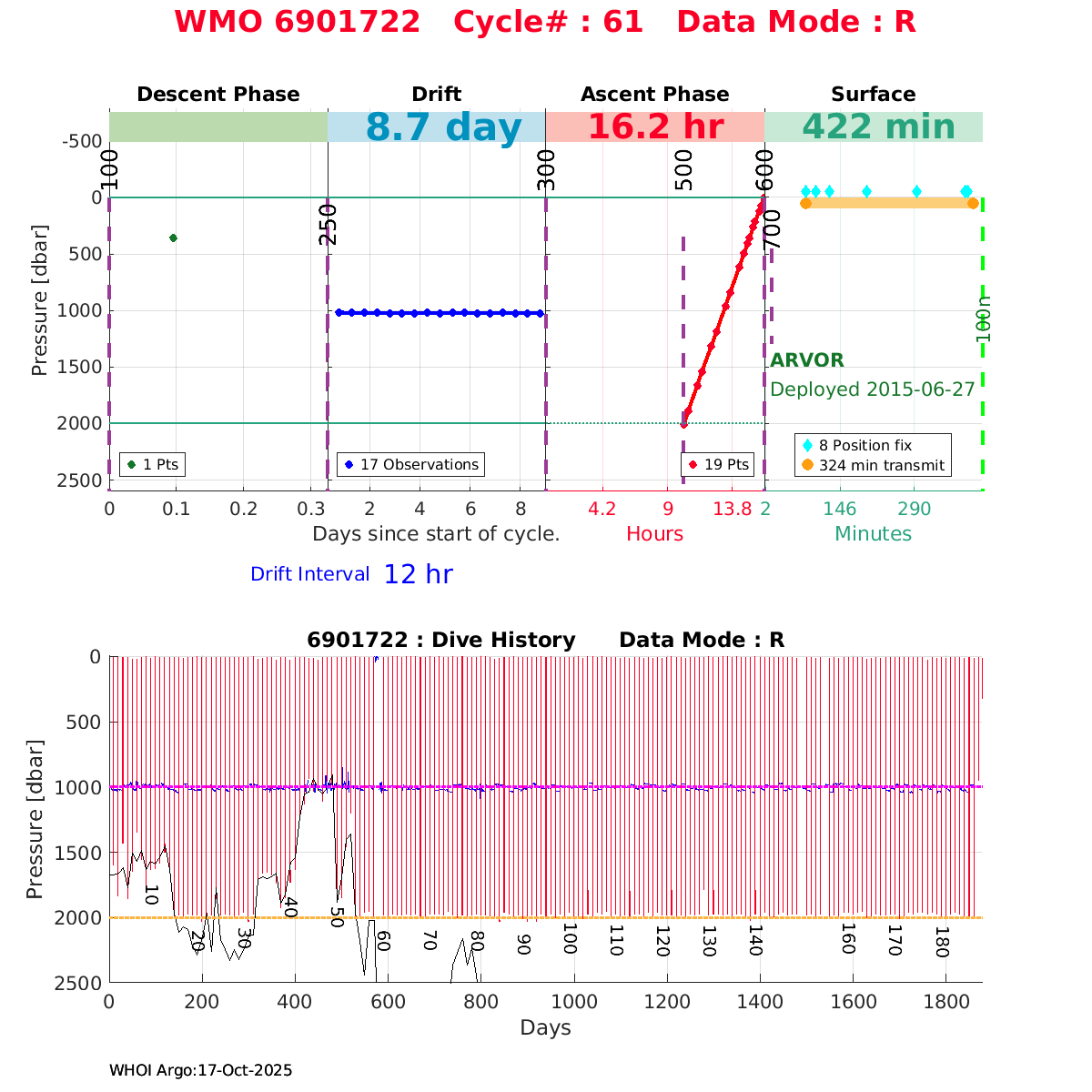 | WMO: #6901723 DAC: coriolis PI: Virginie THIERRY ARVOR: # FLOATCLOCK: # KISTLER_2900PSIA: #2150611 SBE41CP_V2: #6208 Altimeter Comparison (IFREMER) EuroArgo Link | ![]() |