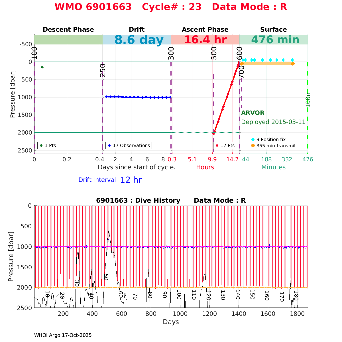 | WMO: #6902663 DAC: coriolis PI: Christine COATANOAN ARVOR: # FLOATCLOCK: # KISTLER_2900PSIA: #2151817 SBE41CP_V2: #6845 Altimeter Comparison (IFREMER) EuroArgo Link | ![]() |