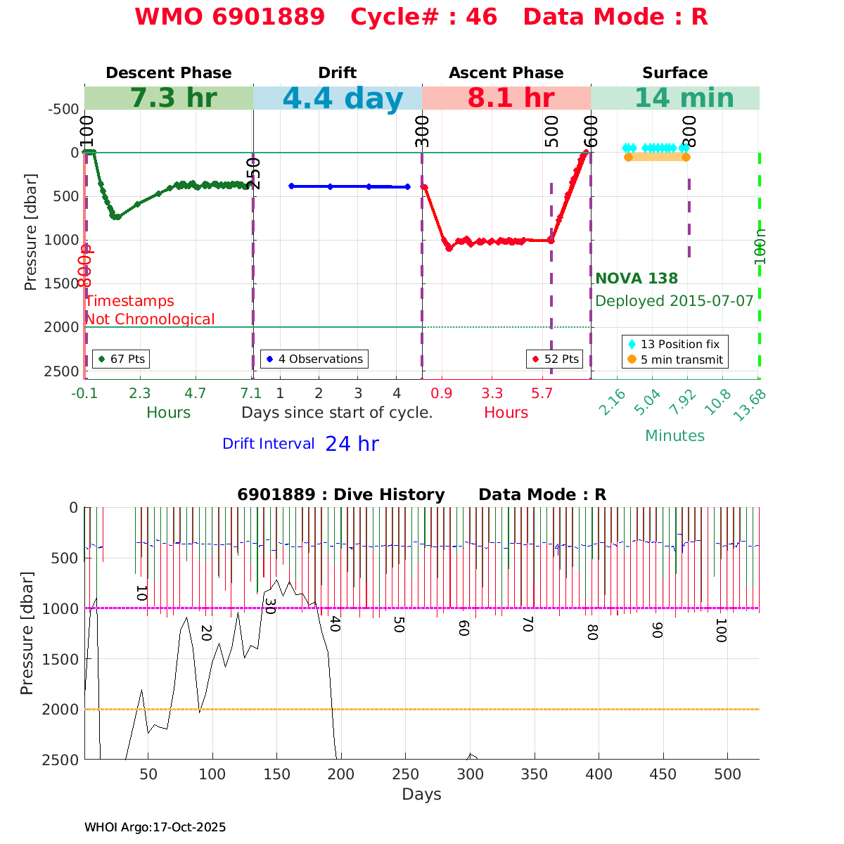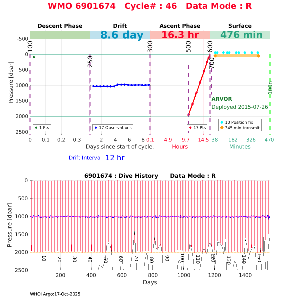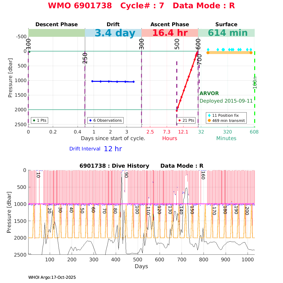 | WMO: #6901738 DAC: coriolis PI: Fabien DURAND ARVOR: # FLOATCLOCK: # KISTLER_2900PSIA: #2152963 SBE41CP_V2: #6381 Altimeter Comparison (IFREMER) EuroArgo Link | ![]() |