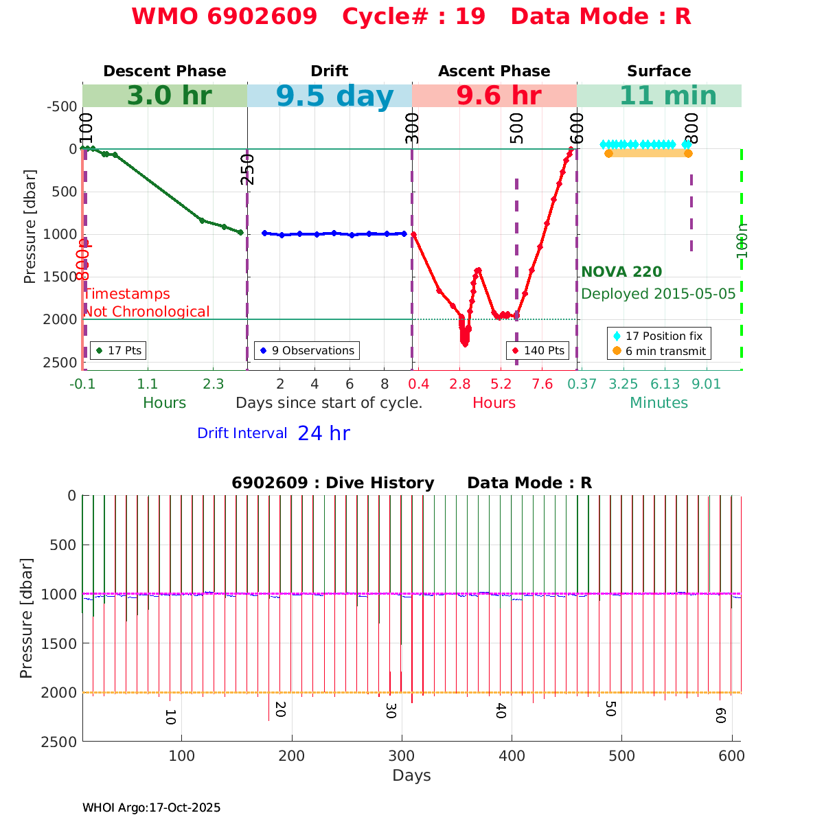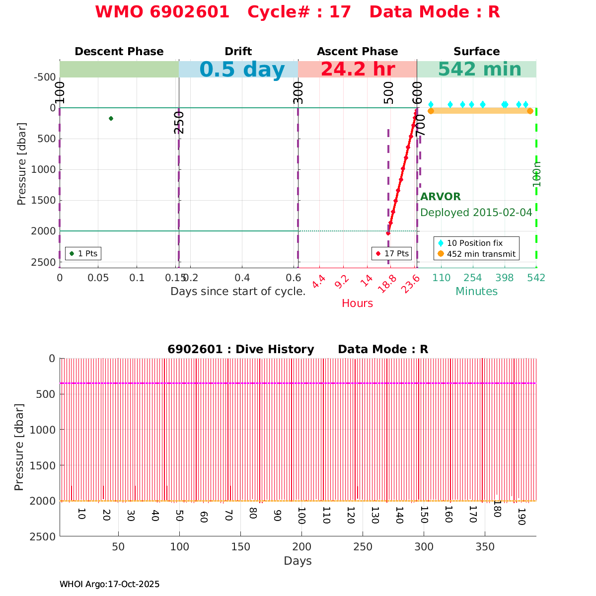 | WMO: #6902626 DAC: coriolis PI: Birgit KLEIN ARVOR: # FLOATCLOCK: # DRUCK_2900PSIA: #n/a SBE41CP_V2: #6380 Altimeter Comparison (IFREMER) EuroArgo Link | ![]() |