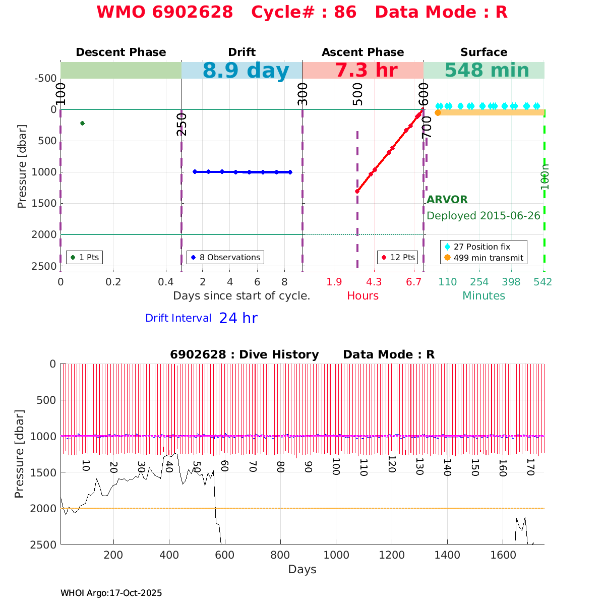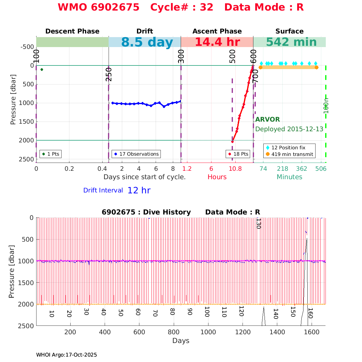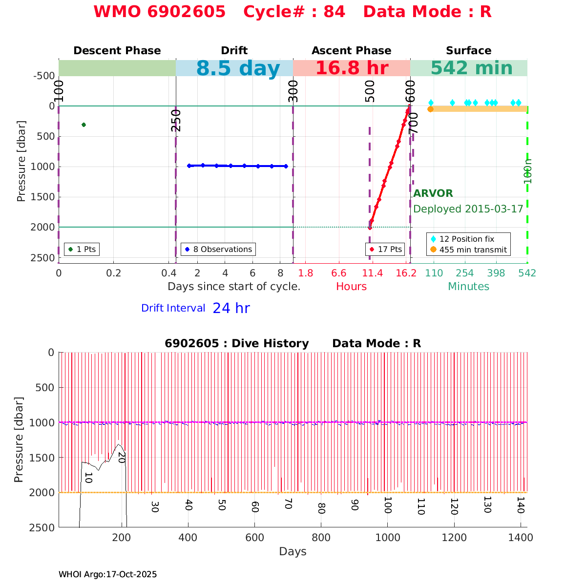 | WMO: #6902631 DAC: coriolis PI: Birgit KLEIN ARVOR: # FLOATCLOCK: # KISTLER: #4669412 SBE41CP_V2: #7348 Altimeter Comparison (IFREMER) EuroArgo Link | ![]() |