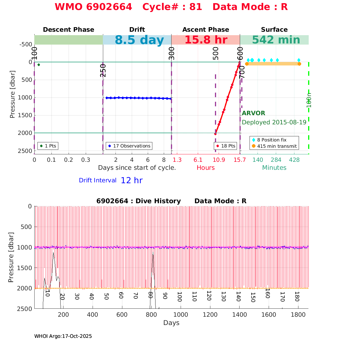 | WMO: #6902664 DAC: coriolis PI: Christine COATANOAN ARVOR: # FLOATCLOCK: # KISTLER_2900PSIA: #2151806 SBE41CP_V2: #6842 Altimeter Comparison (IFREMER) EuroArgo Link | ![]() |