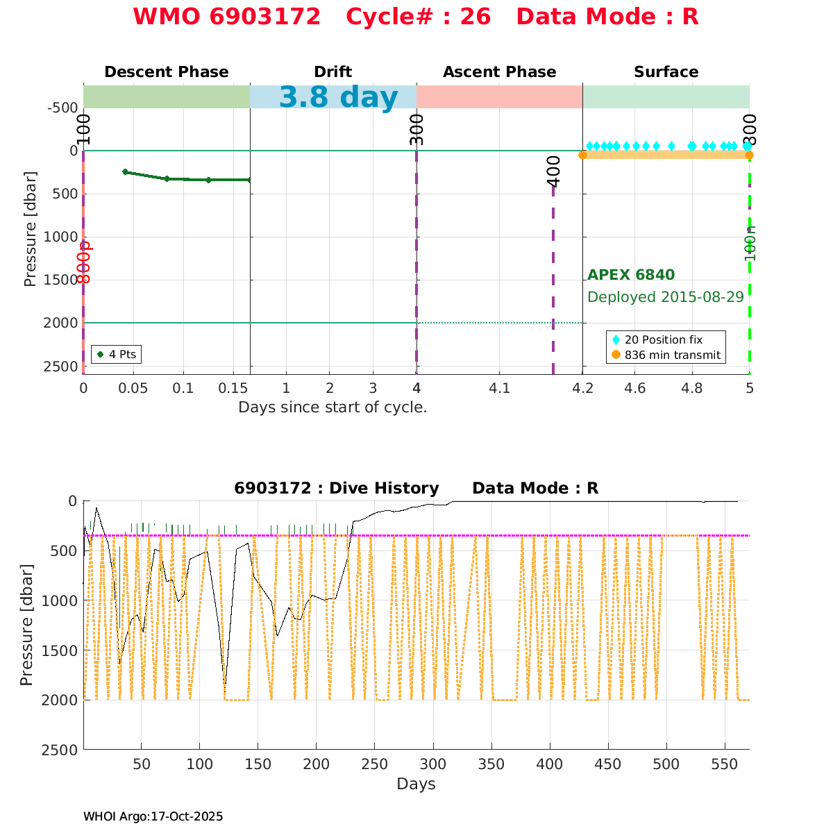 | WMO: #6903172 DAC: coriolis PI: Pierre-Marie POULAIN APEX: #6840 DRUCK_2900PSIA: #3847190 SBE41: #6304 Altimeter Comparison (IFREMER) EuroArgo Link | ![]() |