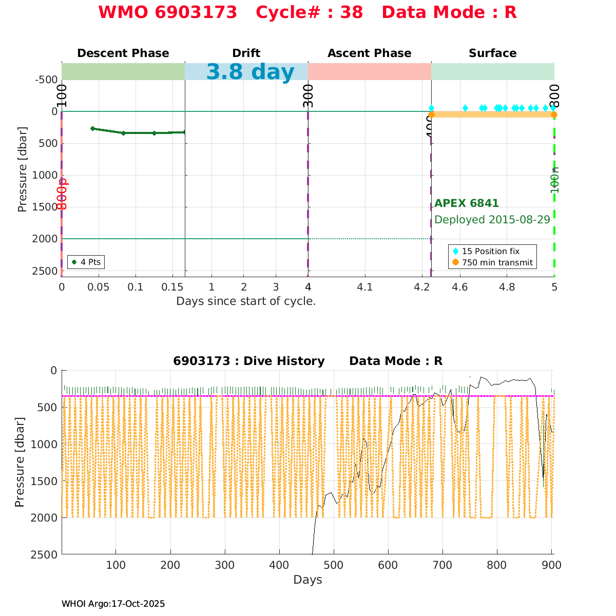 | WMO: #6903173 DAC: coriolis PI: Pierre-Marie POULAIN APEX: #6841 DRUCK_2900PSIA: #3815755 SBE41: #6302 Altimeter Comparison (IFREMER) EuroArgo Link | ![]() |
